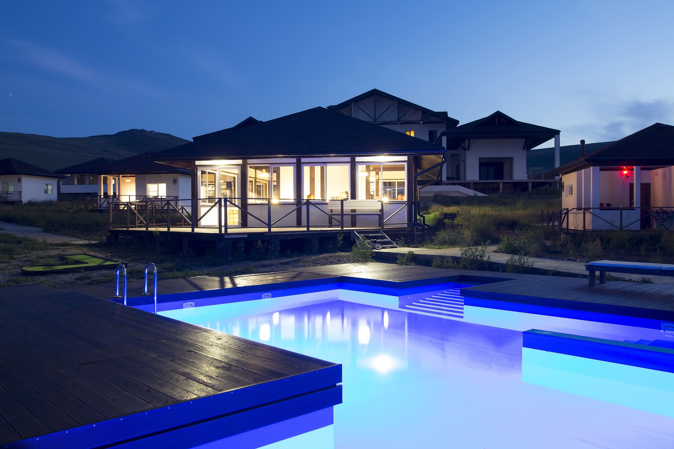 10 номеров, летнее кафе с баром, песчаный пляж в Бухте Ая (70 м), открытый бассейн (с детской зоной), баня, мангальная зона, тир, мини-гольф, аренда велосипедов, площадка для пляжного волейбола, водные прогулки на моторных лодках, детская площадка, сувенирный киоск, услуги прачечной, парковка. Завтраки, обеды и ужины сервируются в номере по меню a la carte. Предоставляется спортивное снаряжение: мячи, бадминтон, коврики для йоги, настольные игры.