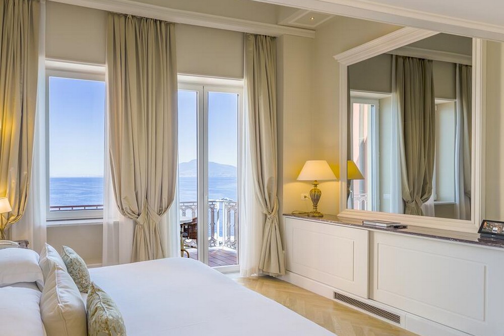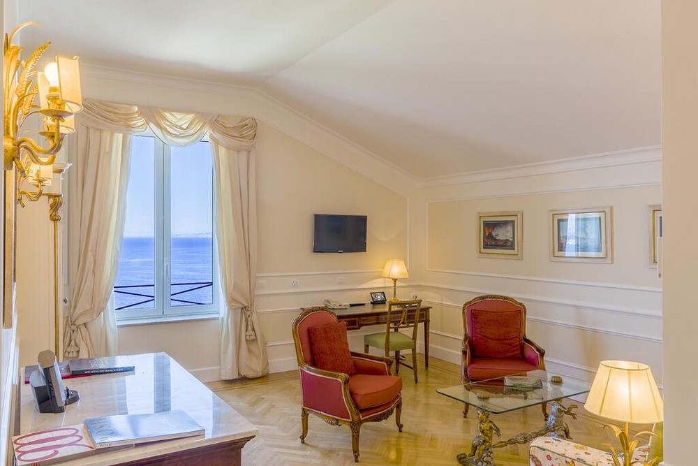 Premium deluxe sea view room (32 кв. м): терраса (30 кв. м), спальня с двуспальной или двумя отдельными кроватями, ванная комната с гидромассажным душем. Дополнительно: DVD/CD-плеер, док-станция для iPod. Вид на море и залив Сорренто.