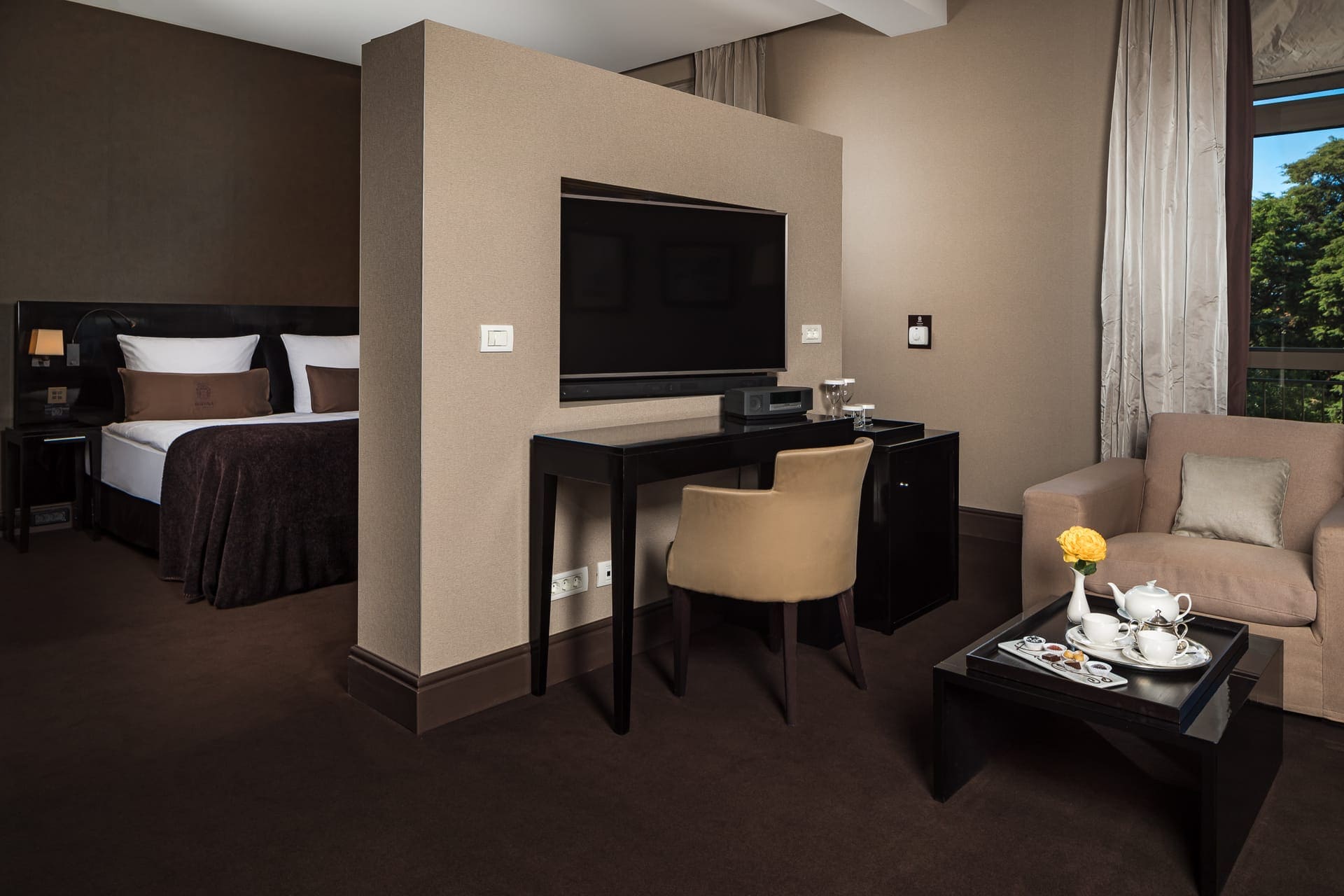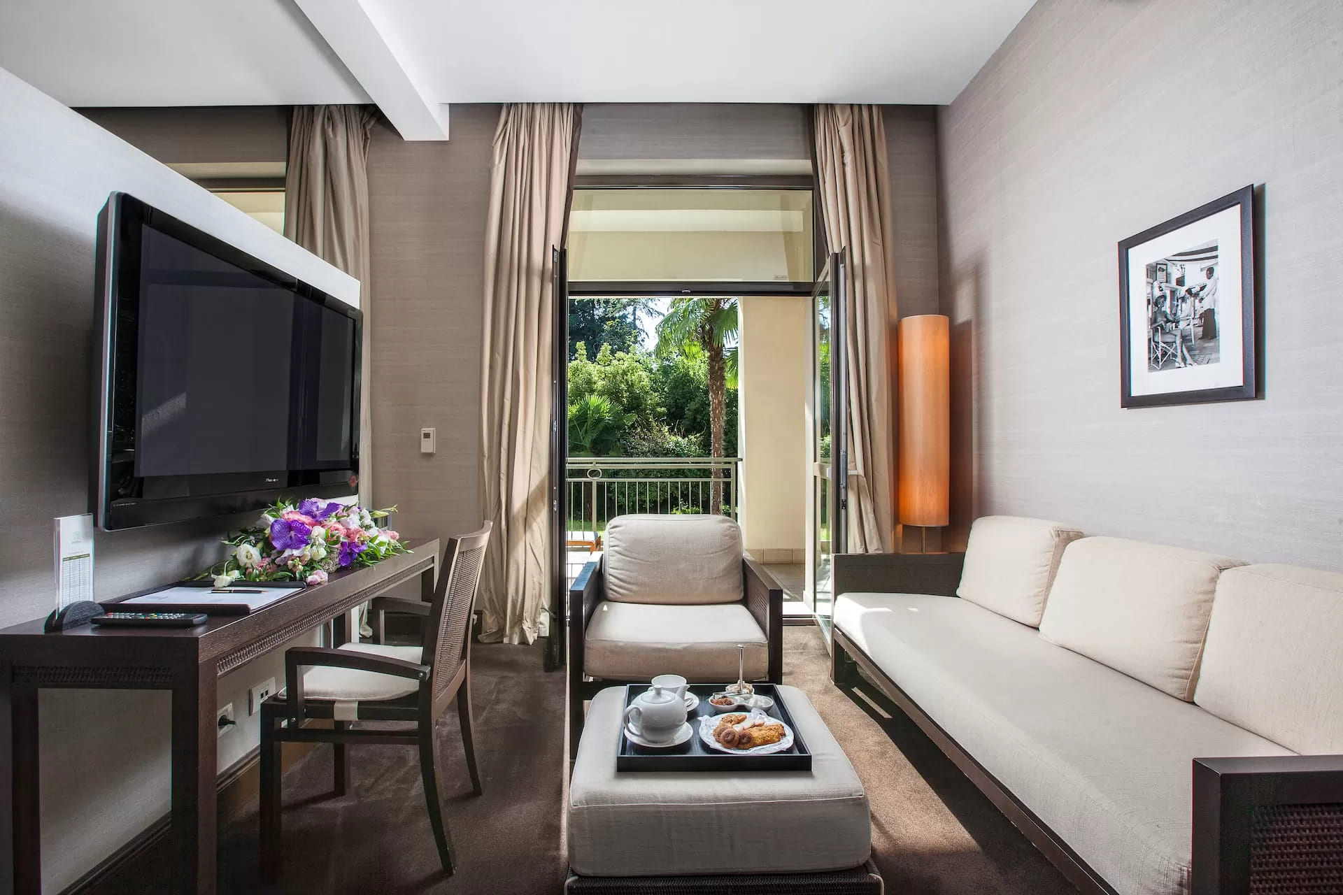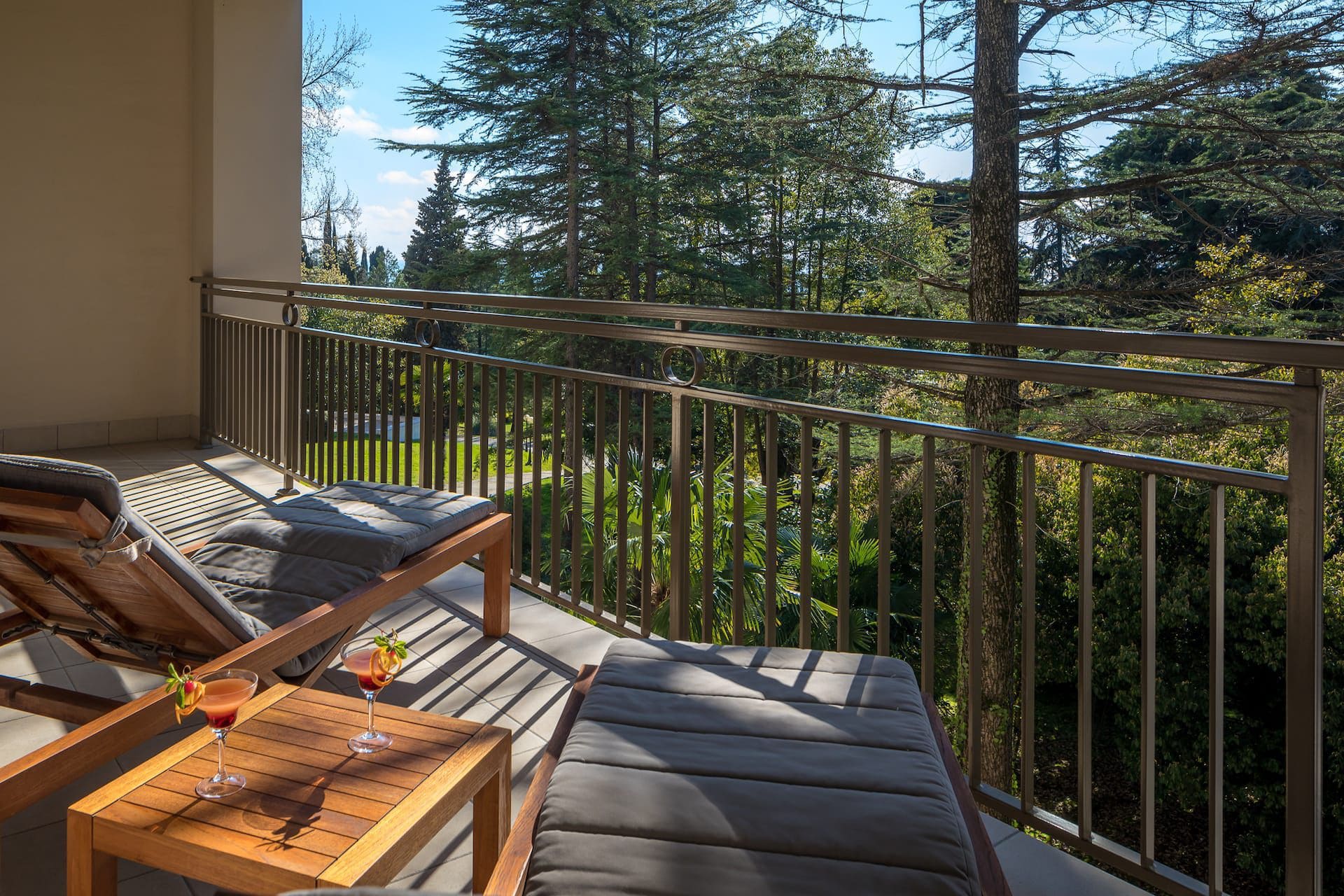 Deluxe garden view room (45 кв. м). Терраса, спальня с гостиной зоной (двуспальная кровать), ванная комната. Расположены на 1 и 2 этажах основного здания. Вид на парк.