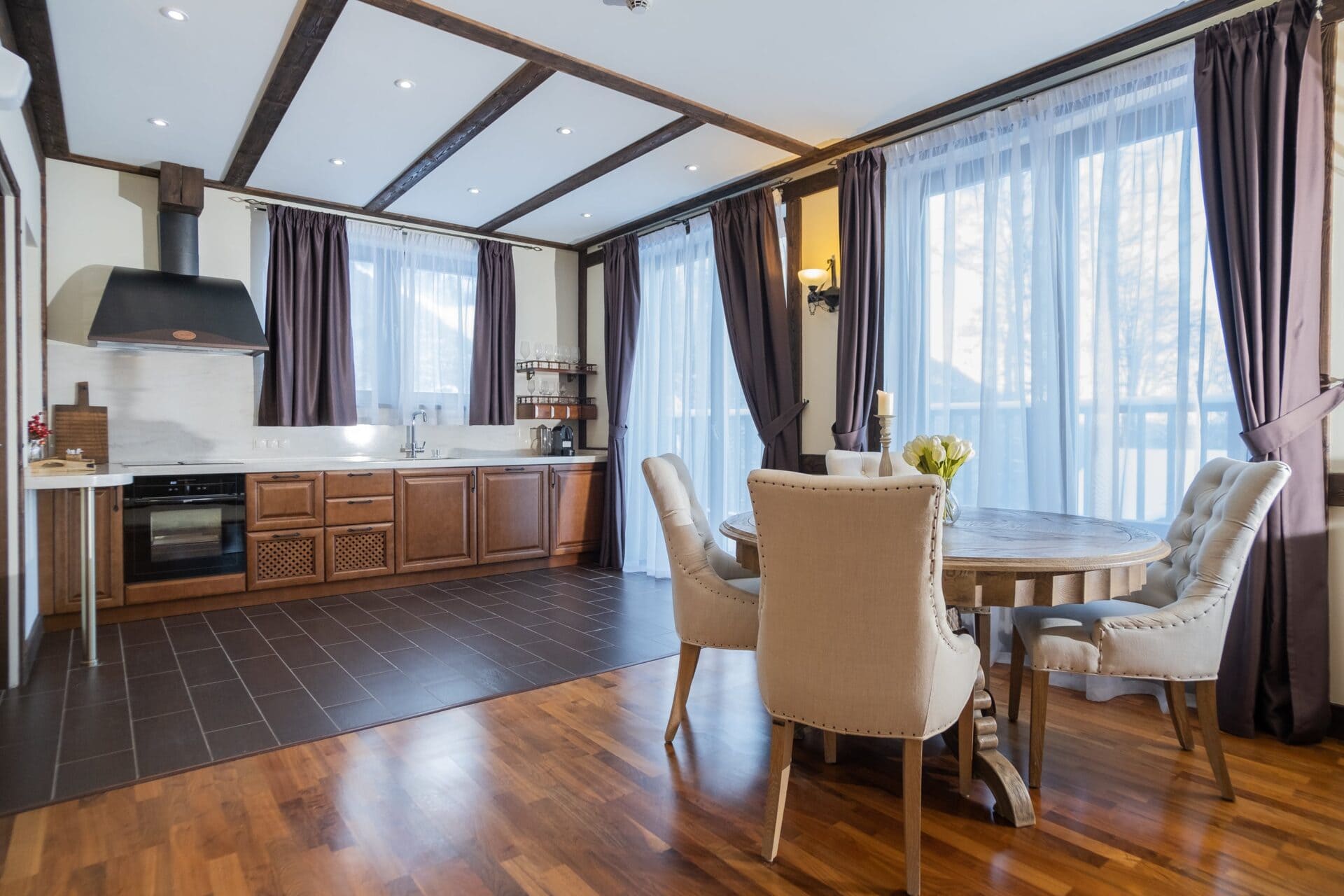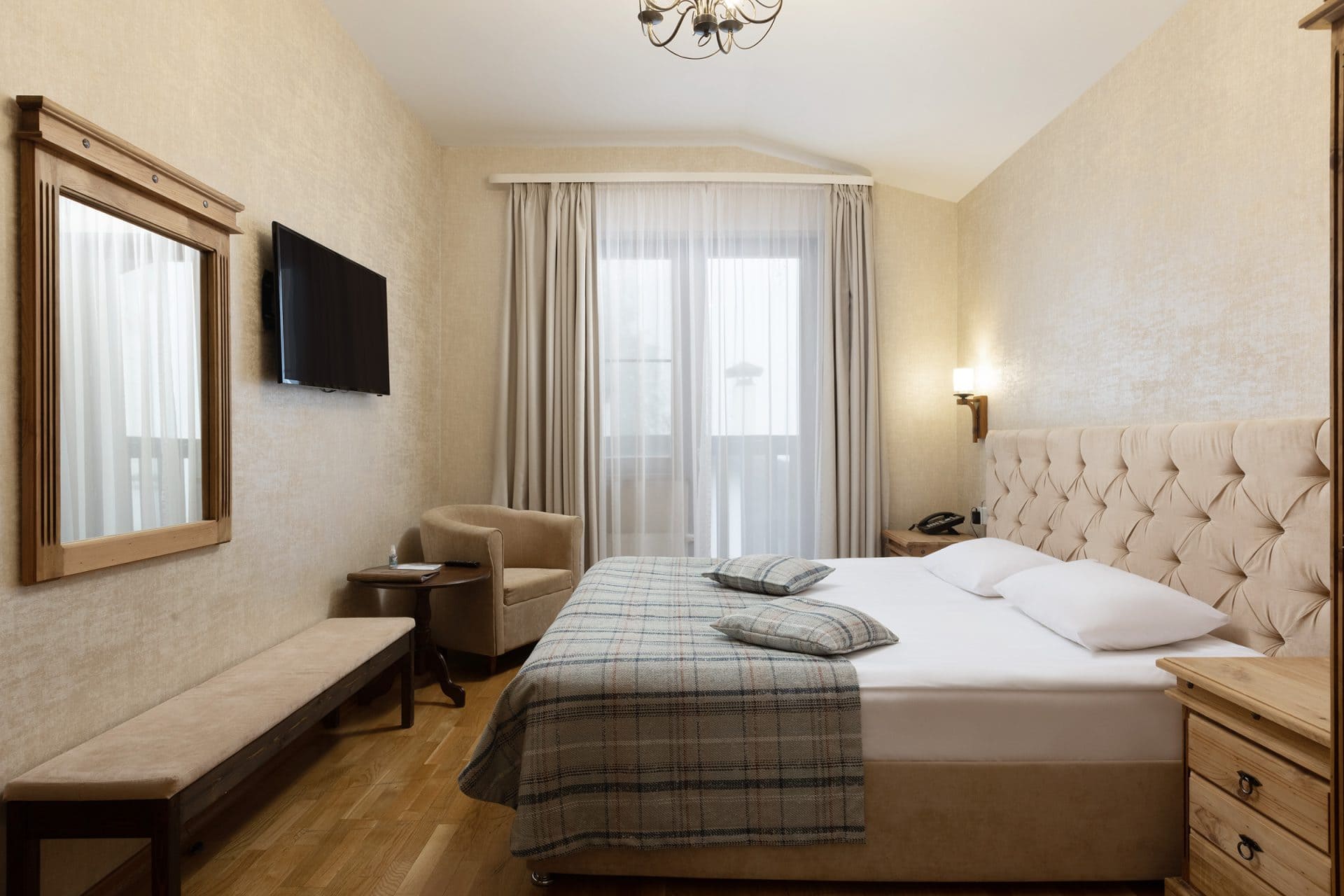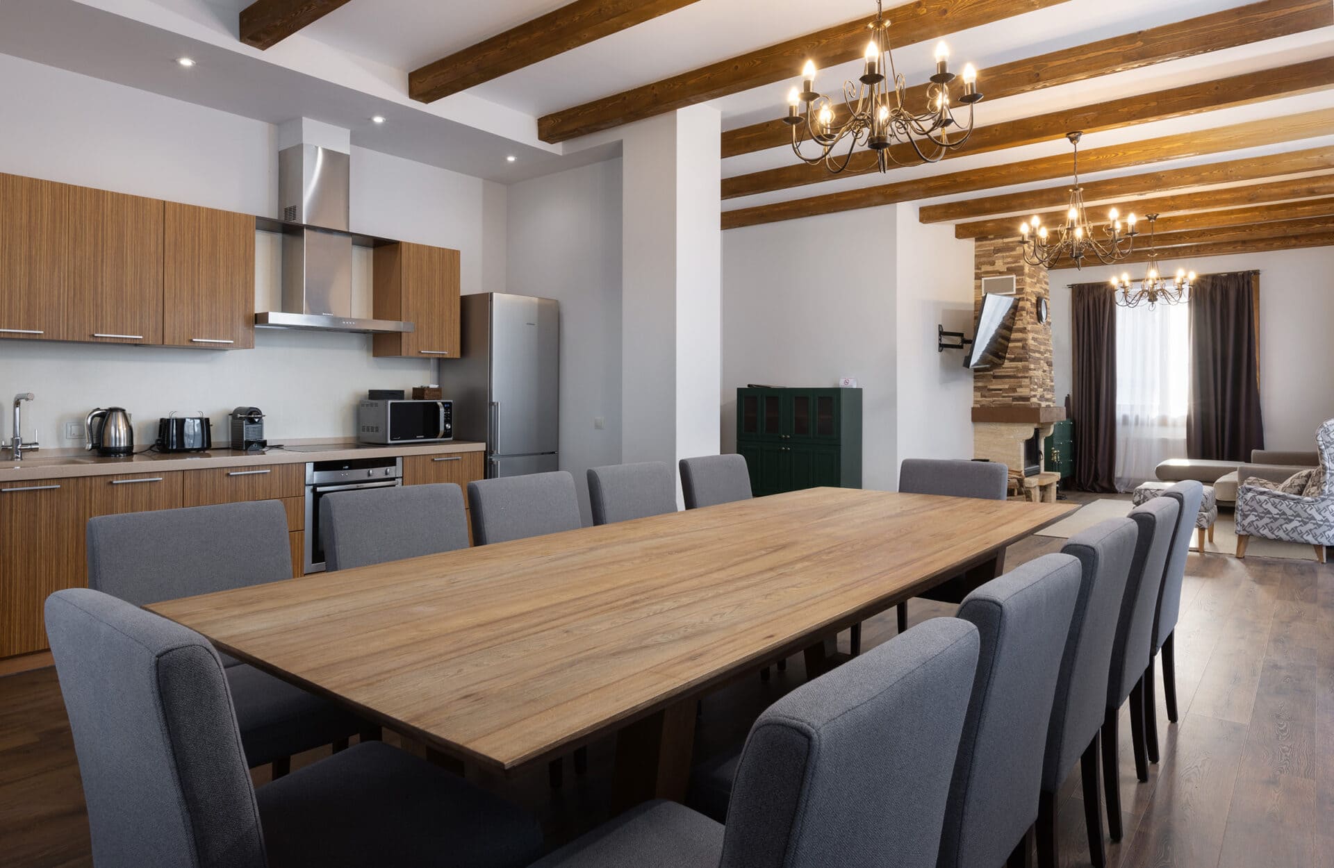В каждом шале: телевизор, Wi-Fi доступ в Интернет, камин, холодильник, электроплита, посудомоечная машина.