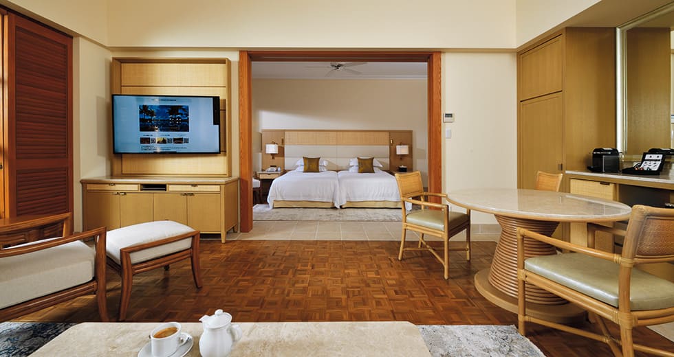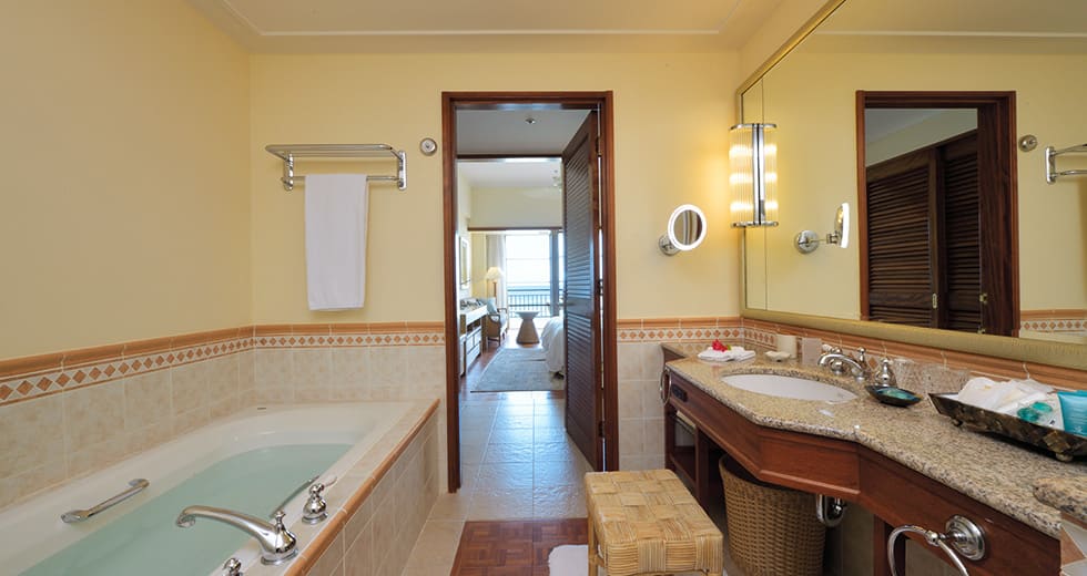 Deluxe elegant room (43 кв. м): терраса, прихожая, спальня с гостиной зоной, ванная комната с ванной и душевой кабиной. Расположены на 3, 6, 7 и 8 этаже башни North Tower и с 3 по 8 этаж башни South Tower. Вид на океан.
