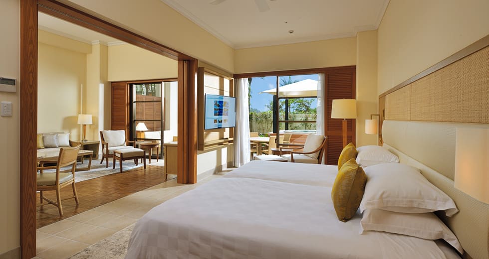 Presidential suite (123 кв. м): 2 террасы, гостиная с обеденной зоной и баром, спальня с двумя отдельными кроватями, гардеробная зона, ванная комната с ванной и душевой кабиной. Номер занимает отдельную виллу. Вид на закат. Гости данного номера имеют особые привилегии.