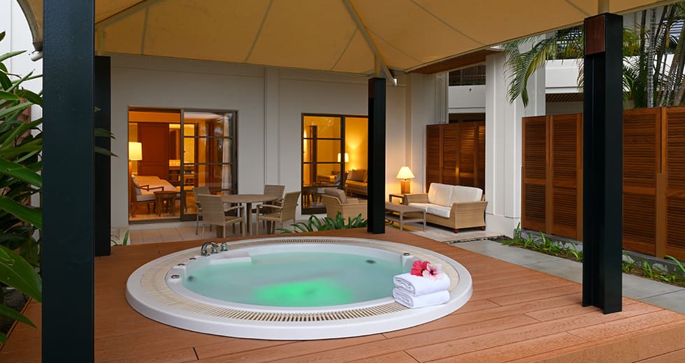 Gazebo terrace room (72 кв. м): частный сад с джакузи на открытом воздухе, терраса с обеденной зоной и душем на открытом воздухе, прихожая, спальня с гостиной зоной, гардеробная зона, 2 ванные комнаты. Дополнительно: халаты. Расположены на первом этаже башни North Tower.