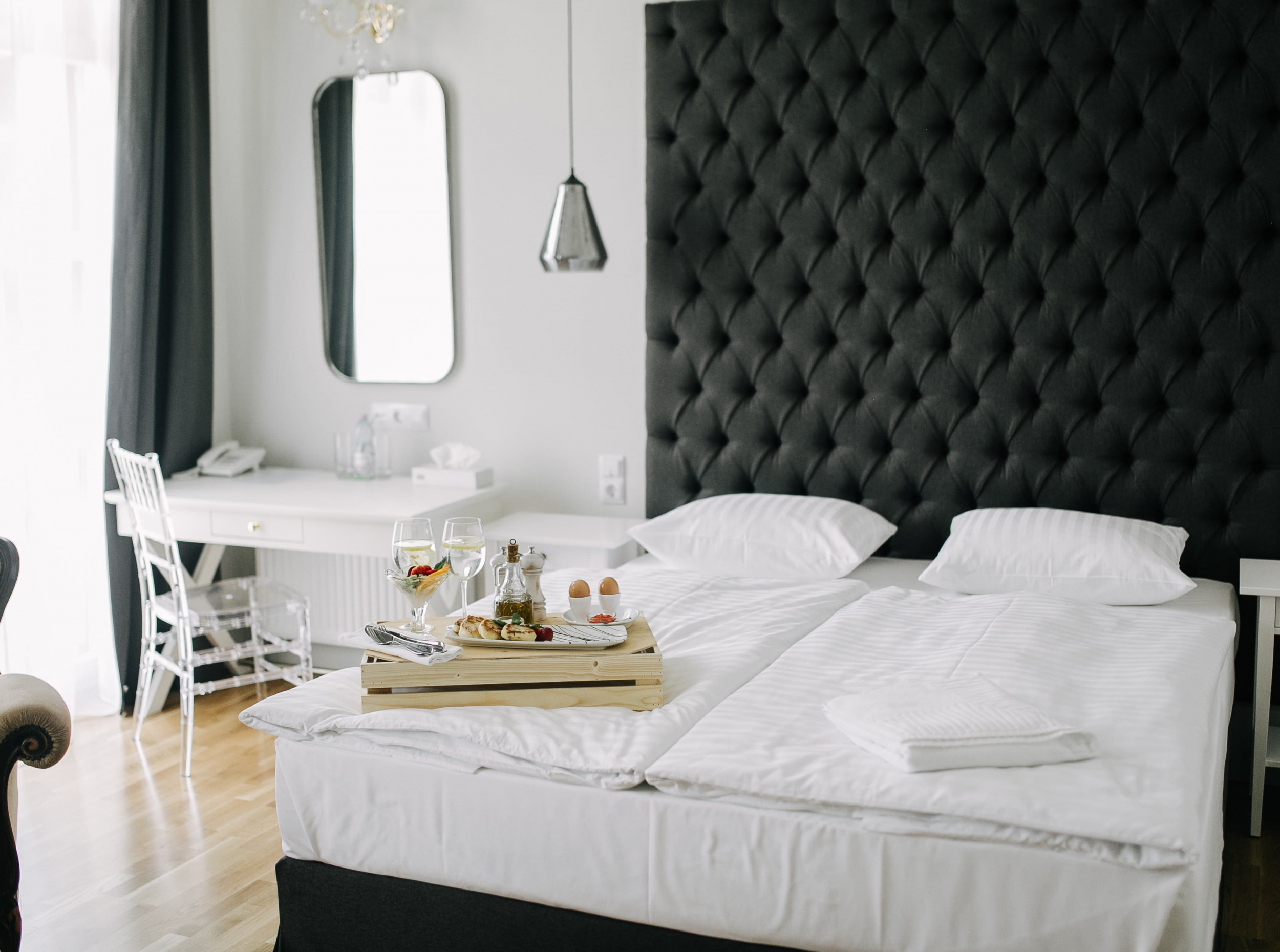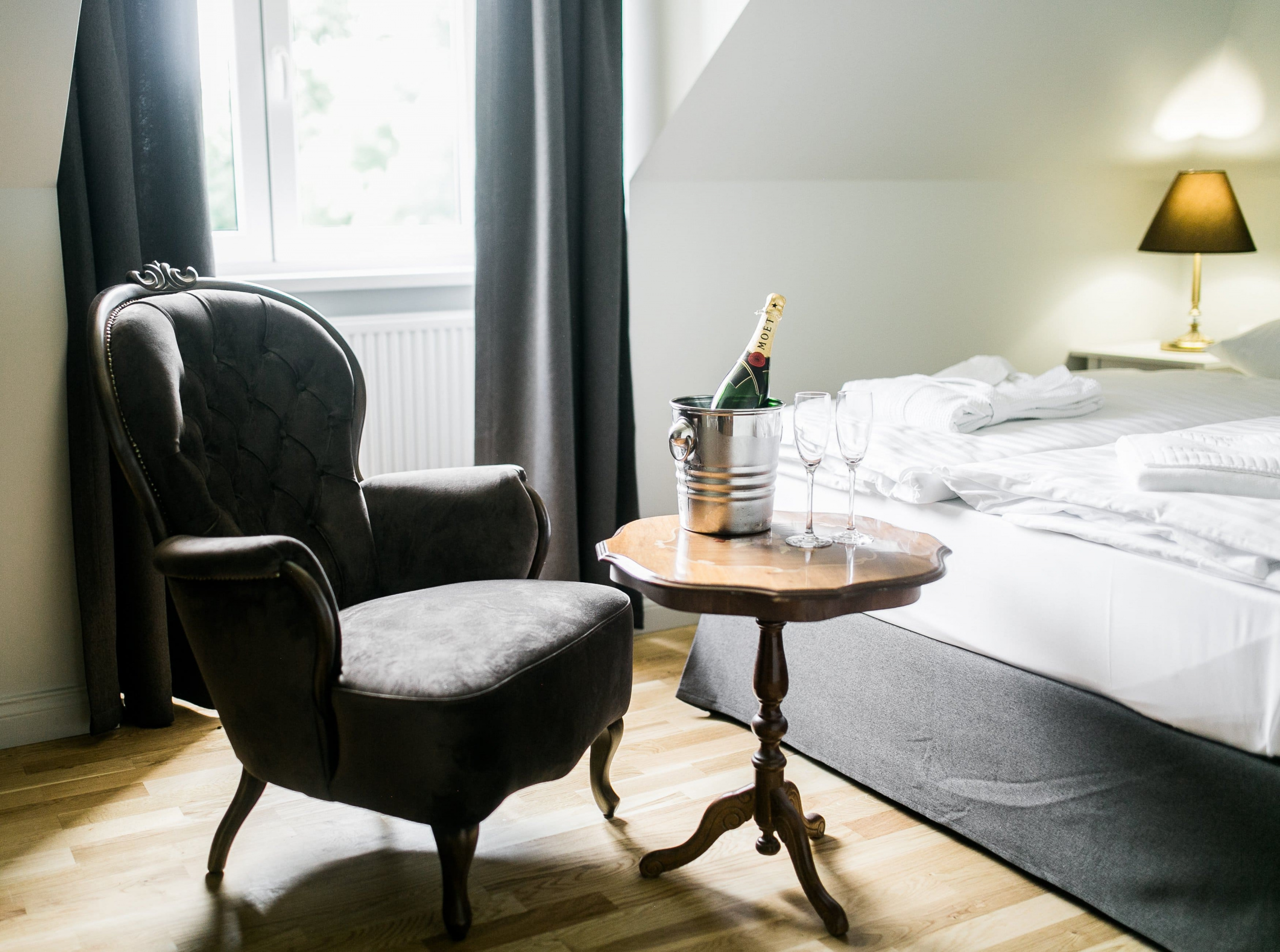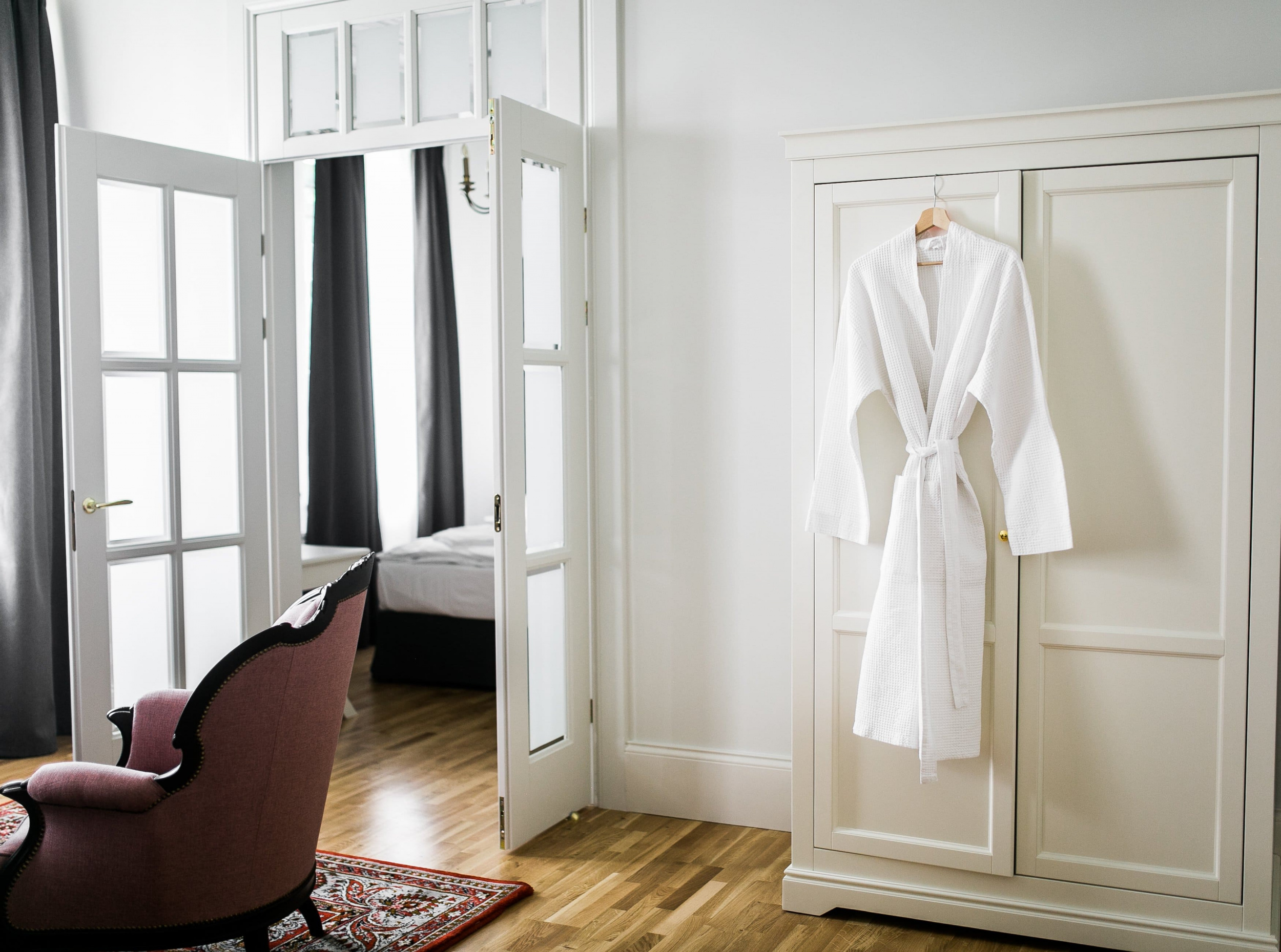 Классический номер, выполненный в уютном продуманном интерьере для двухместного размещения. В каждом номере имеется спальная зона с удобной двуспальной кроватью, рабочая зона с функциональным рабочим столом и чайным набором, ванная комната с душем или расслабляющей ванной. Мебель выполнена из натурального дерева. В номере: столик с двумя креслами, настенное зеркало, шкаф, письменный столик и светильники, телевизор с плоским экраном, мини-холодильник, чайник, кофемашина, кондиционер, телефон с международным и междугородным доступом. Возможность бесплатного подключения к Интернету. Для удобства гостей предоставляются халаты и тапочки. Из окон номера приятный вид на яблоневый сад или в уютный внутренний дворик отеля. Для гостей, ищущих уединения в особенной романтической атмосфере, как нельзя лучше подойдут номера в уединенном Особняке у озера нашего комплекса.