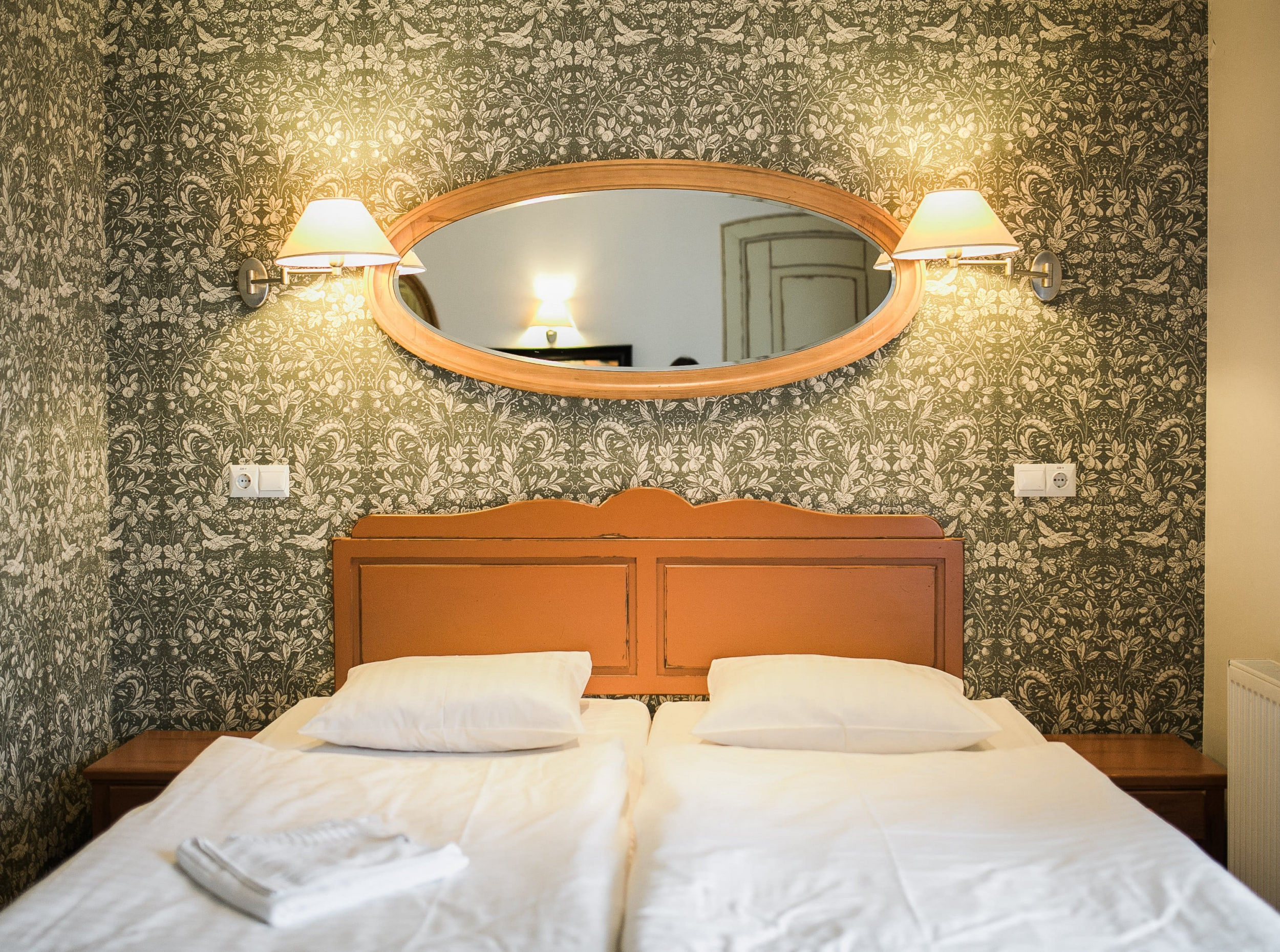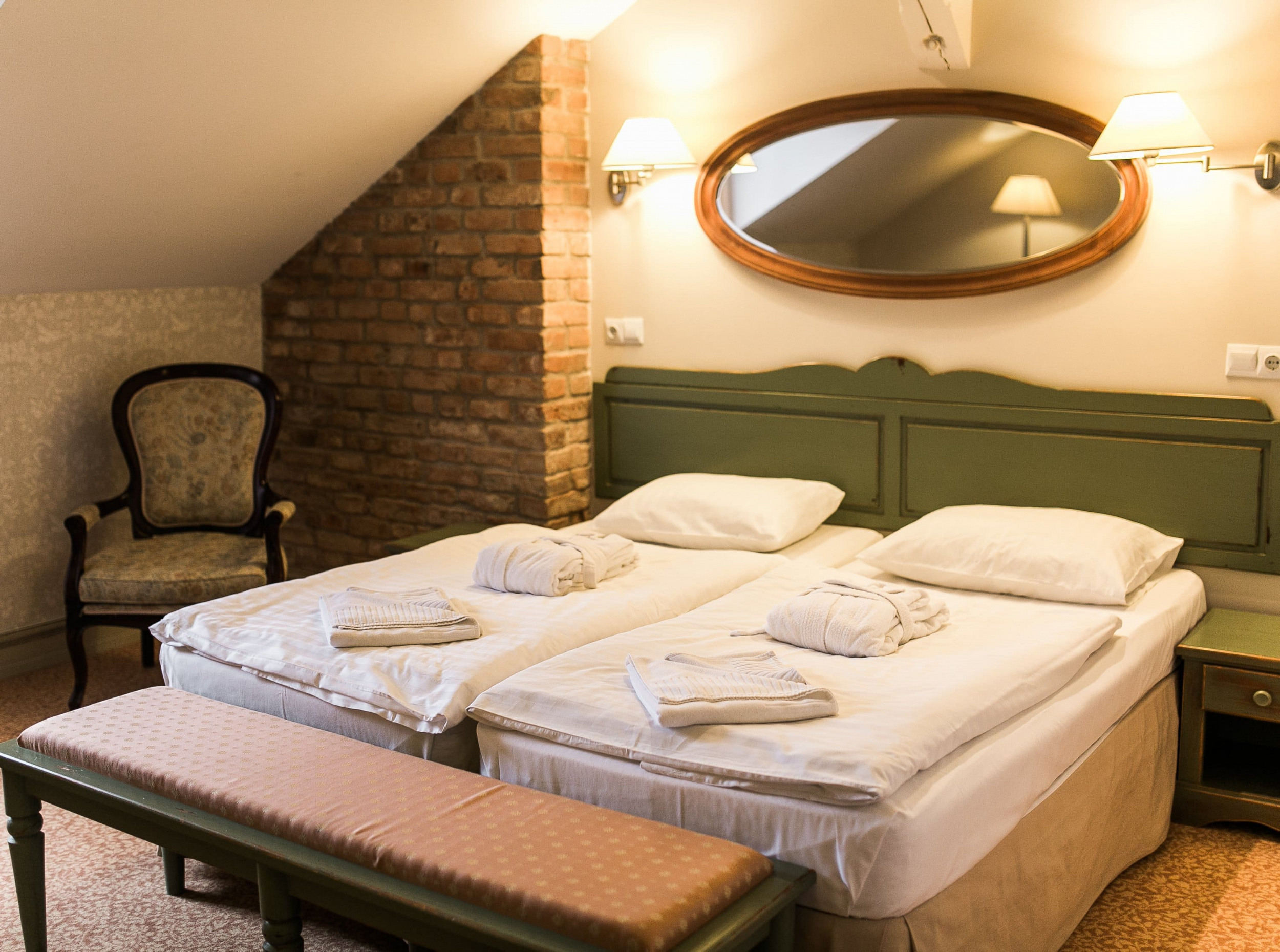 Стандартный двухместный улучшенный (мансарда) (22 м.кв.): Стандартный, улучшенный номер гостиницы «Усадьба» – это однокомнатный номер с ванной комнатой. Вся мебель выполнена из натурального дерева. В номере: две односпальные кровати, столик с двумя креслами, настенное зеркало, встроенный шкаф, письменный столик и светильники, телевизор, холодильник и мини-бар, телефон с международным и междугородным доступом. возможность бесплатного подключения к Интернету. Находится на верхнем этаже здания гостиницы. Уютный, светлый и очень комфортный. Большинство улучшенных номеров выходят окнами в парк и идеально подходят гостям, которые предпочитают тишину и уют.