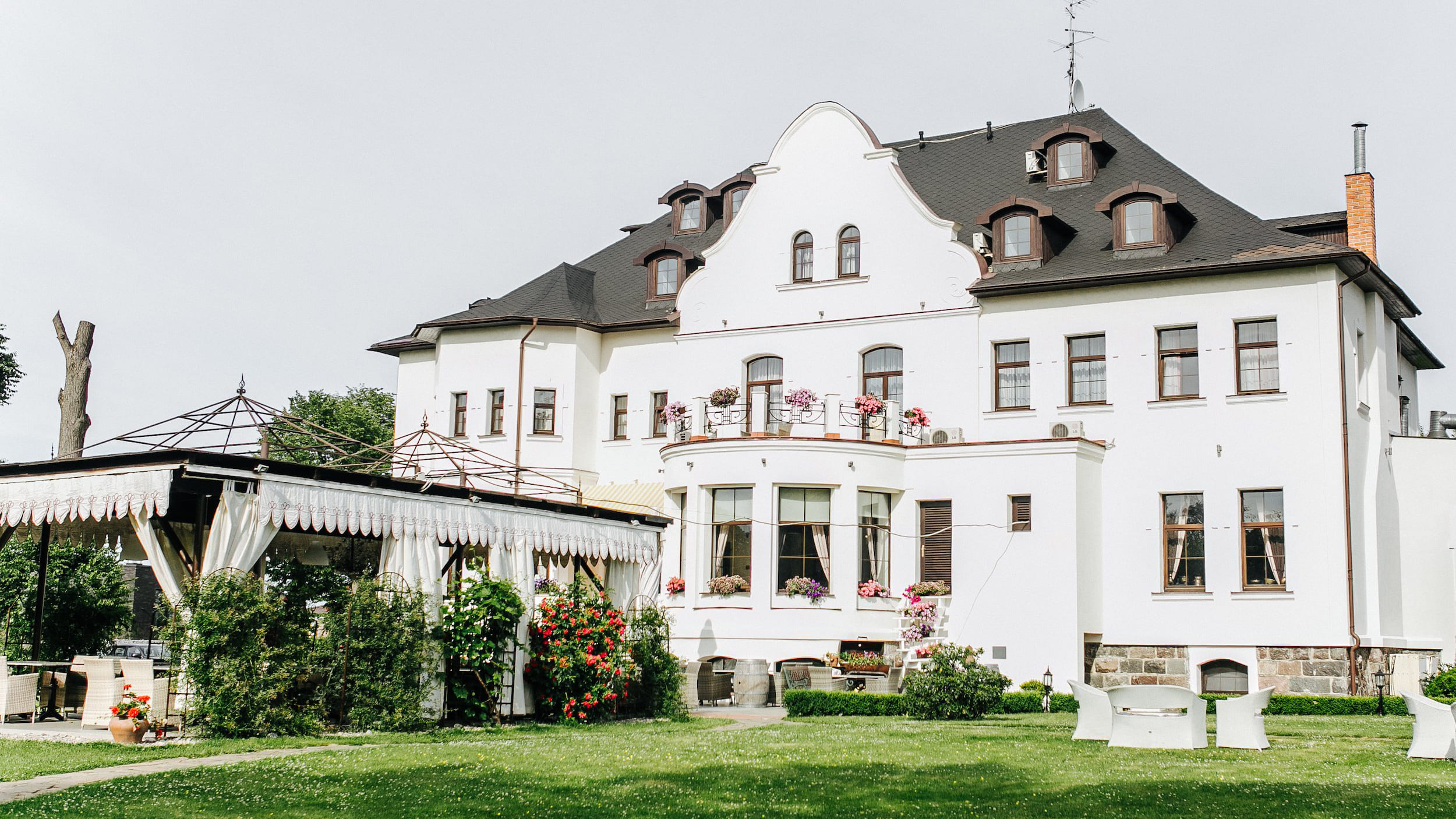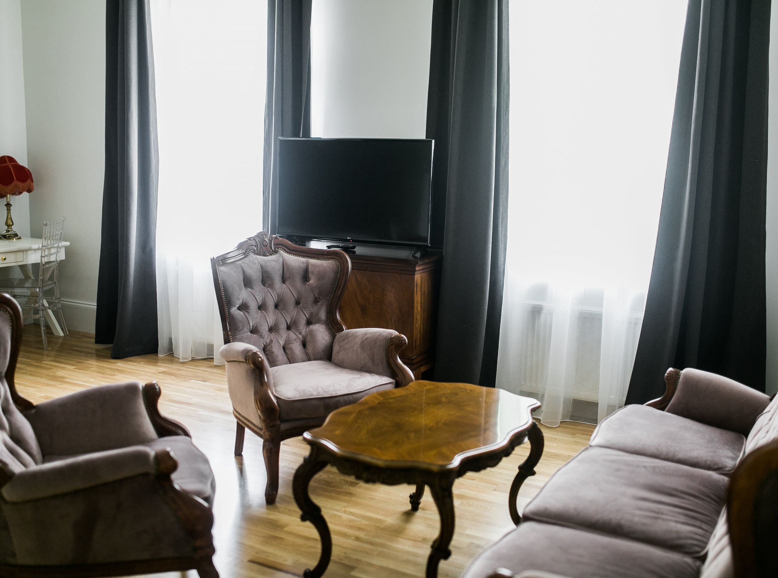 Люкс "Особняк у озера" (50 м.кв.): Отель располагает 2 элегантными номерами категории Люкс для размещения 1-го или 2-х человек. Максимальная вместимость до 3-х гостей: 2 на основных местах + 1 на дополнительном месте. Номер разделён на две зоны: гостиную и спальню. Роскошный, просторный номер, выполненный в элегантном интерьере для исключительно комфортного двухместного размещения. В каждом номере имеется спальная зона с удобной двуспальной кроватью, рабочая зона с функциональным столом, чайным набором и кофе-машиной, гостиная зона с диваном, просторная ванная комната с бодрящим тропическим душем или расслабляющей ванной, мини-холодильник, телефон с международным и междугородным доступом. Возможность бесплатного подключения к Интернету. Для удобства гостей предоставляются халаты и тапочки. Особый шарм номеру придает дизайнерская инсталляция, разделяющая его на гостиную и спальную зоны. Уникальной особенностью является два гардеробных шкафа и большое зеркальное полотно в пол, что, несомненно, порадует прекрасных модниц. Вся мебель выполнена из натурального дерева. Есть комната для приема гостей. Номера данной категории с видом на геометрический парк в стиле Versaeilles.