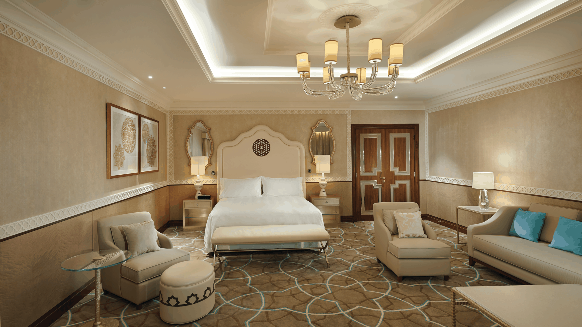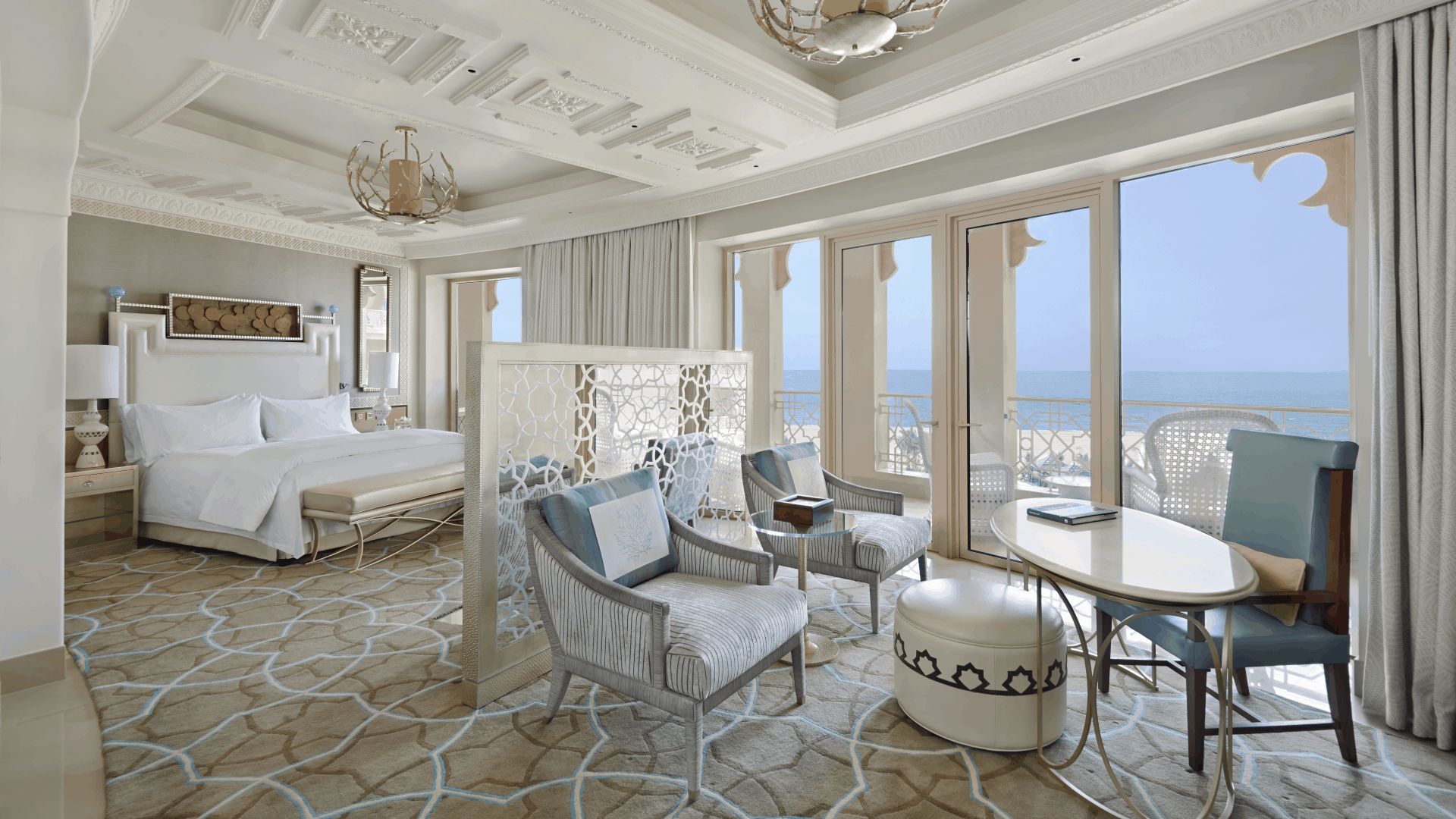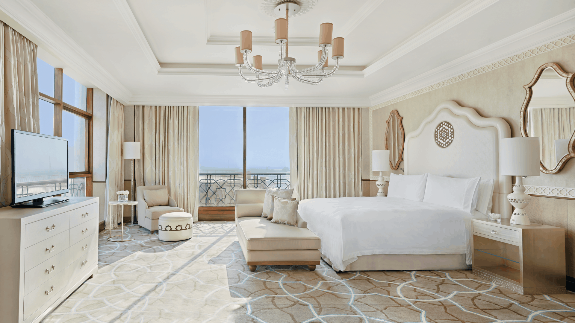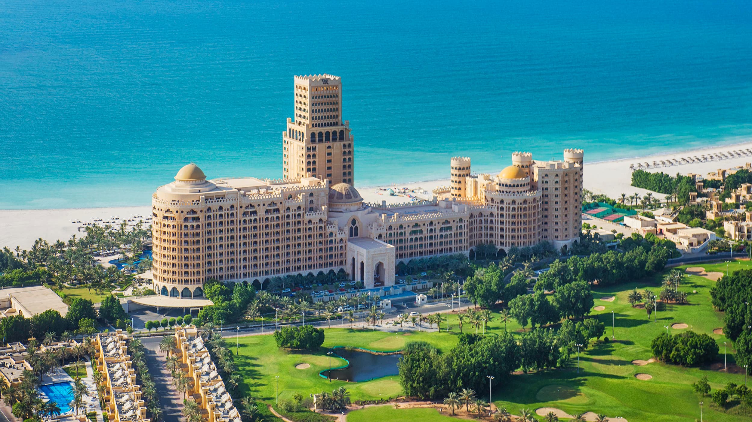 Отель Waldorf Astoria Ras Al Khaimah оформлен в стиле дворцов Аравийского полуострова. Он расположен на пляже, всего в 50 минутах езды от международного аэропорта Дубая. К услугам гостей роскошный спа-салон, 18-луночное турнирное поле для гольфа и частный пляж протяженностью 350 метров вдоль побережья Аравийского моря.