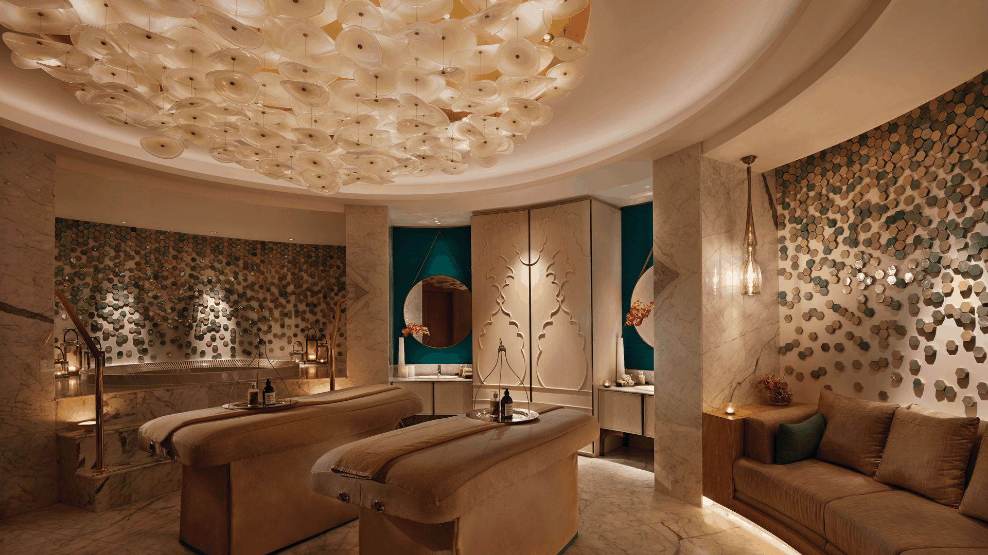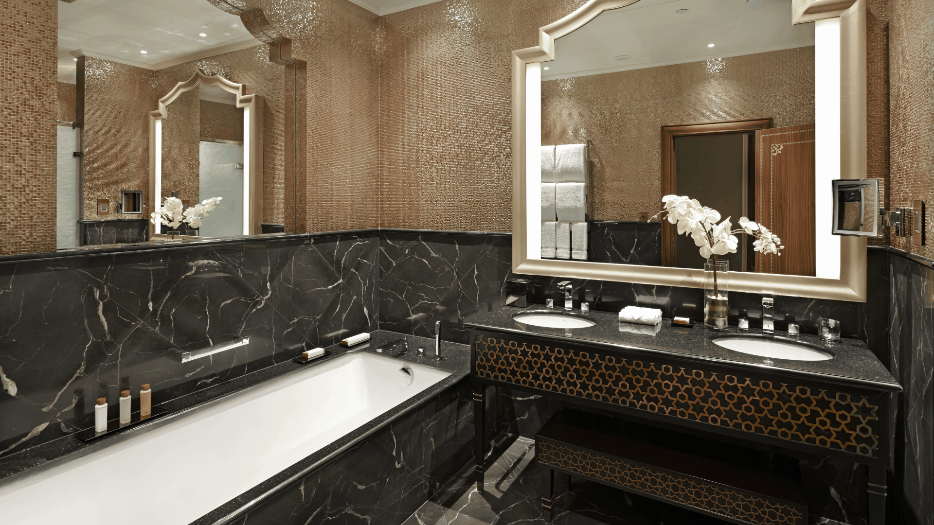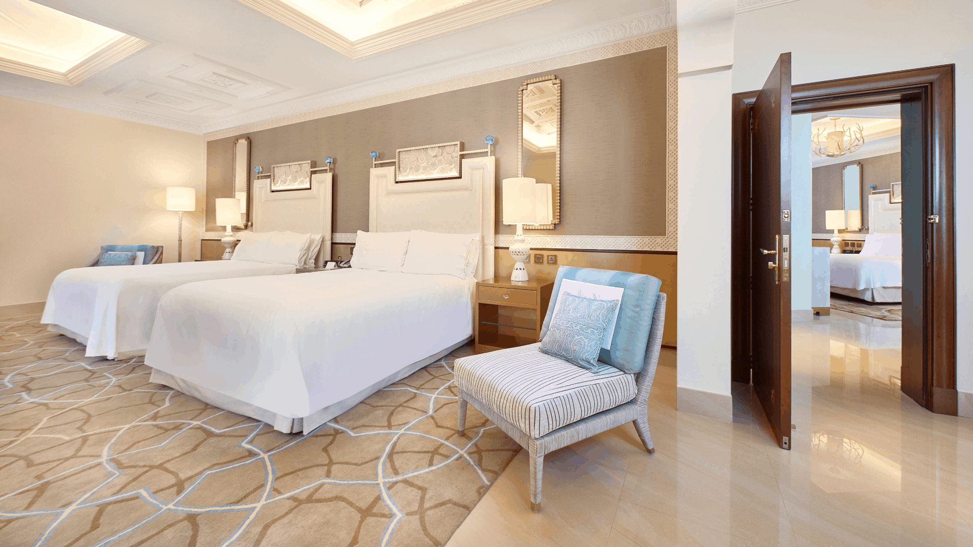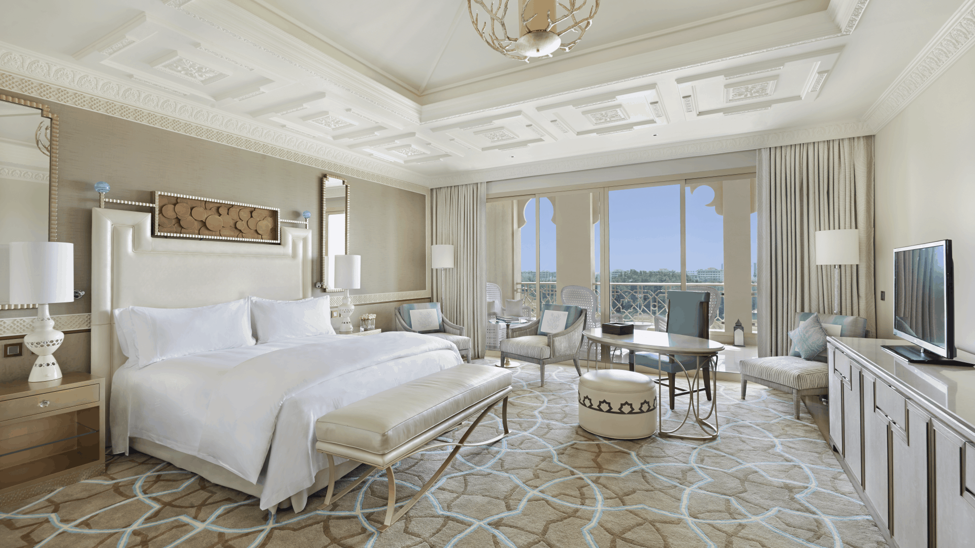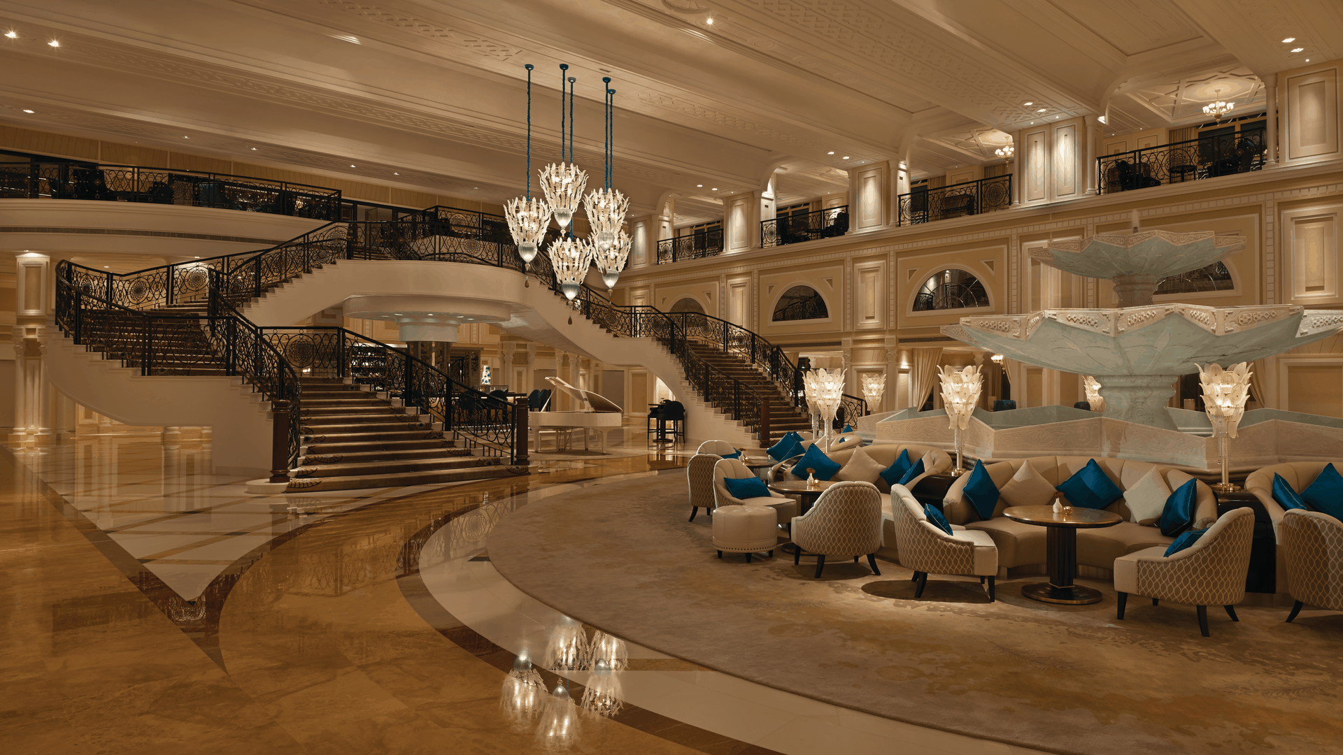 Отель Waldorf Astoria Ras Al Khaimah оформлен в стиле дворцов Аравийского полуострова. Он расположен на пляже, всего в 50 минутах езды от международного аэропорта Дубая. К услугам гостей роскошный спа-салон, 18-луночное турнирное поле для гольфа и частный пляж протяженностью 350 метров вдоль побережья Аравийского моря.