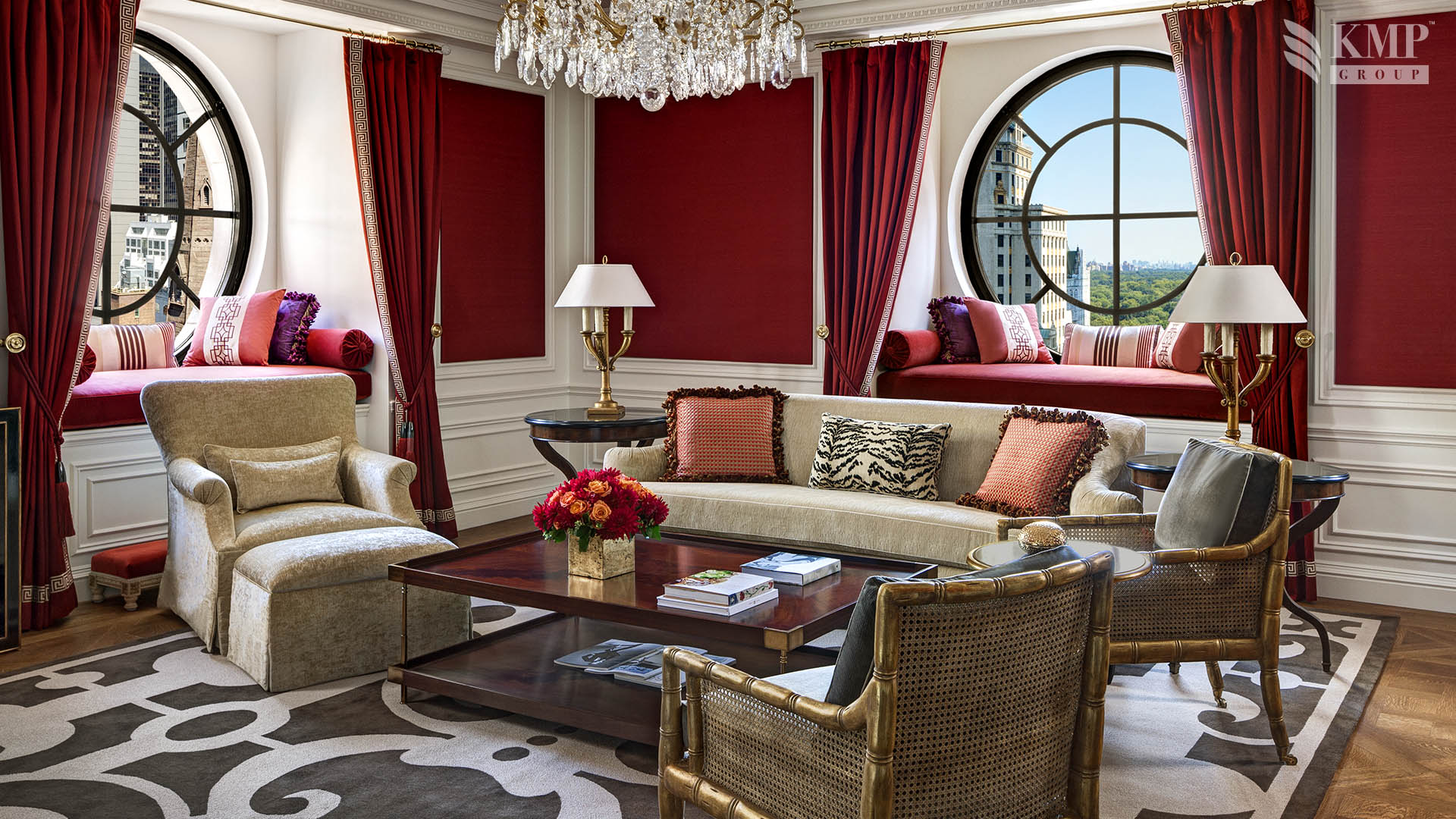 Royal suite (153 кв. м): прихожая, гостиная, столовая с обеденным столом на 8 персон, кухня, 2 спальни с кроватями "king-size", гардеробная, 2 ванные комнаты (каждая с ванной и душевой кабиной), гостевой туалет. Дополнительно: факс, декоративный камин. Возможно присоединение дополнительной спальни с ванной комнатой (общая площадь номера с тремя спальнями - 270 кв. м). Вид на центральный парк, Пятую авеню и 55-ю улицу.