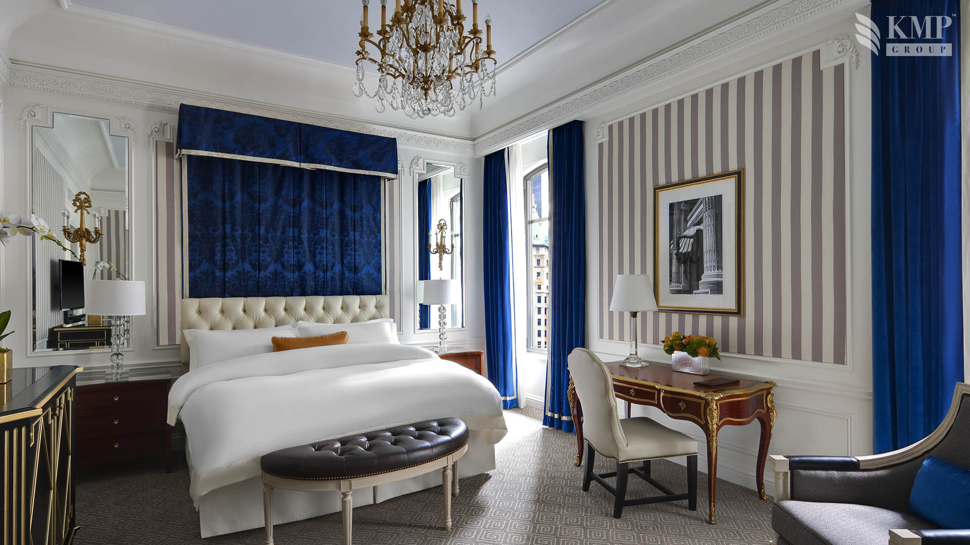 Grand suite (125 кв. м): прихожая, гостиная, спальня с кроватью "king-size", гардеробная, ванная комната с ванной и душевой кабиной, гостевой туалет. Дополнительно: факс, декоративный камин. Возможно присоединение дополнительной спальни с ванной комнатой (общая площадь номера с двумя спальнями - 160 кв. м). Вид на Пятую авеню.