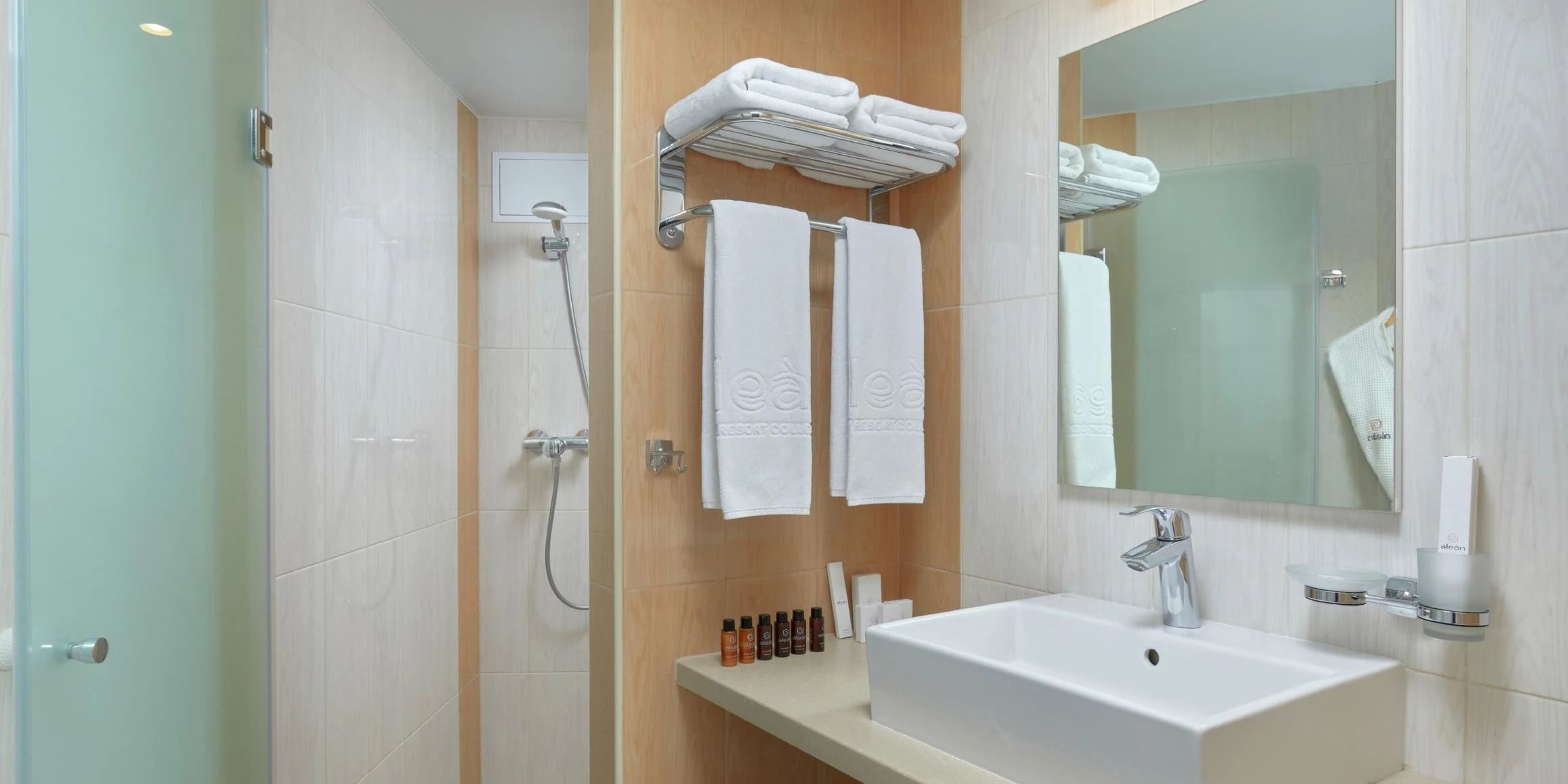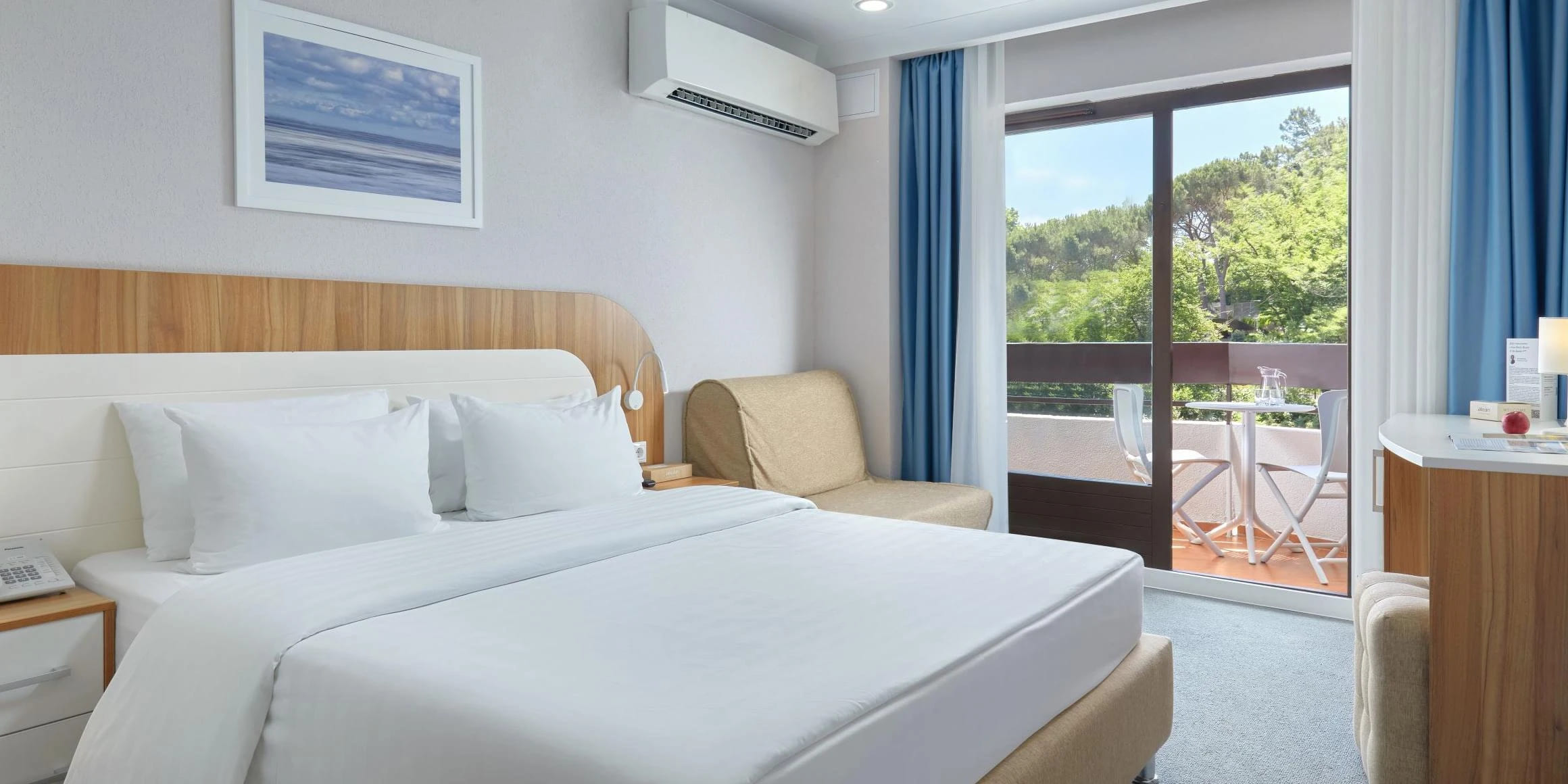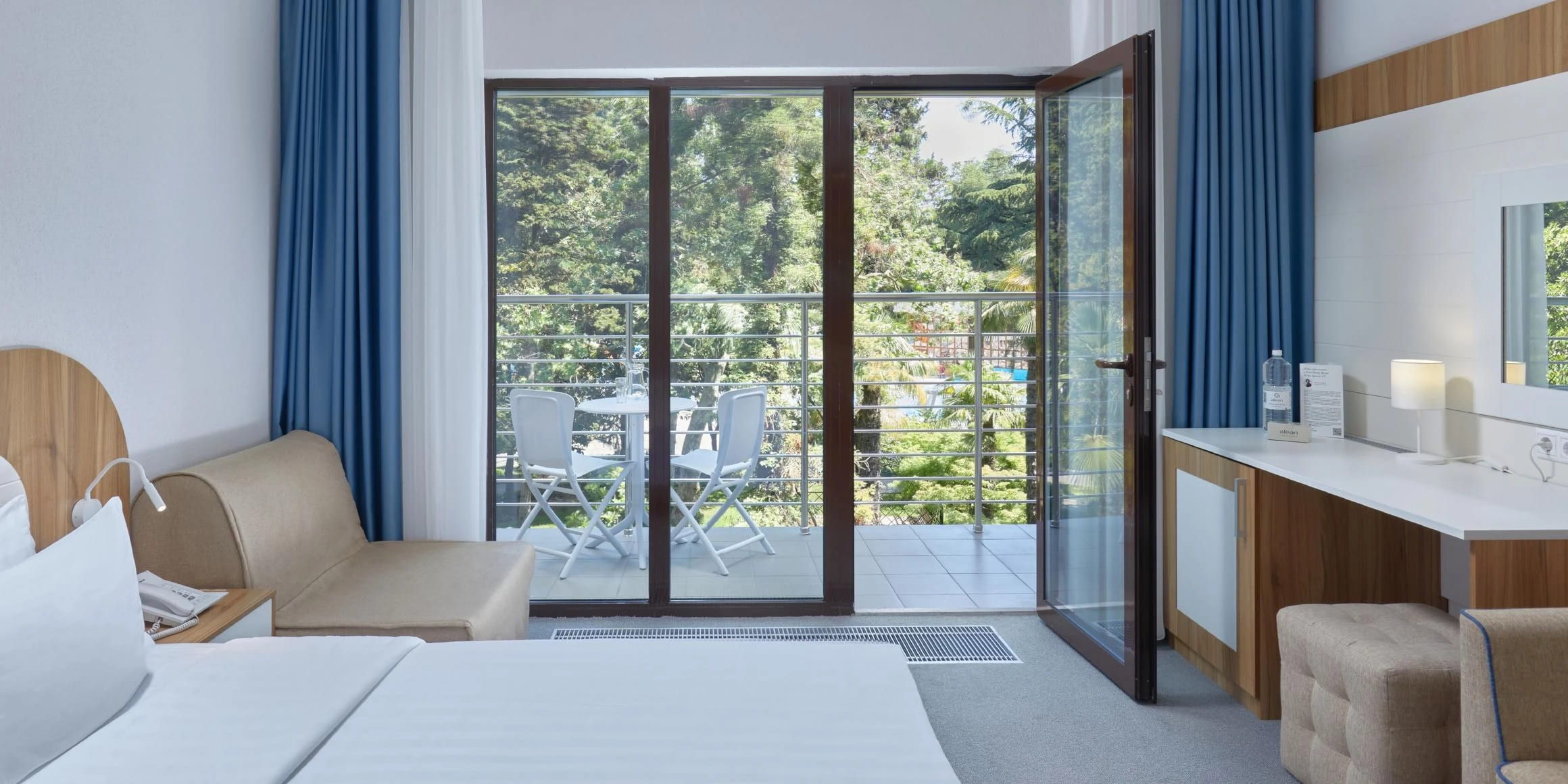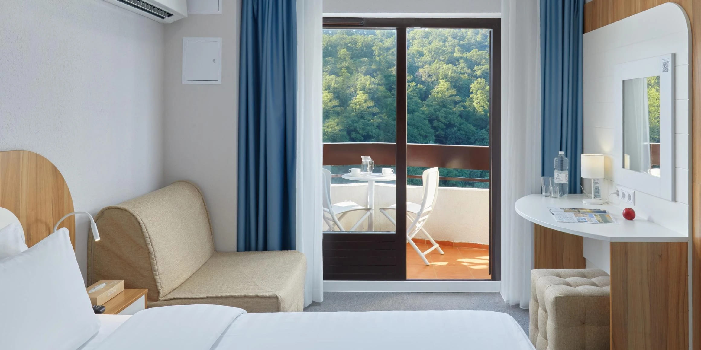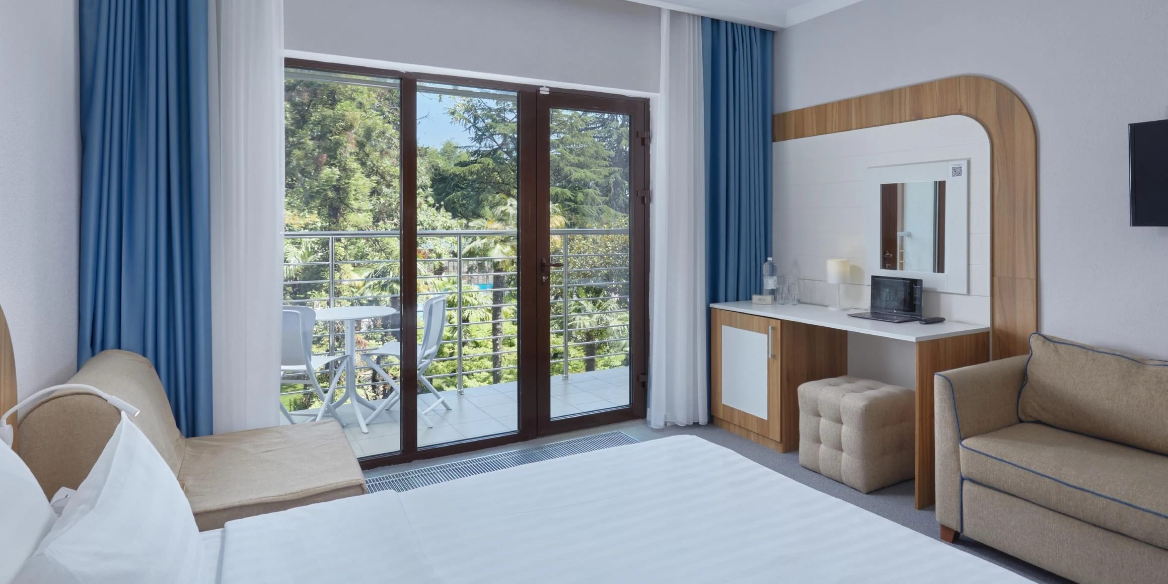 Стандарт 2-местный 1-комнатный 18 кв.м (1 доп. место). Двуспальная кровать, прикроватные тумбы, кресло-кровать, стол, стул, настольная лампа, телевизор 32 дюйма, шкаф-купе, зеркало, внутренний телефон, сплит-система, багажная полка, мини-сейф, мини-холодильник, гладильная доска и утюг. На балконе два стула и стол, сушилка для белья. Санузел: душевая кабина, зеркало, зеркало косметическое, фен, весы, диспенсер с гигиеническими пакетами, диспенсер с жидким мылом, детская подставка для ног, детское сиденье на унитаз, комплект полотенец, халат, тапочки, набор гостиничной косметики.