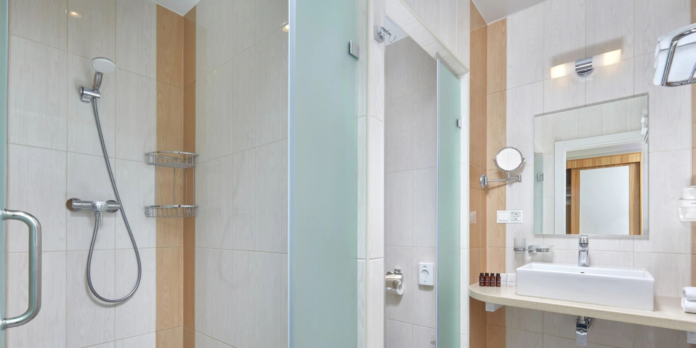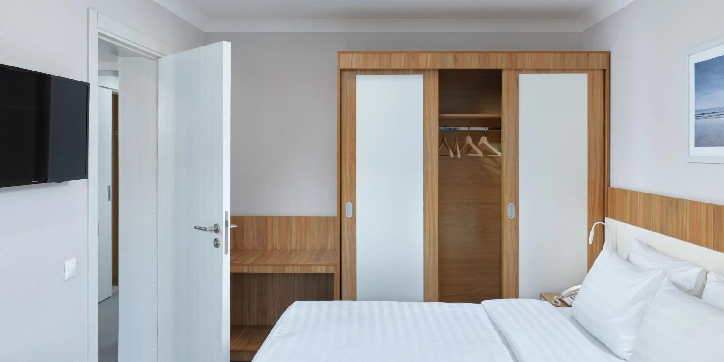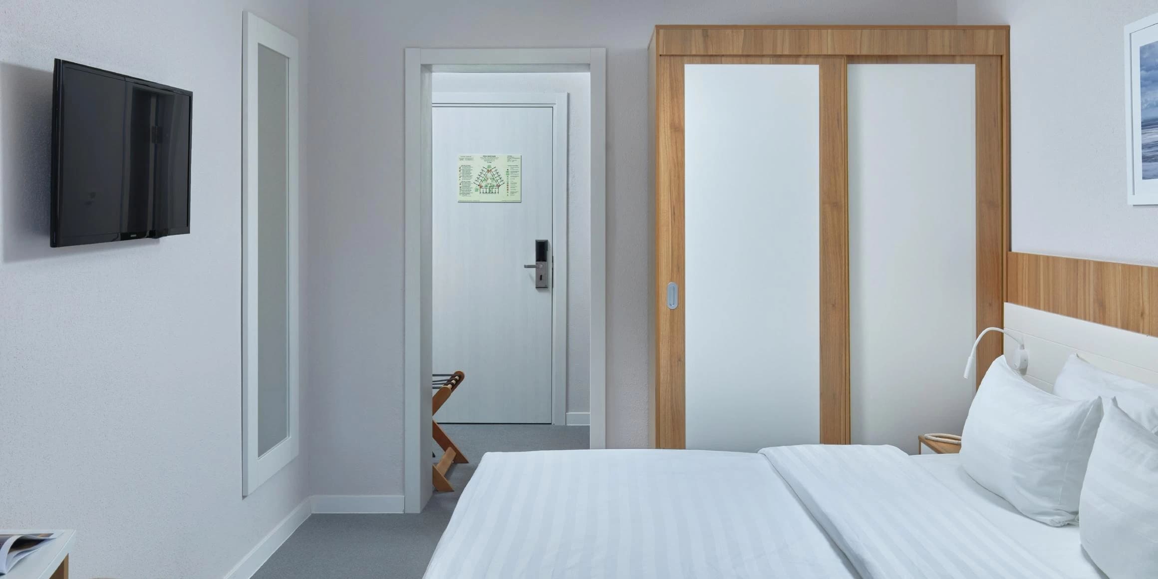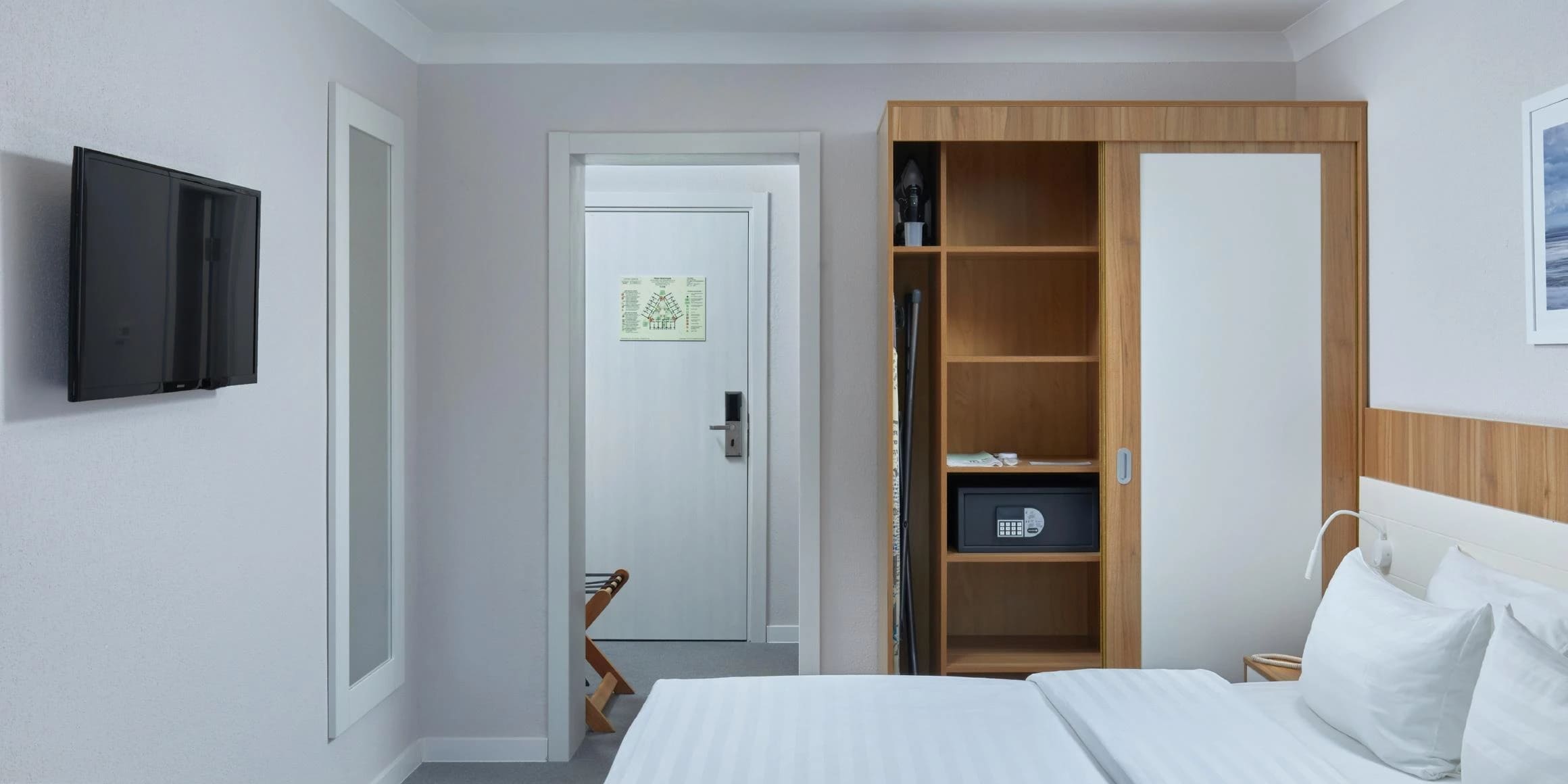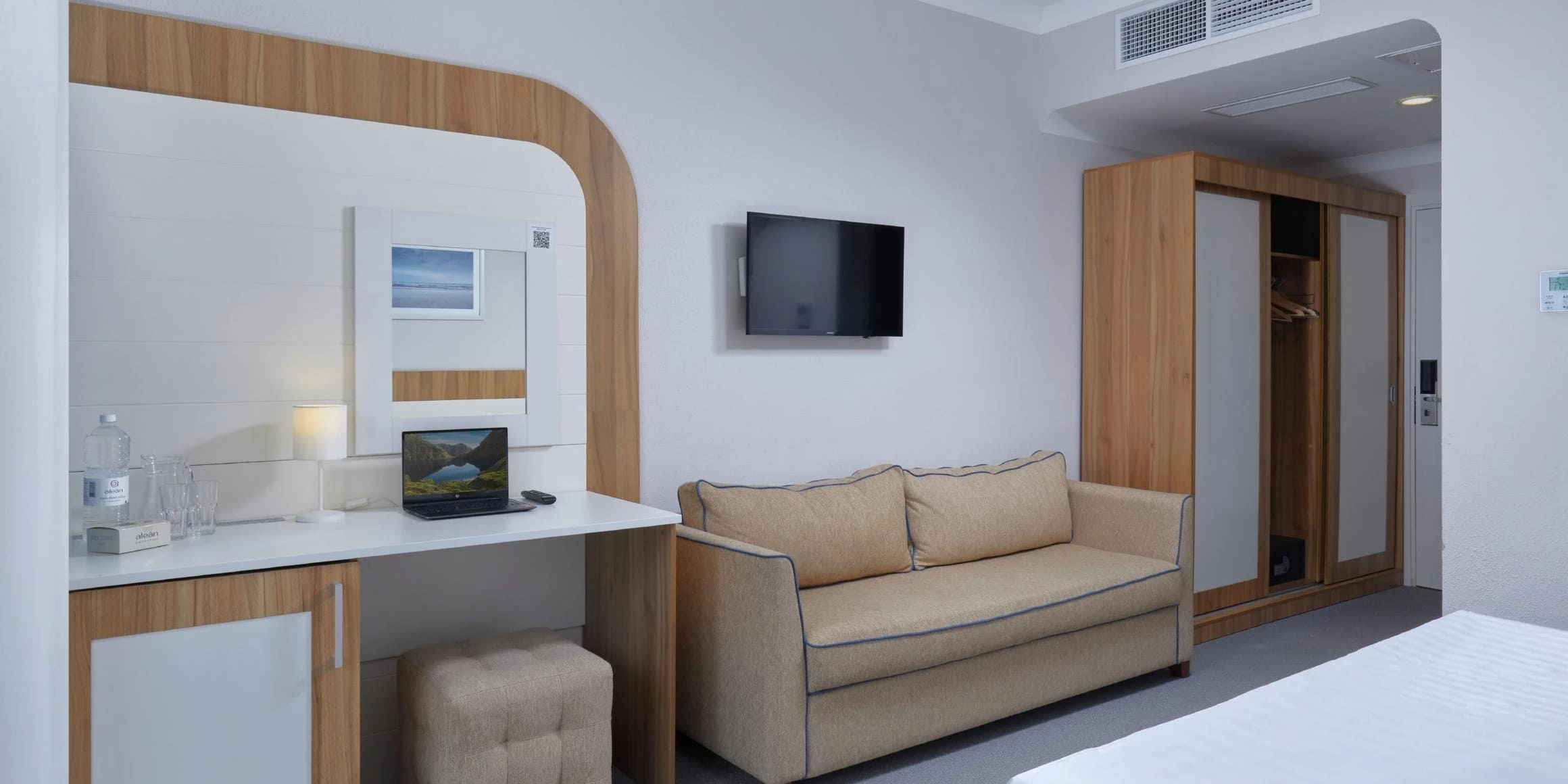 Стандарт 2-местный 1-комнатный 17 кв.м (1 доп. место). Одна двуспальная кровать, кресло-кровать, прикроватные тумбочки, (полочки) шкаф для одежды, туалетный столик, стул, телевизор, мини - холодильник, внутренний телефон, фанкоил, набор посуды (бутылка с крышкой, 2 стакана), сейф, утюг, гладильная доска, рожок д/обуви, губка для обуви, багажная полка, швейный набор. Санузел: душ, зеркало, фен, детская подставка для ног, детское сиденье на унитаз, весы, диспенсер с гигиеническими пакетами, комплект полотенец, халат, тапочки, набор гостиничной косметики.