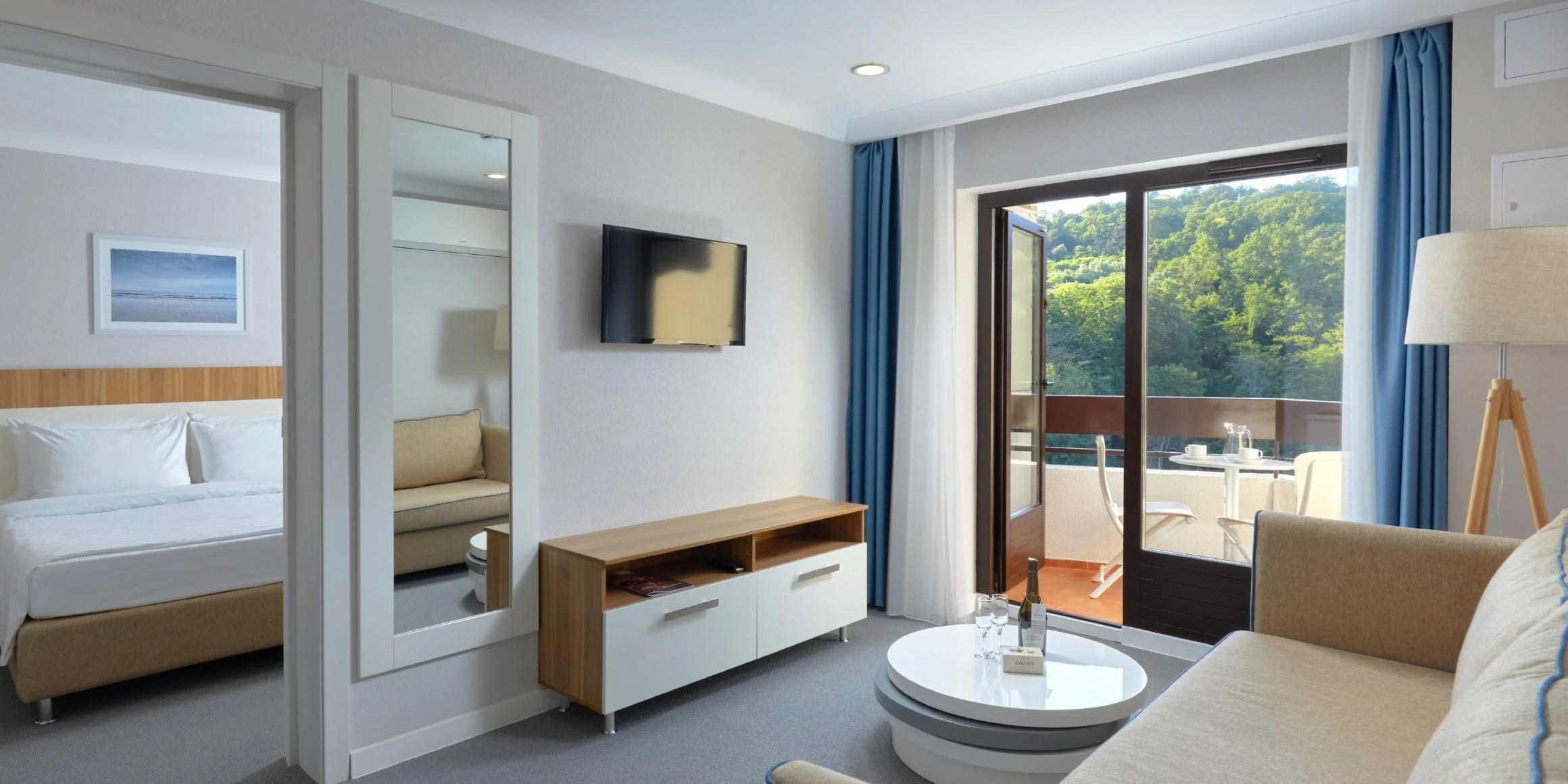Супериор 2-местный 2-комнатный 24 кв.м. (1 доп. место). Двуспальная кровать или две односпальных, прикроватные тумбы, кресло-кровать, стол, стул, настольная лампа, телевизор 32 дюйма, шкаф-купе, зеркало, внутренний телефон, сплит-система, мини-сейф, мини-холодильник, гладильная доска и утюг,набор посуды. В прихожей: багажная полка. На балконе: два стула и стол, сушилка для белья. Санузел: душевая кабина,унитаз, раковина, зеркало, зеркало косметическое, фен, весы, диспенсер с гигиеническими пакетами, детская подставка для ног, детское сиденье на унитаз, комплект полотенец, халат, тапочки, набор гостиничной косметики.