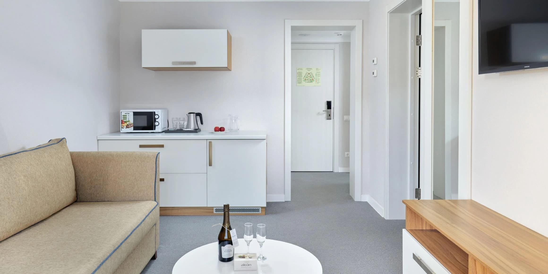 Сьют 2-местный 2-комнатный 32 кв.м (без доп. мест). БВ прихожей: багажная полка, гладильная доска и утюг, зеркало. В гостиной: диван, журнальный стол, торшер, комод, кухня (чайная станция, микроволновая печь), мини-холодильник, телевизор 32 дюйм, сплит-система, мини-сейф. В спальне: двуспальная кровать, прикроватные тумбы, кресло-кровать, шкаф-купе, телевизор 32 дюйма, внутренний телефон, стол, стул, настольная лампа, сплит-система. На балконе: два стула и стол, сушилка для белья. Санузел: душевая кабинка, зеркало, зеркало косметическое, фен, весы, диспенсер с гигиеническими пакетами, детская подставка для ног, комплект полотенец, халат, тапочки, набор гостиничной косметики. WC: унитаз, раковина, диспенсер с гигиеническими пакетами, детское сиденье на унитаз.