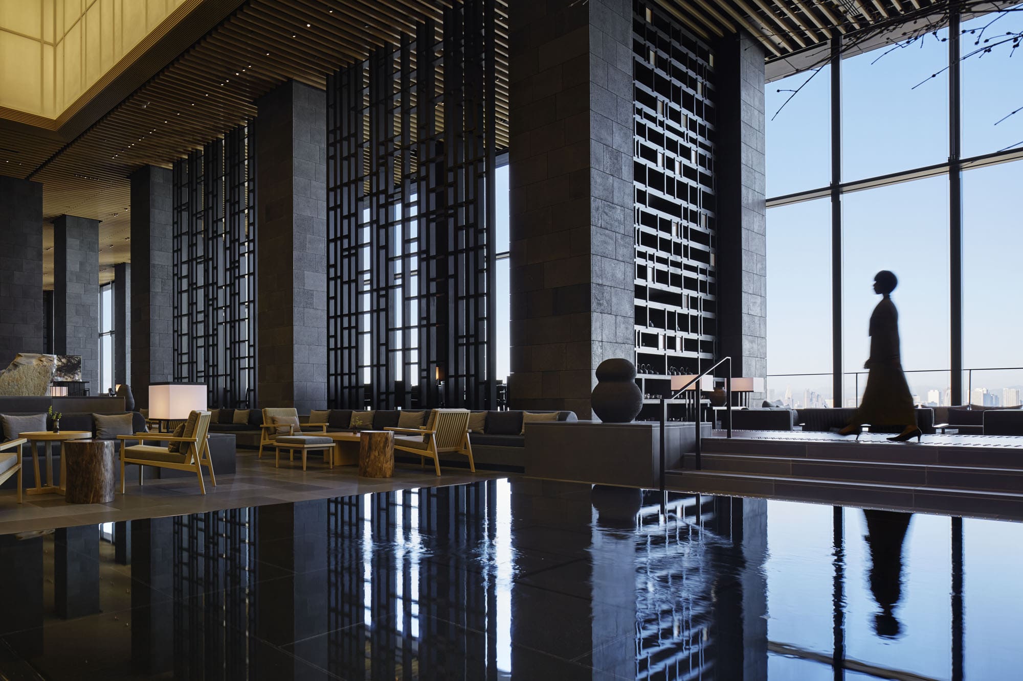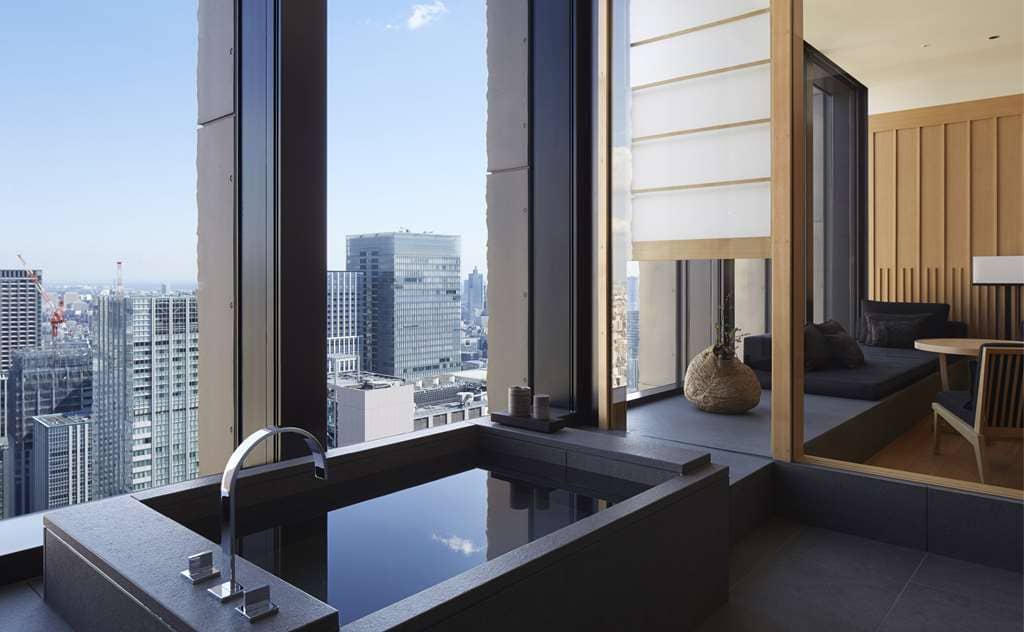 Aman Suite (157 кв. м). Гостиная с обеденным столом, спальня, ванная комната с баней-ванной офуро. Вид на Королевские сады и Токио.