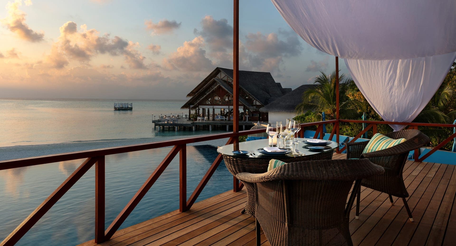 Большинство вилл отеля расположены на побережье, у кромки пляжа, позади некоторых из них есть частные садики с прохладными бассейнами. Некоторые виллы построены прямо в воде и вынесены далеко в море, так что сразу возникает ощущение жизни посреди океана.