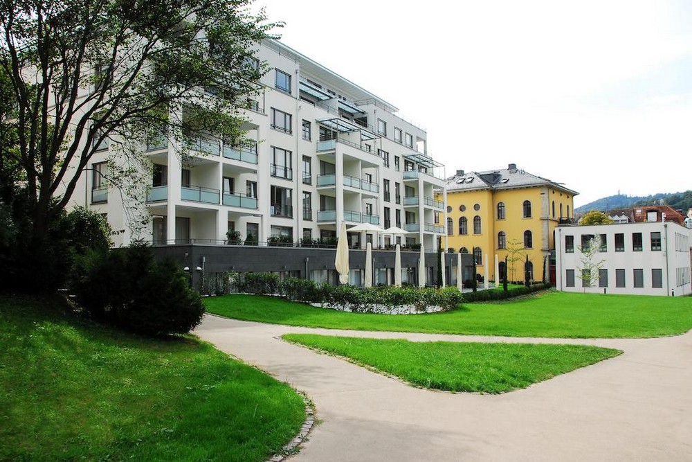Grand suite (56-65 кв. м). Балкон или патио, гостиная с обеденной зоной (стол на 4 персоны), спальня, ванная комната с ванной и душевой кабиной Вид на SPA-центр Caracalla Therme и замок.