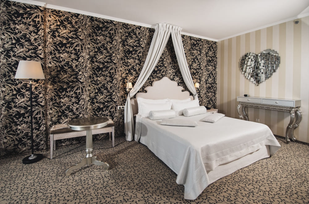 Дизайнерский полулюкс (Design deluxe room) (62 кв. м). Спальня с гостиной зоной (кровать king-size), ванная комната. Вид на море. Номера имеют различный дизайн.
