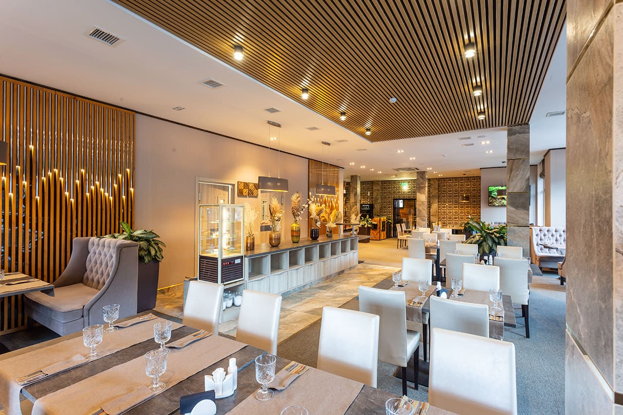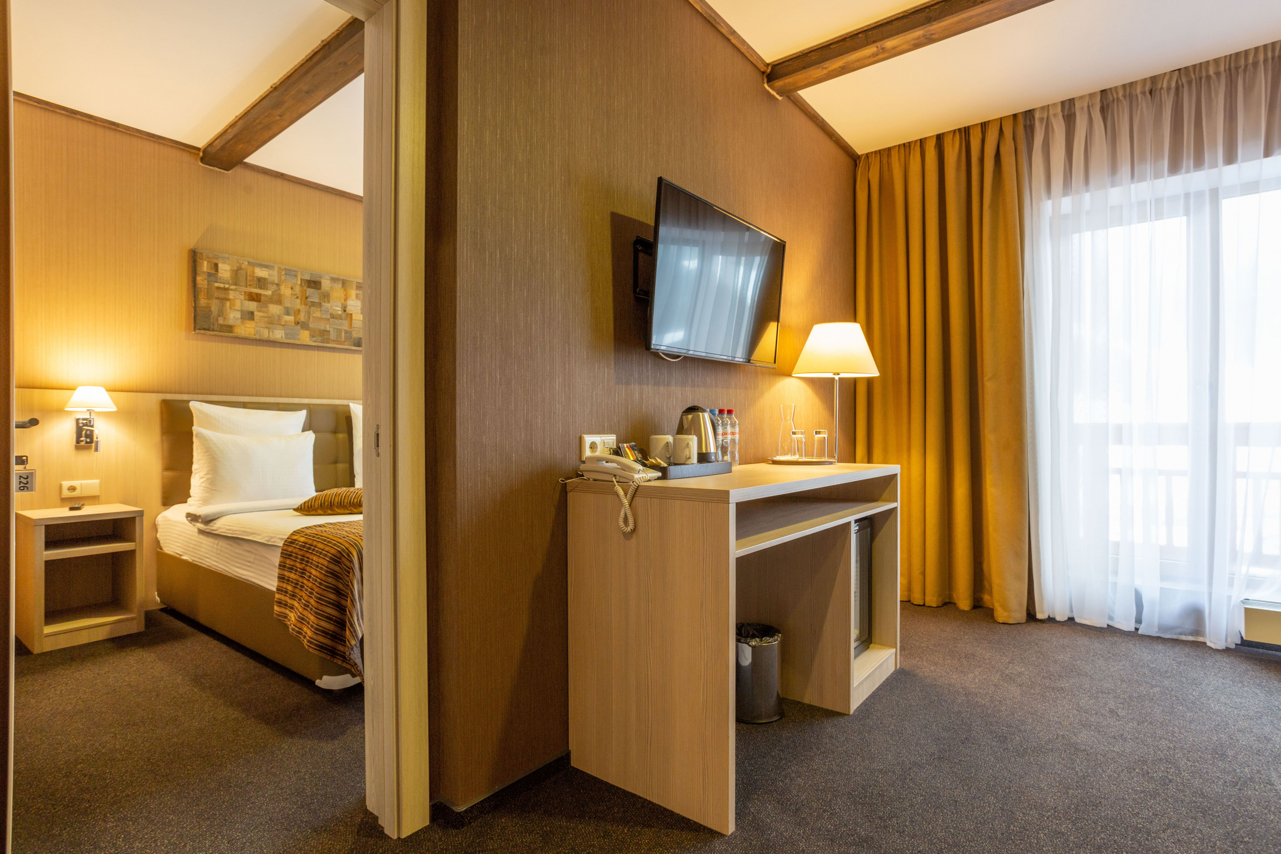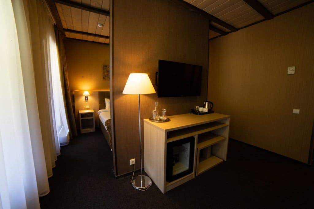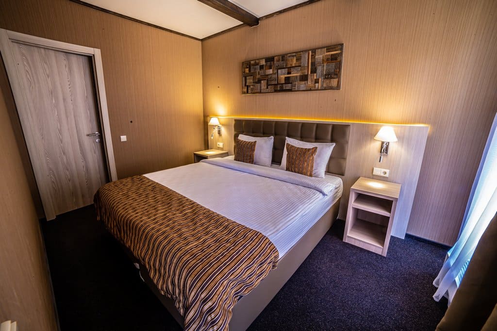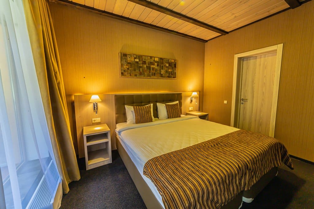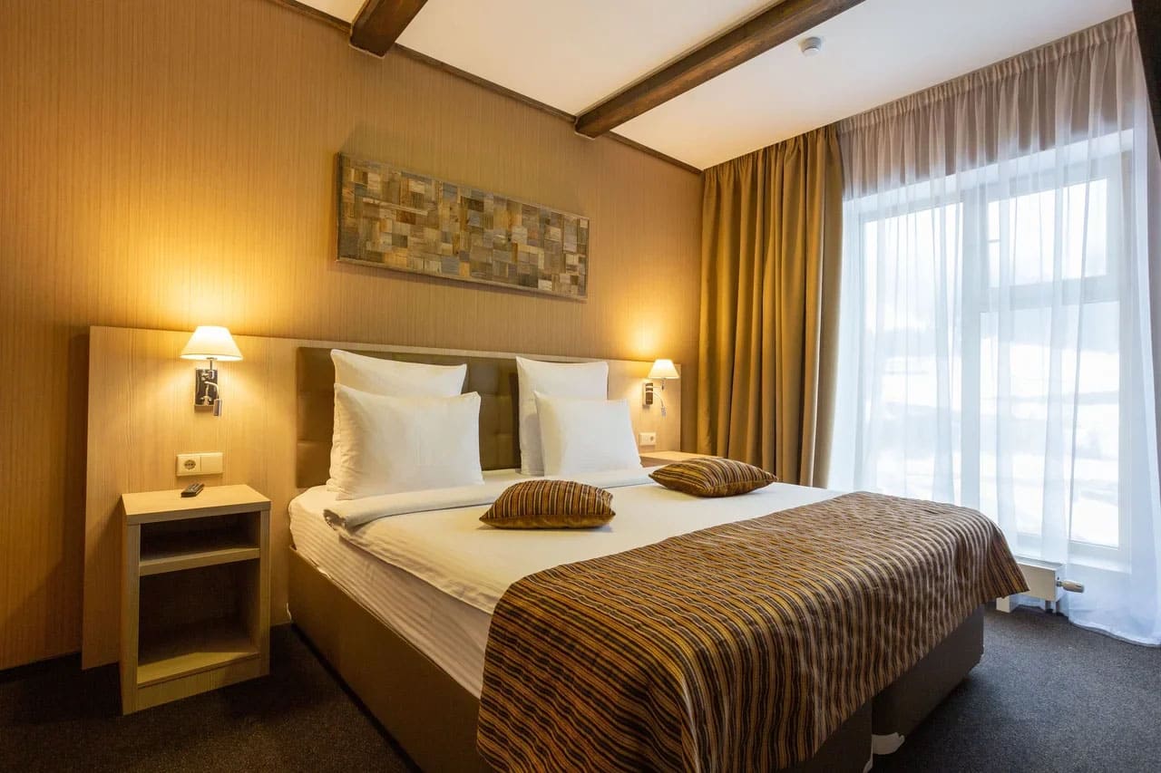 Deluxe KingSize (24 кв.м.): С панорамными окнами с видом на Кавказские горы или долину с одной двухспальной кроватью размера кинг-сайз, с балконом и мебелью, зеркальным LED телевизором диагональю 32 дюйма, бесплатным Wi-Fi, чайной зоной для отдыха, письменным столом, эргономичной группой шкафов с зеркалом в пол, комфортной ванной комнатой с душем. Номер оформлен в стиле современного горного шале из натуральных материалов, с природными элементами декора и мягким ковровым покрытием. Отделка номера выполнена в теплых древесных тонах, с яркими акцентами золотистого текстиля и гобеленов.