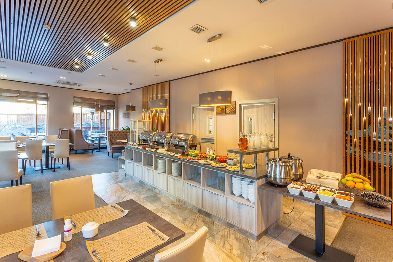 Premium Deluxe (35 кв.м): Просторный номер с одной двухспальной кроватью размера кинг-сайз и с обособленной зоной отдыха с диваном. Номер с панорамными окнами и двумя балконами оборудован зеркальным LED телевизором диагональю 32 дюйма, чайной зоной, мини баром, раскладным диваном со столиком и письменным столом в зоне отдыха, эргономичной группой шкафов с зеркалом в пол и вместительной гардеробной в зоне спальни, комфортной ванной комнатой с душем. Пространство номера спроектировано с зонированием, что дает ощущение обособленности и дополнительного комфорта. Номер оформлен в стиле современного горного шале из натуральных материалов, с природными элементами декора и мягким ковровым покрытием. Отделка номера выполнена в теплых древесных тонах, с яркими акцентами золотистого текстиля и гобеленов.