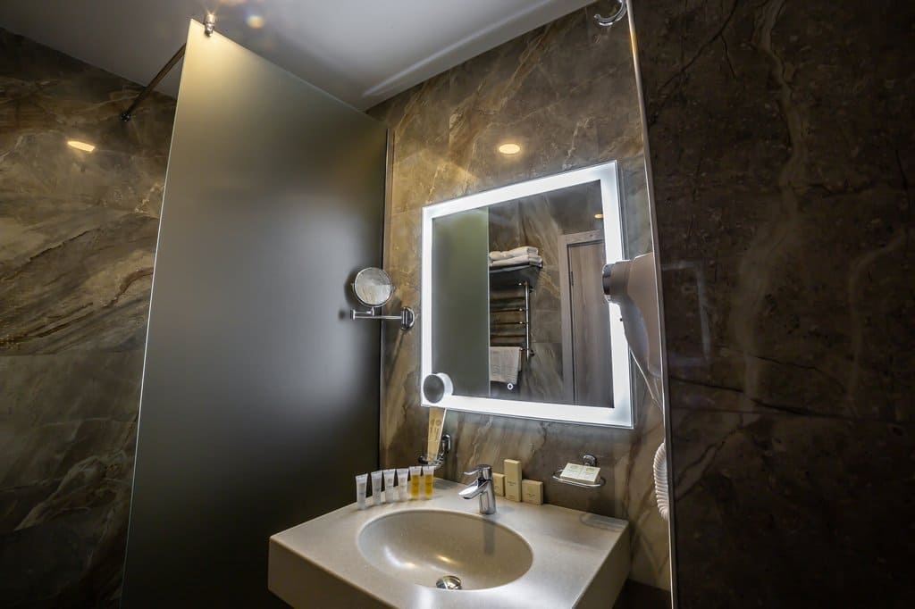 Интерконнект (48 кв.м.): Интерконнект – это два, объединенных межкомнатной дверью номера категории Delux, с двумя санузлами. Номера с панорамными окнами с видом на Кавказские горы или долину с двумя двухспальными кроватями размера кинг-сайз, с балконом и мебелью, зеркальным LED телевизором диагональю 32 дюйма, бесплатным Wi-Fi, чайной зоной для отдыха, письменным столом, эргономичной группой шкафов с зеркалом в пол, двумя комфортными санузлами с душем. Номер-интерконнект оформлен в стиле современного горного шале из натуральных материалов, с природными элементами декора и мягким ковровым покрытием. Отделка номера выполнена в теплых древесных тонах, с яркими акцентами золотистого текстиля и гобеленов.