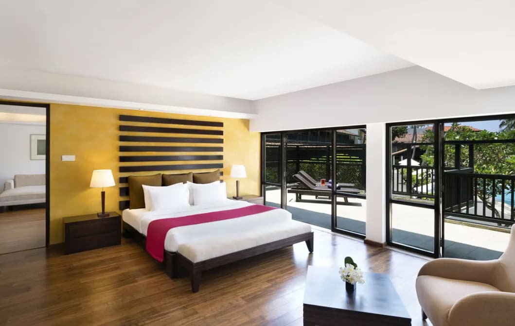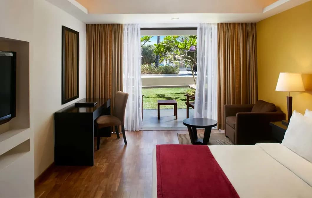 Standard Sea View Room. Номера расположены на первом и втором этажах, прямой вид на океан, кровать king-size/ twin, душ ,сейф, набор для приготовления чая, кондиционер, потолочный вентилятор, телевизор, телефон, тапочки, халат, балкон, фен, мини-бар, кофеварка, WIFI.