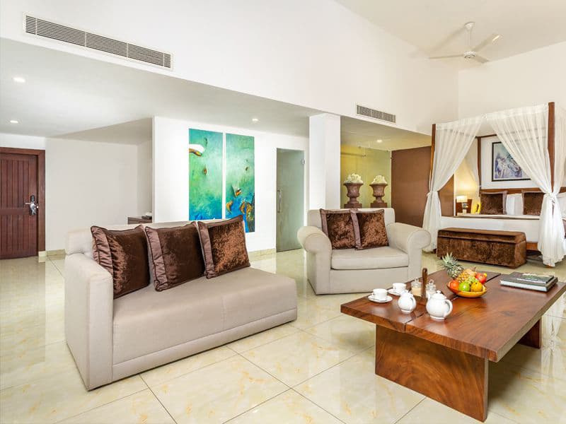 Junior Suite (86 кв. м). Двухкомнатный номер: отдельная спальня и гостиная, ванная комната с джакузи и ванной.