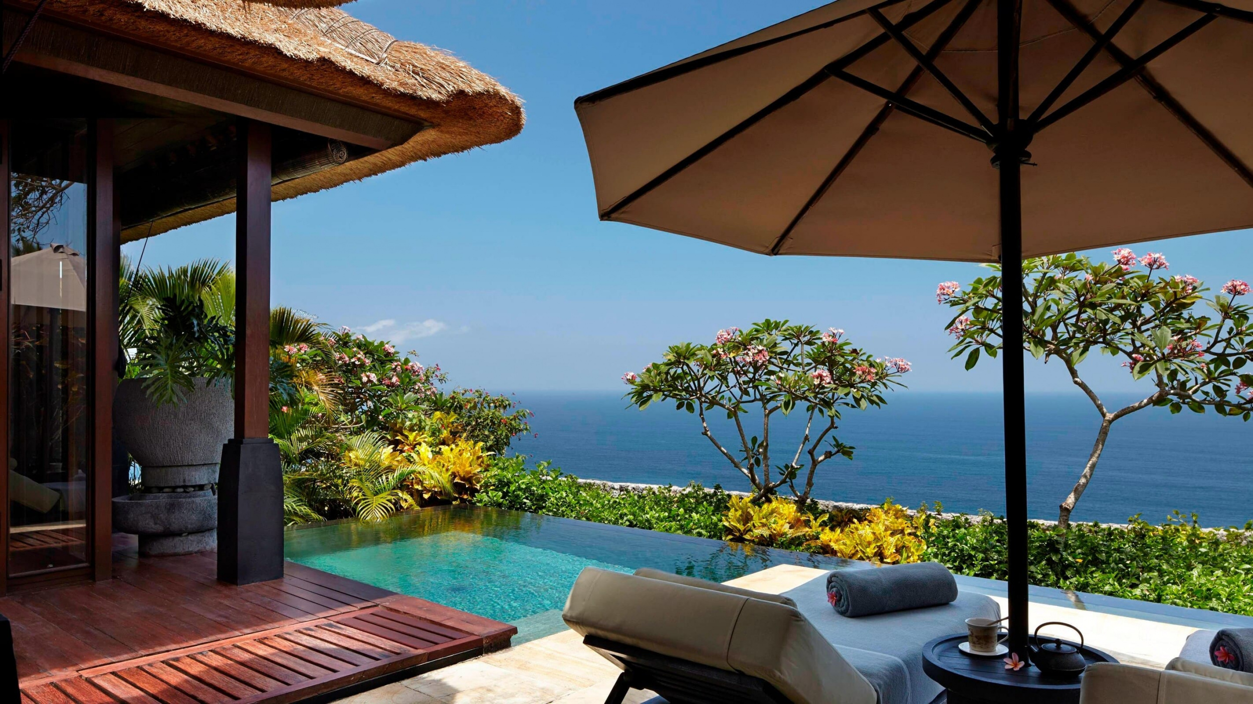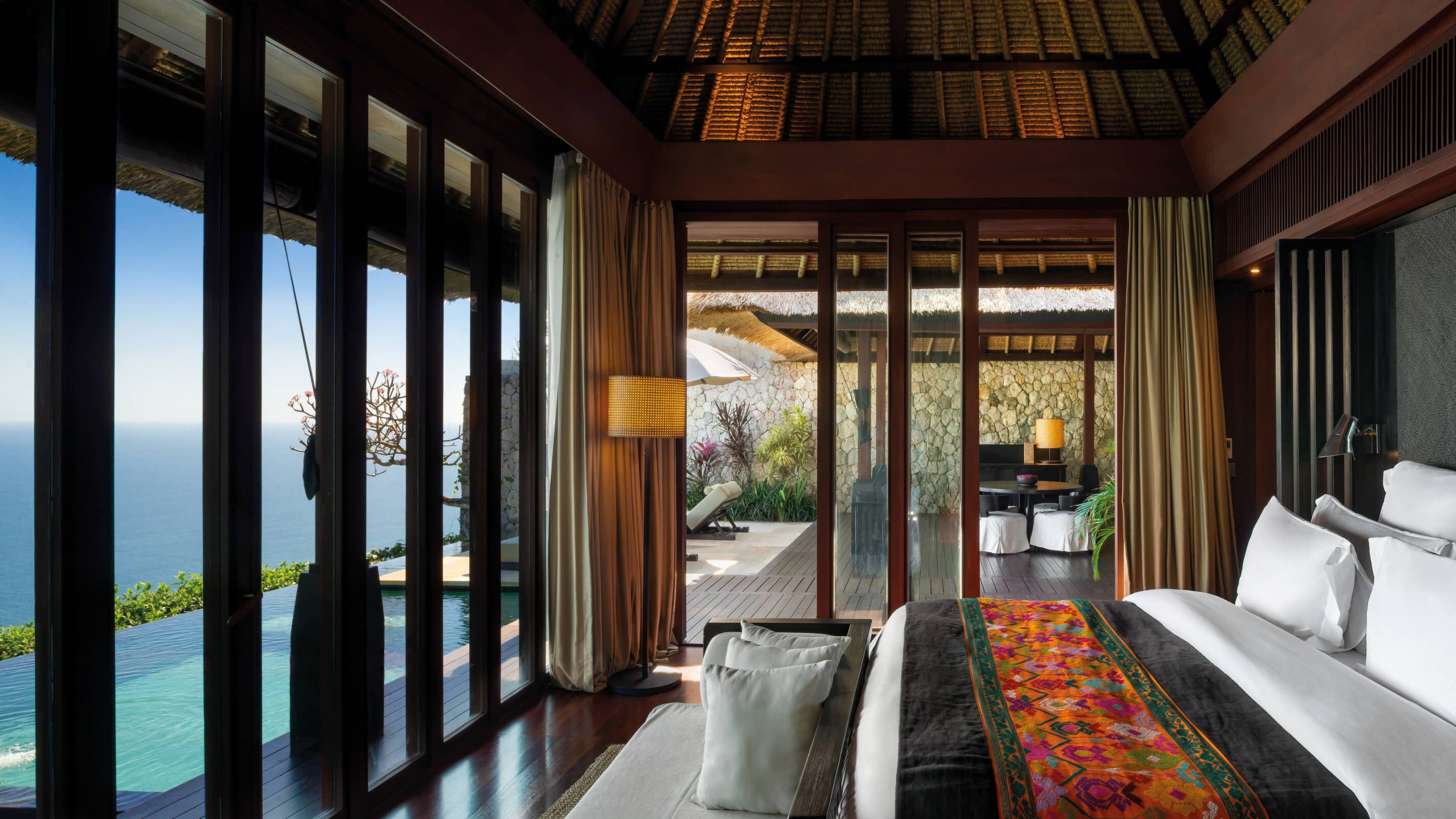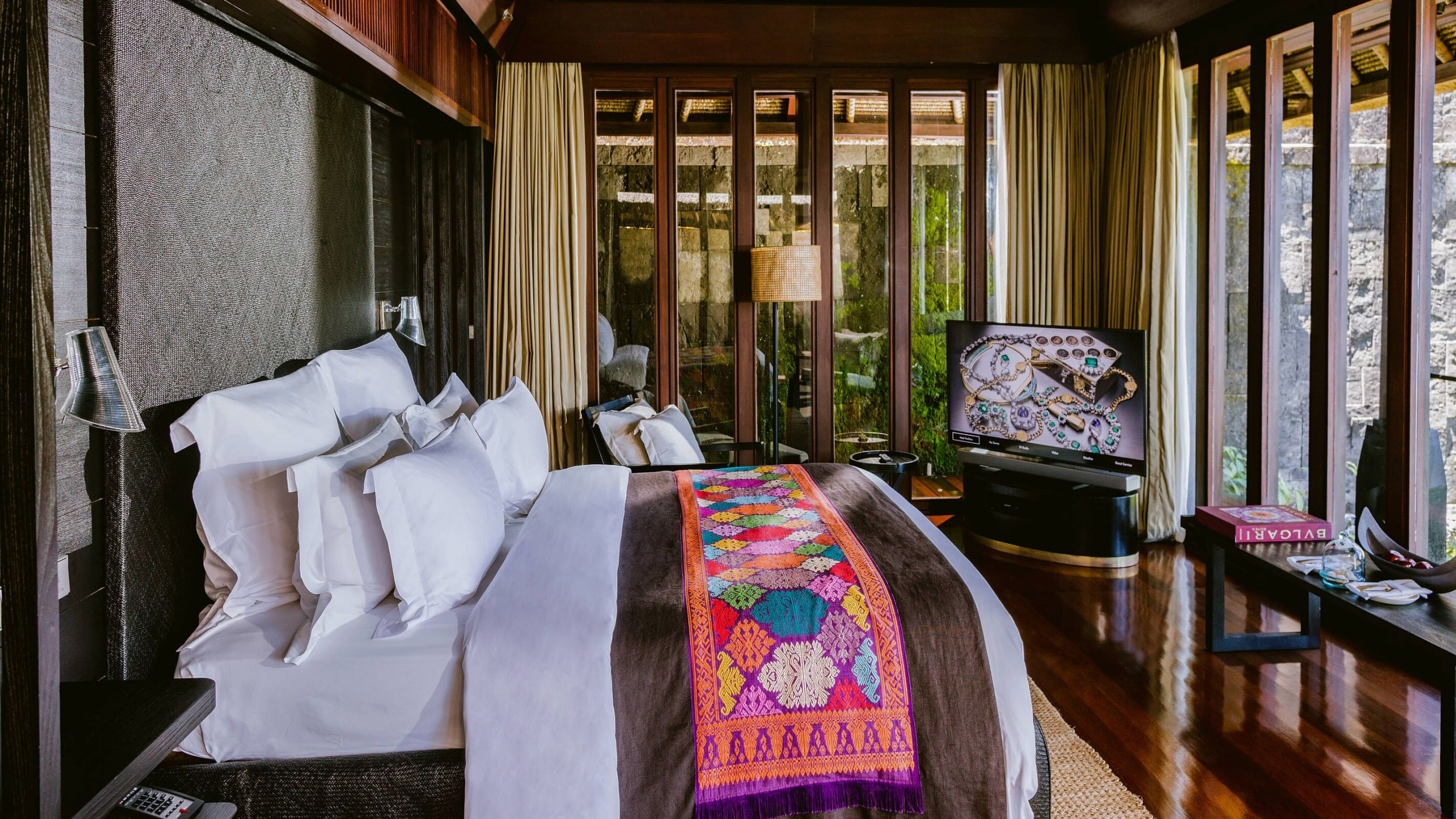 Просторные виллы курортного отеля Bulgari Bali оформлены в традиционном балийском стиле. В числе удобств — аудиовизуальная система. Из ванной комнаты через французские окна открывается вид на отдельный внутренний двор.