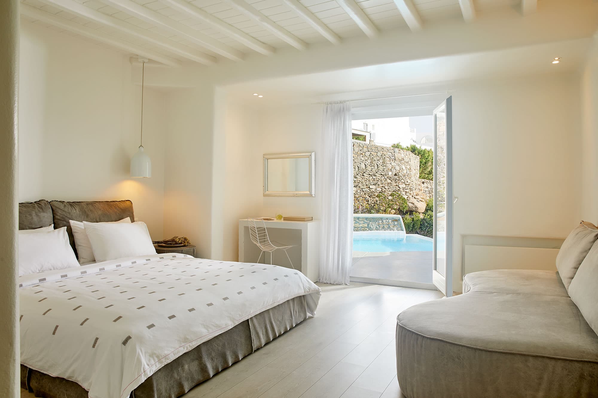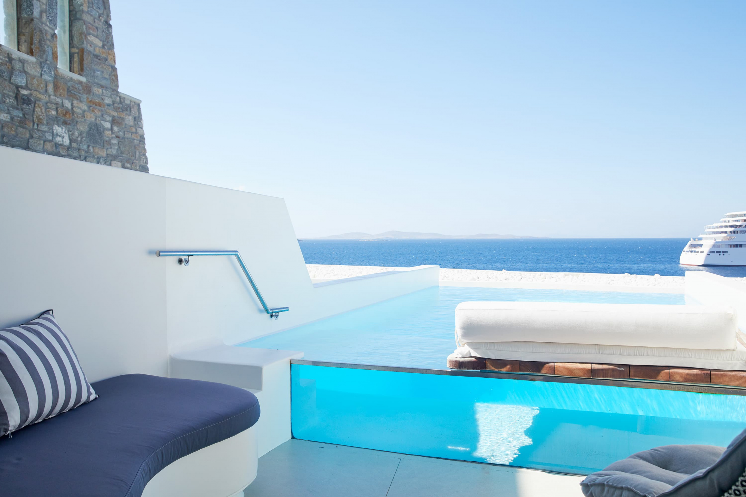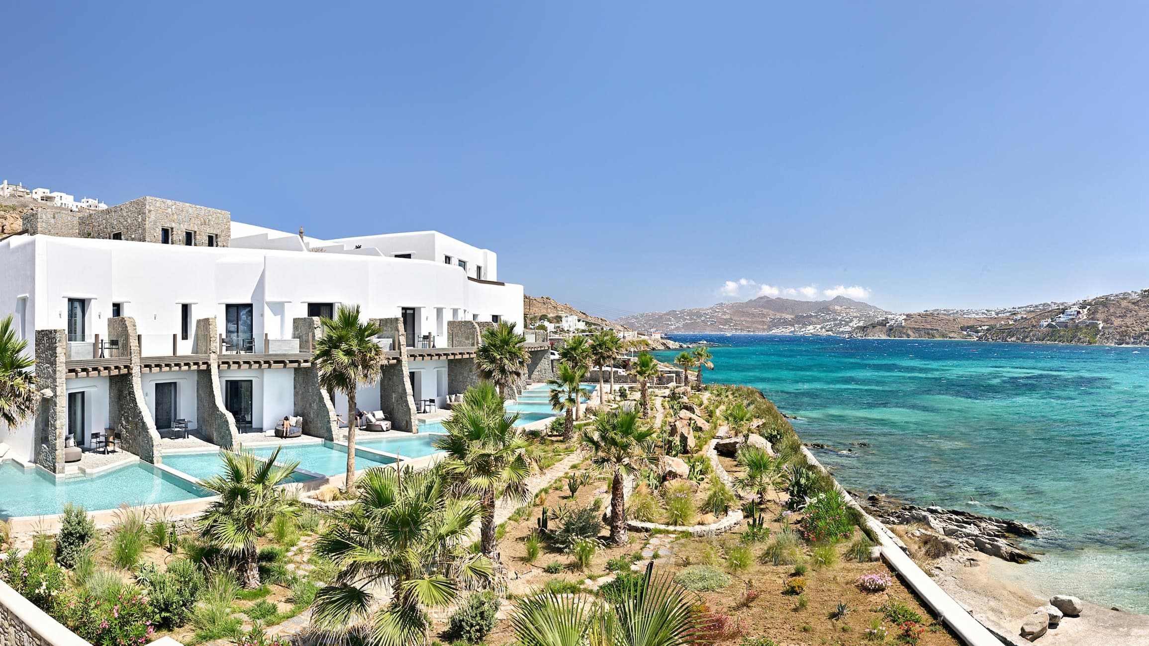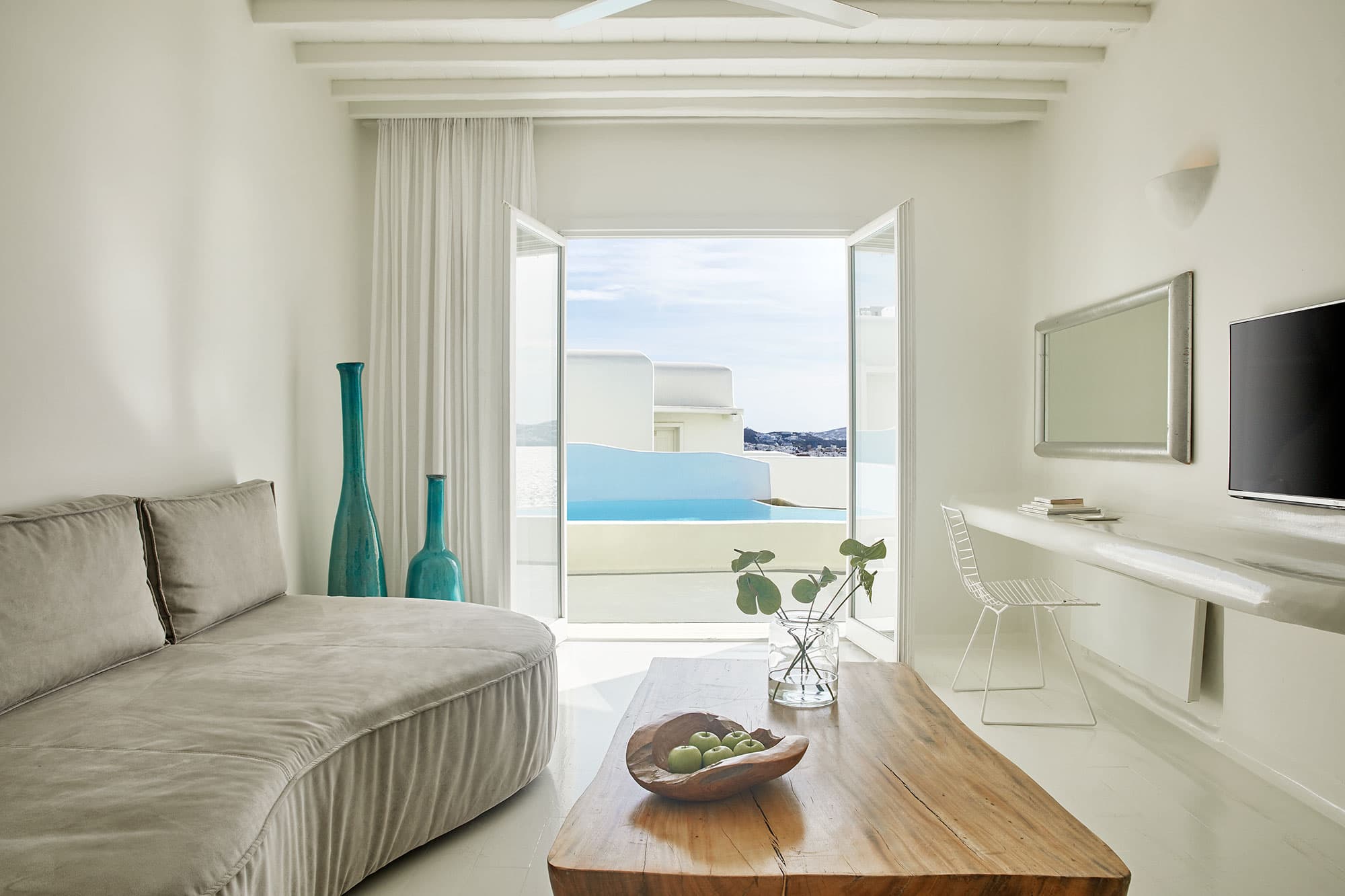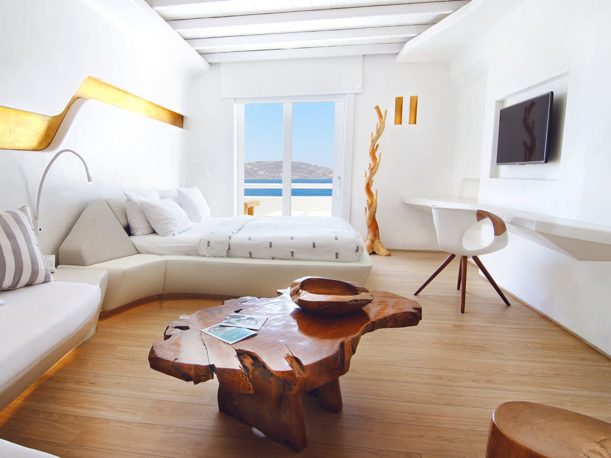 Отель Cavo Tagoo стоит совсем неподалеку от гавани и города Миконос. Отель построен в традиционном местном стиле. Стены сложены из местного камня и побелены, что создает приятный контраст с яркой зеленью и синевой моря. Потолки балочные, мебель выполнена в традиционном греческом стиле.