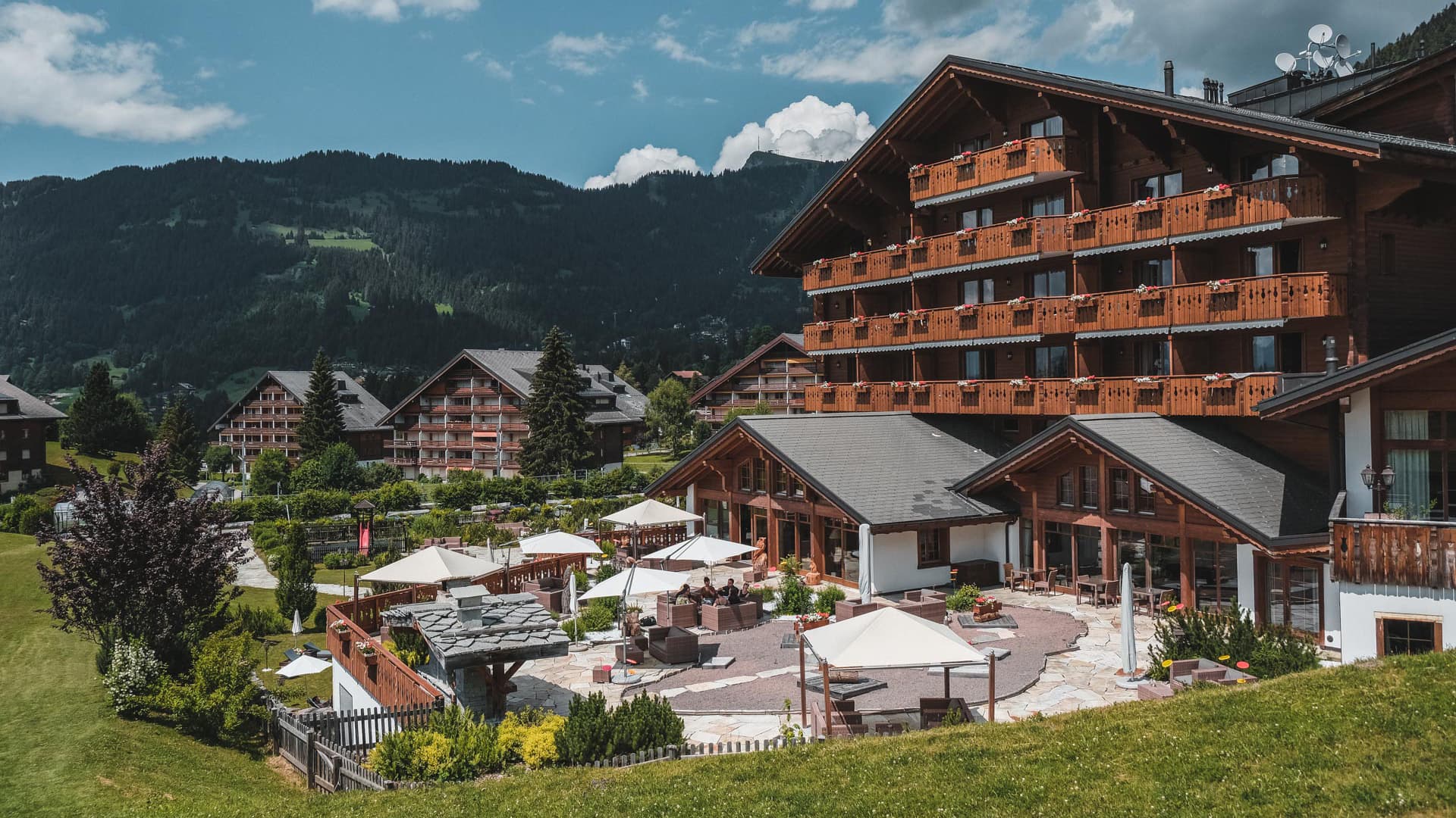 Aubepine Residence(91 кв. м). Гостиная с камином и кухней,2 спальни(Dbl и Dbl или Twin). Вид на горы. Прямой выход в сад. До 5 чел.
