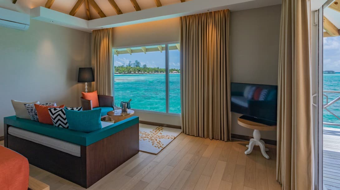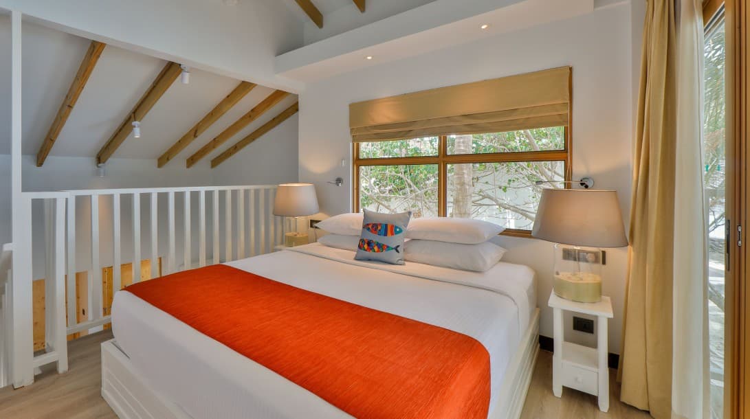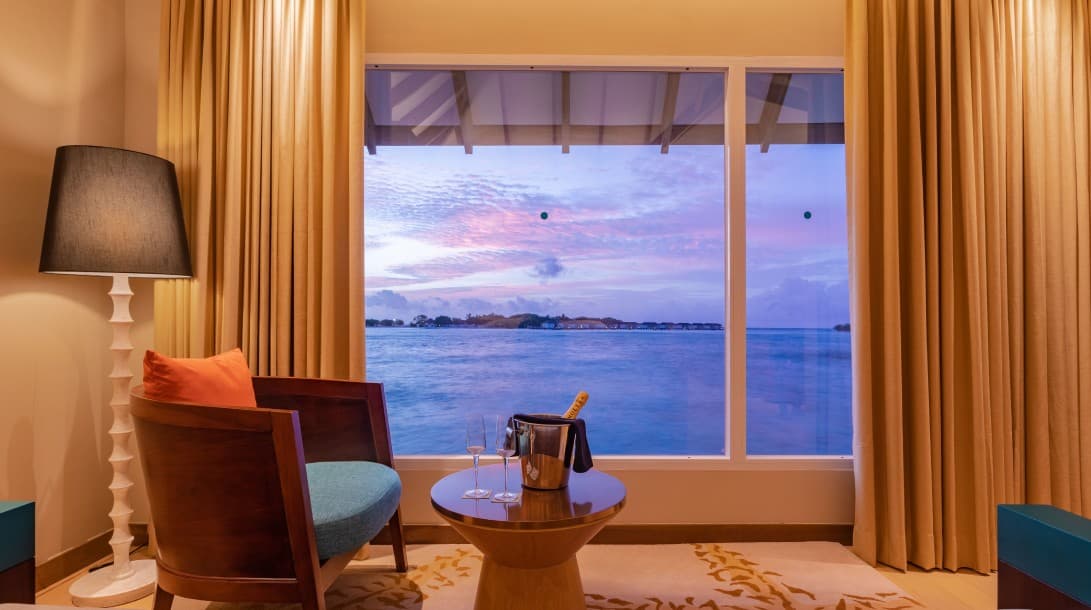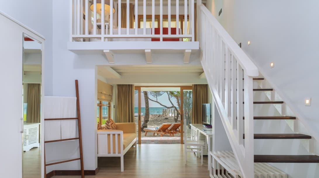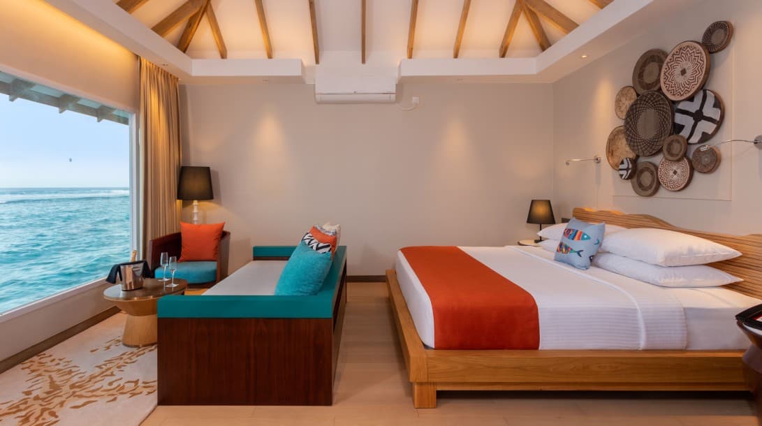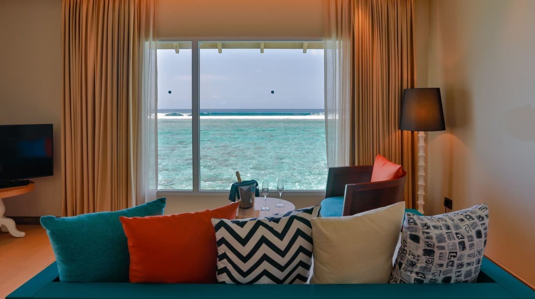 Из окон открывается потрясающий вид на океан. Номера расположены под соломенной крышей. В люксах есть просторная гостиная зона и собственный балкон.