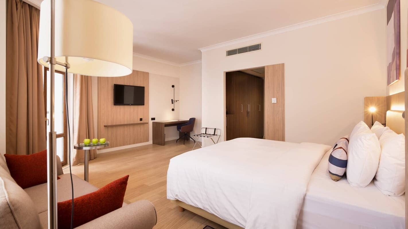 Standard room (23-29 кв. м): балкон, спальня с кроватью king-size или двумя отдельными кроватями, ванная комната. Вид на город.