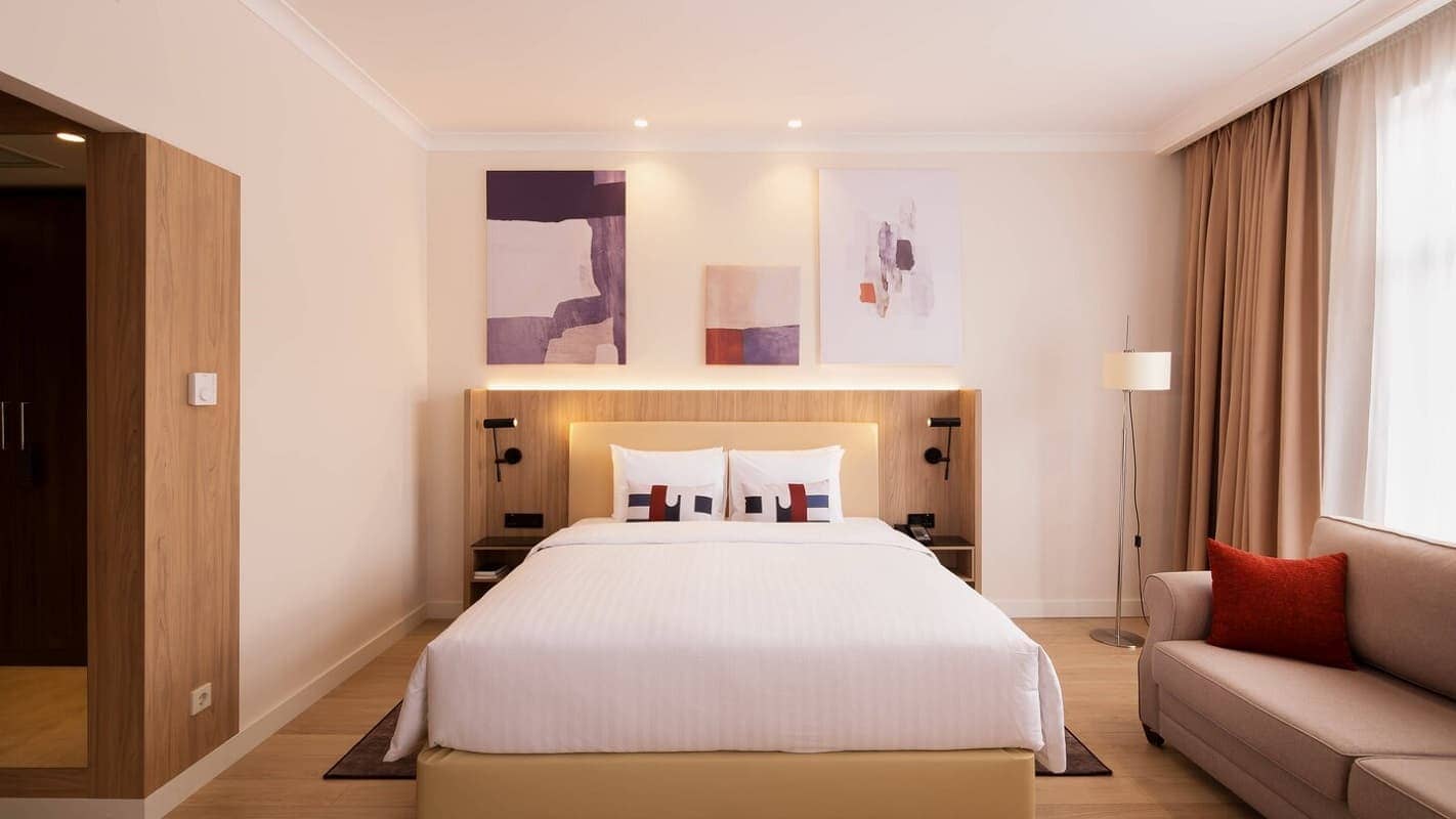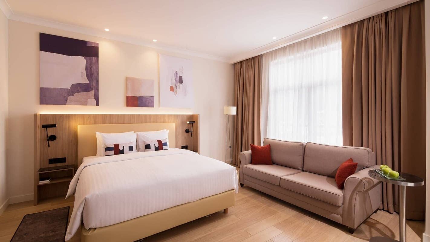 1-bedroom suite (51 кв. м):: балкон, спальня с гостиной зоной (кровать king-size), ванная комната. Вид на город.