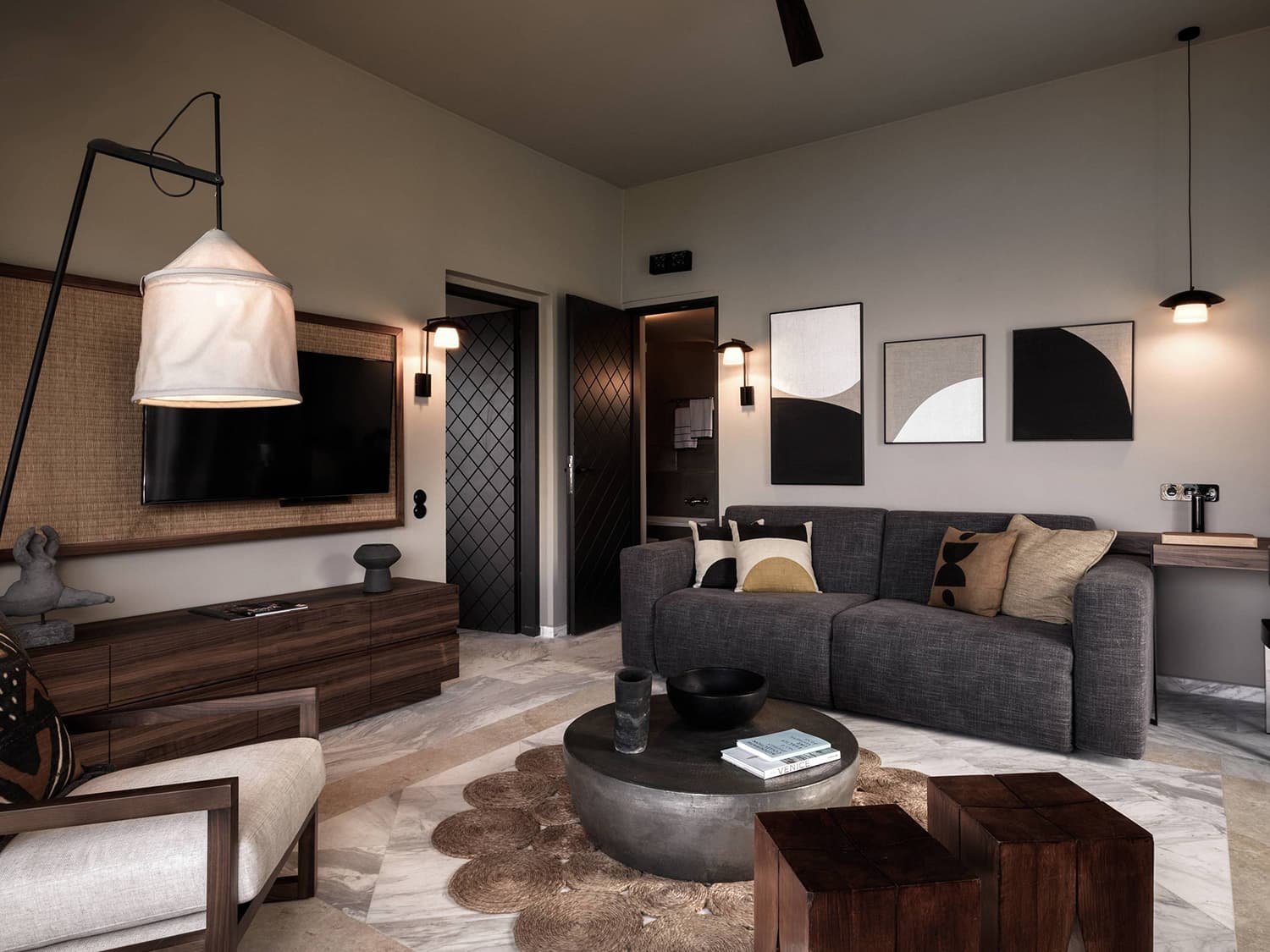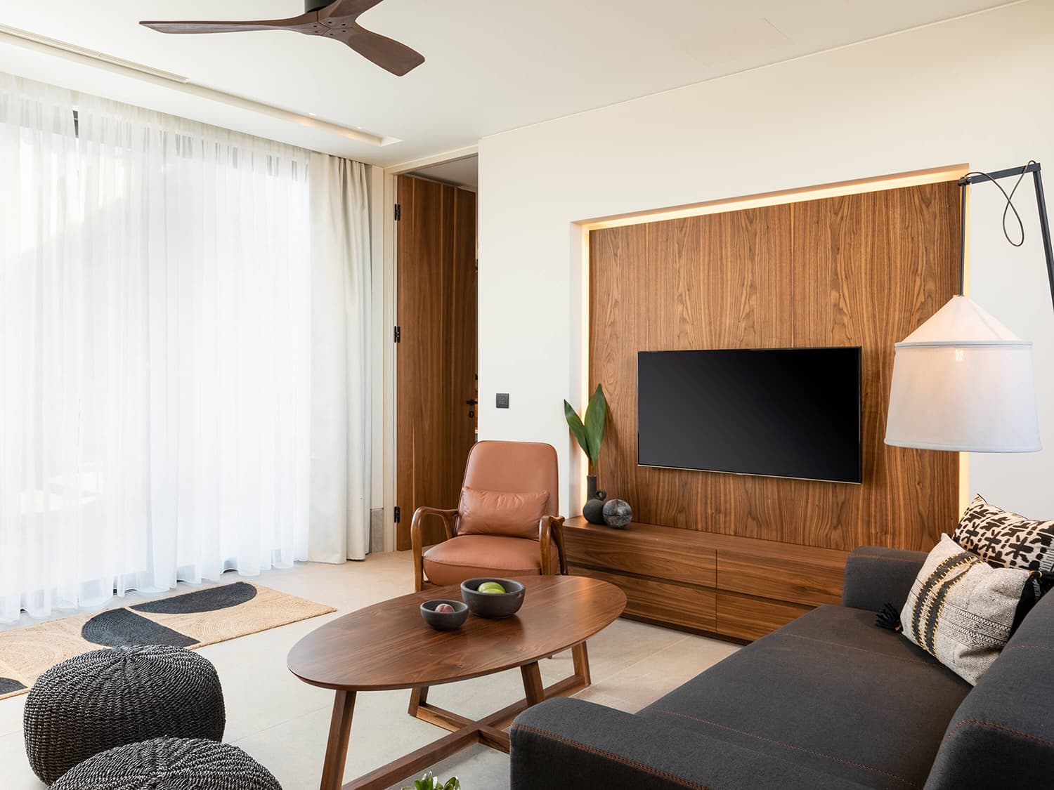 Двухуровневая вилла. Частный сад, открытый персональный бассейн (35 кв. м), гостиная с обеденной и кухонной зоной, 2 спальни (одна – с кроватью king-size, другая – с двумя отдельными кроватями), 2 ванные комнаты, гостевой туалет. Вид на залив и территорию курорта. Гости данных номеров имеют особые привилегии. - 250 кв.м.