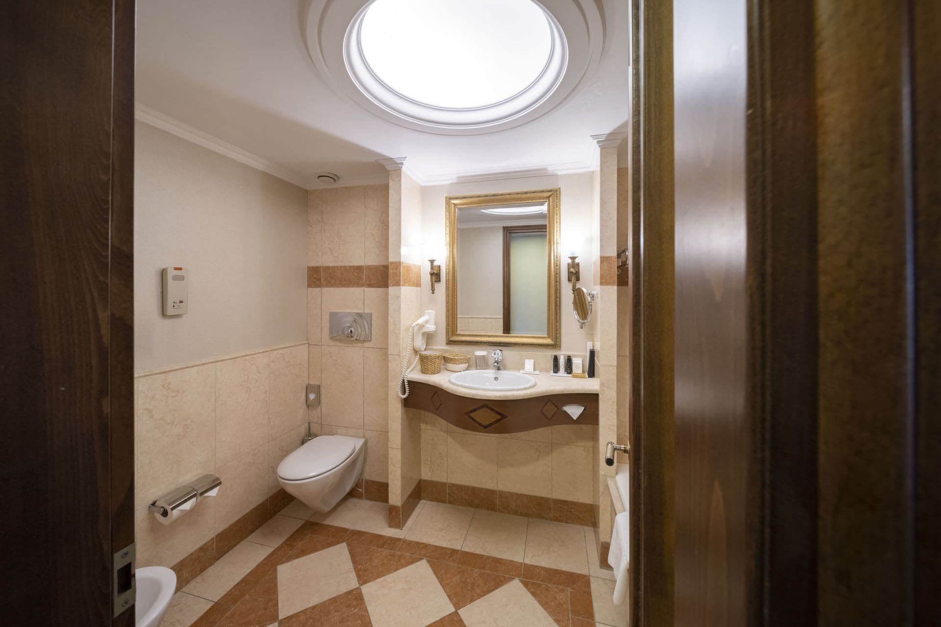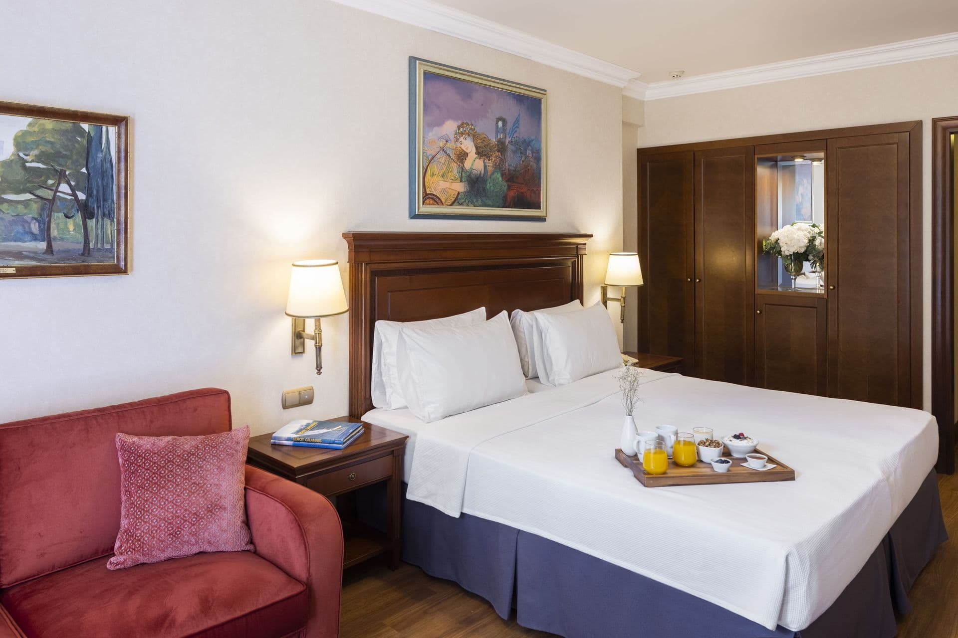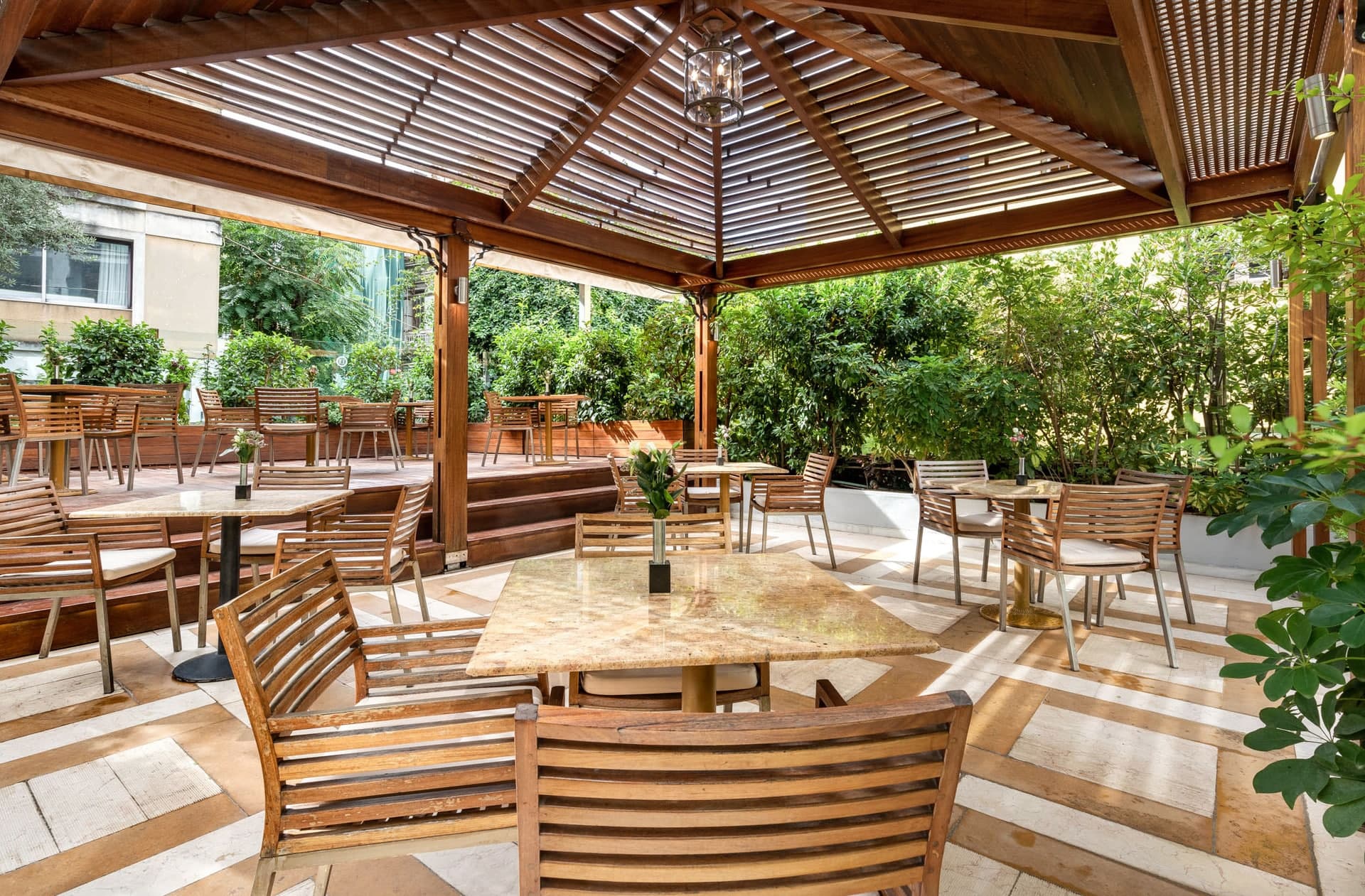 Фасад отеля выполнен в импозантном стиле неоклассицизма, а вечером, благодаря искусной подсветке, здание выглядит еще интереснее. В оформлении интерьеров было использовано много элементов из дерева, использовалась и антикварная мебель – это создает ощущение изысканности и роскоши. Все номера выполнены в классическом стиле, который гармонирует с внешним обликом самого здания, а также с архитектурным стилем древнего района, в котором отель расположен.