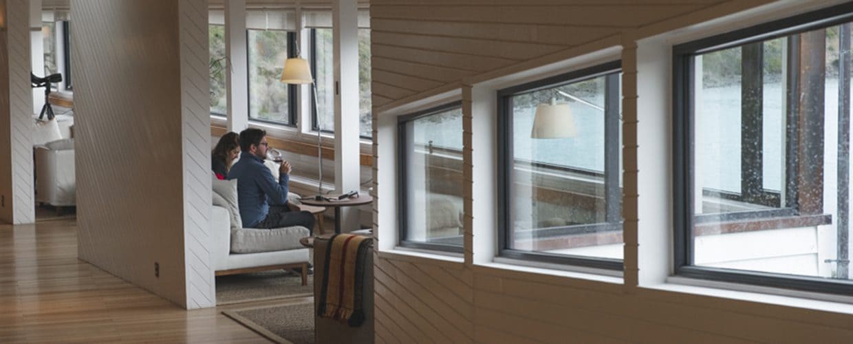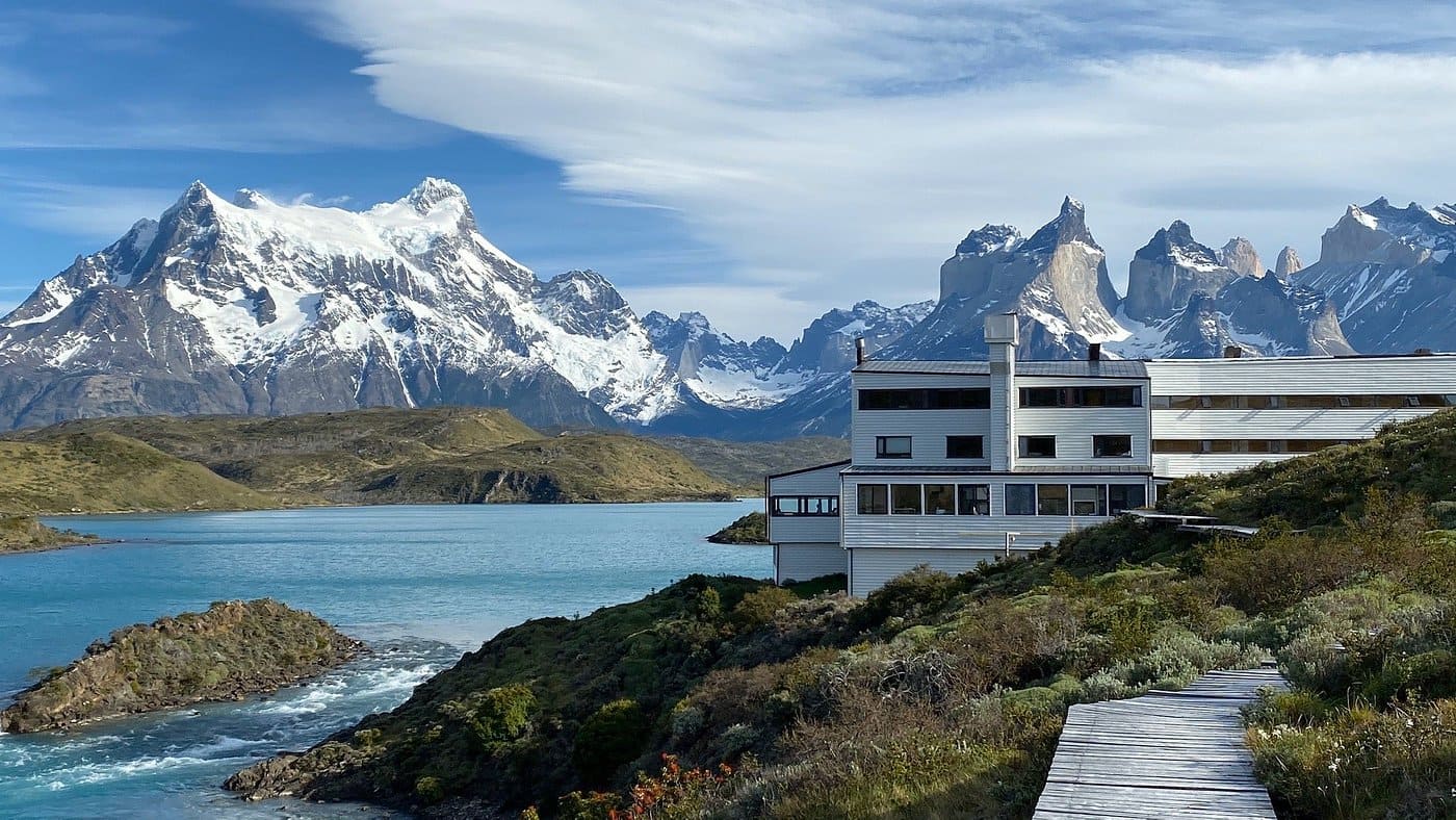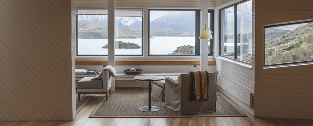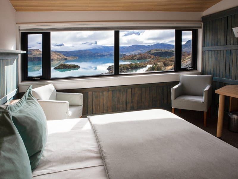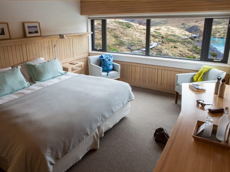 Exploradores suite (42 кв. м): спальня с гостиной зоной (кровать king-size или две отдельные кровати), ванная комната. Вид на гору Macizo del Paine.