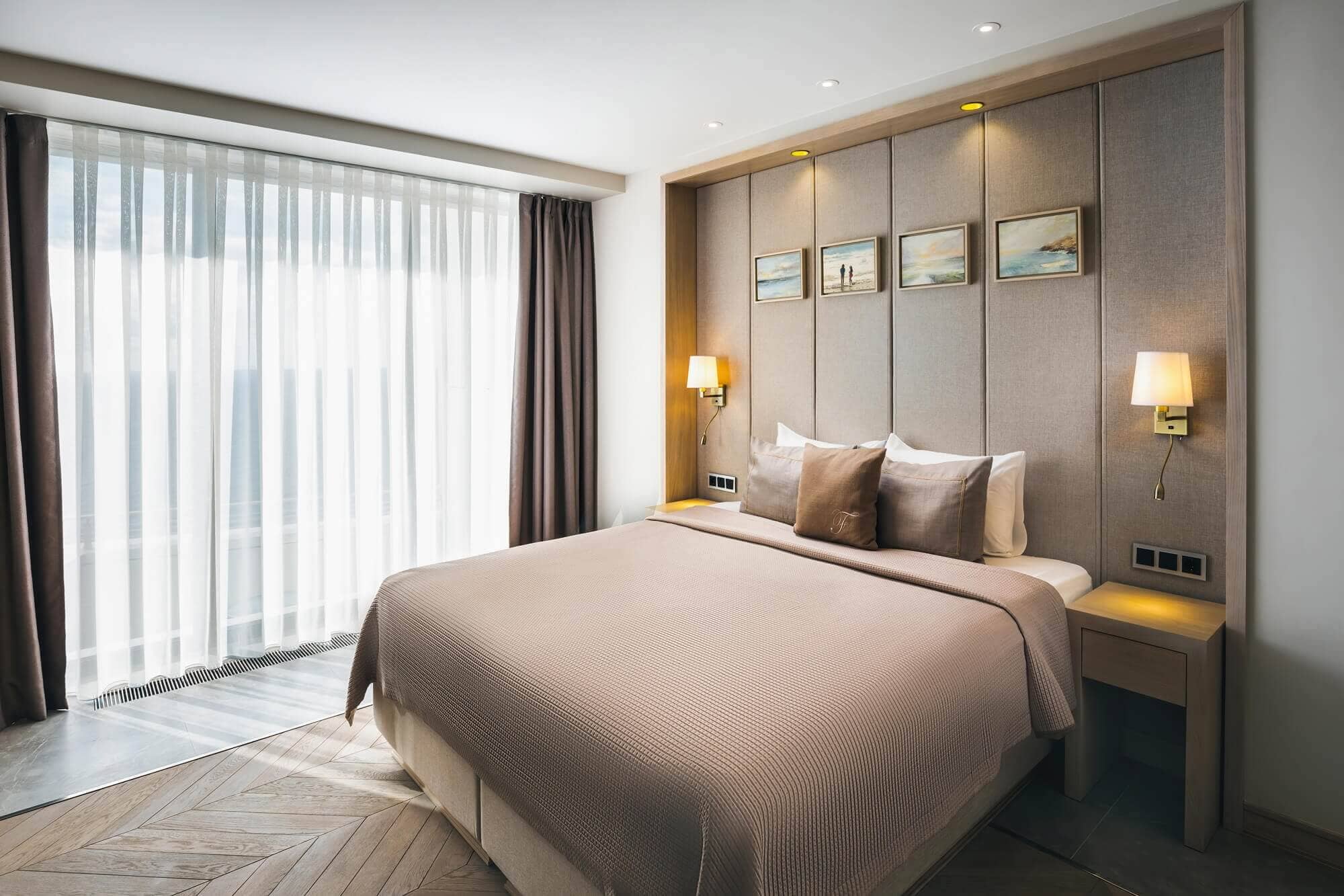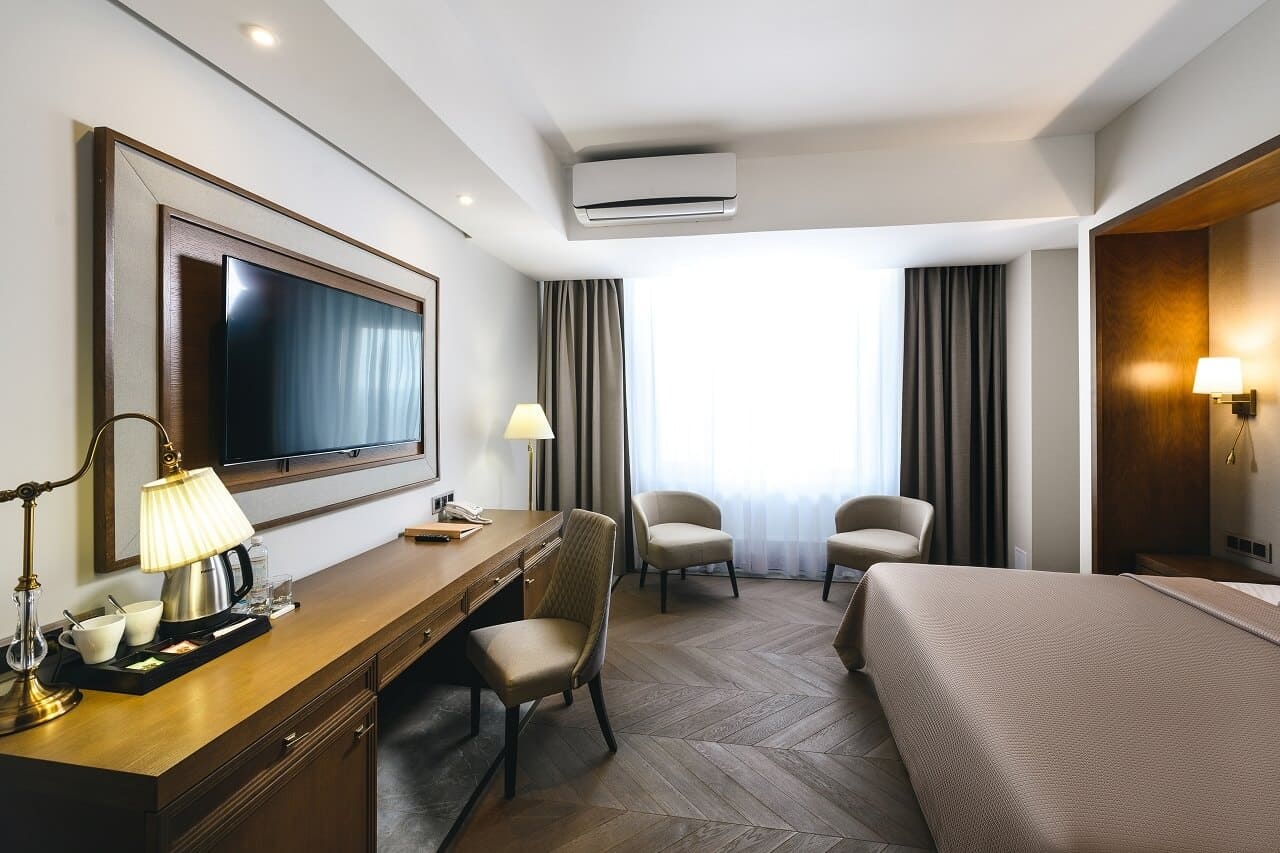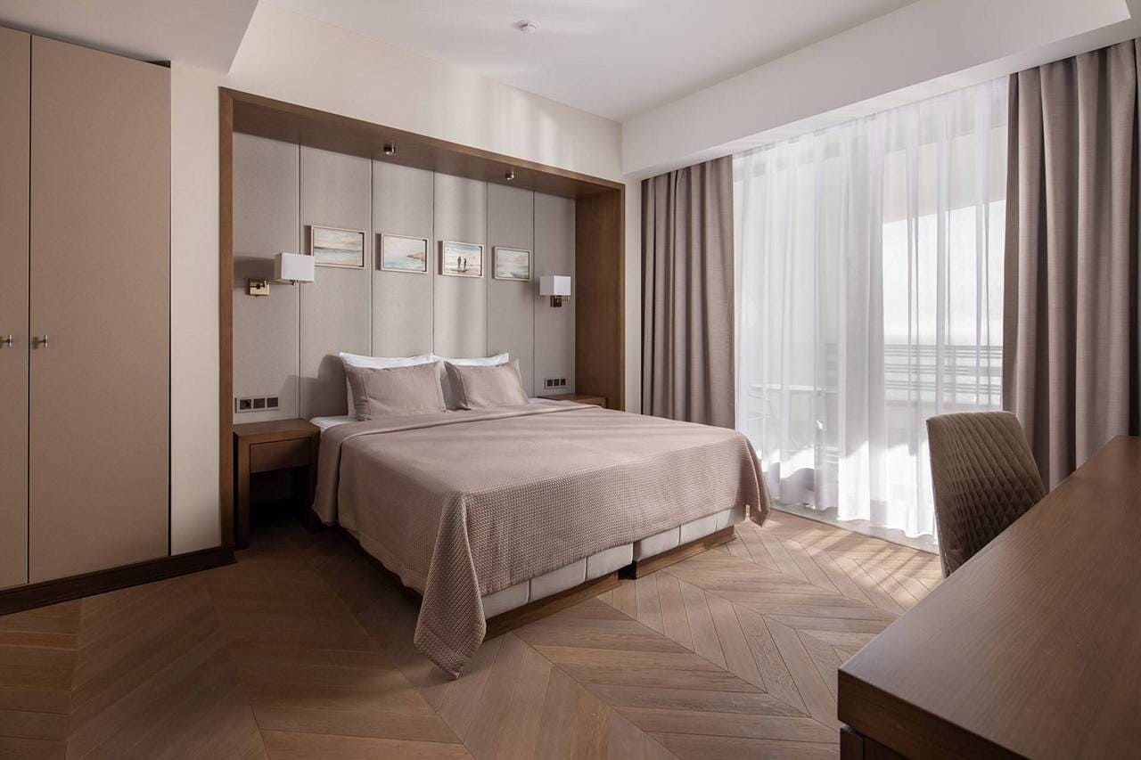 Апартаменты Номер категории «Апартаменты» - это высшая категория номеров. Апартаменты – просторный трехкомнатный номер высшей категории, состоящий из большой спальни с двуспальной кроватью размера King size и спальни с двумя раздельными кроватями, а также гостиной с мягкой мебелью, обеденной зоной с кухонным уголком. Номер оснащен всем необходимым для длительного пребывания, а дизайнерское решение в пастельных тонах способствует созданию уютной домашней атмосферы.