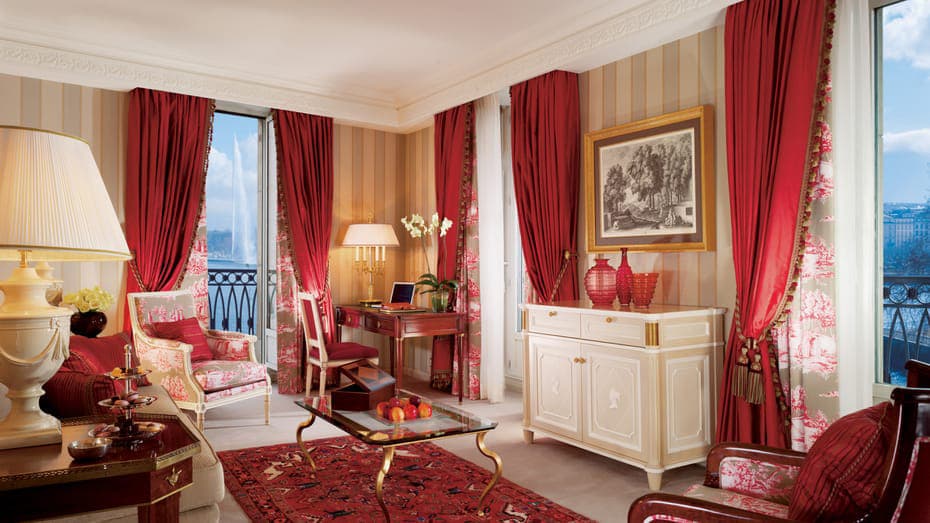 Presidential suite Geneve (110 кв. м): 5 балконов, гостиная с обеденной зоной (стол на 6 персон), спальня с кроватью «king-size», гардеробная, ванная комната с ванной, душевой кабиной с функцией парной, гостевой туалет. Дополнительно: библиотека. Расположен на 2 этаже. Возможно присоединение дополнительной спальни. Возможно размещение дополнительной кровати. Вид на озеро и старый город.