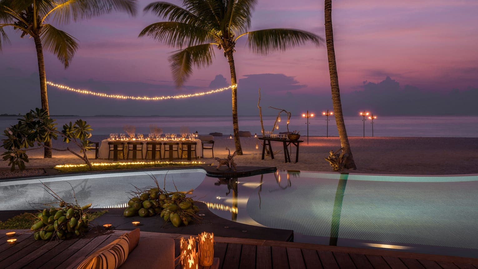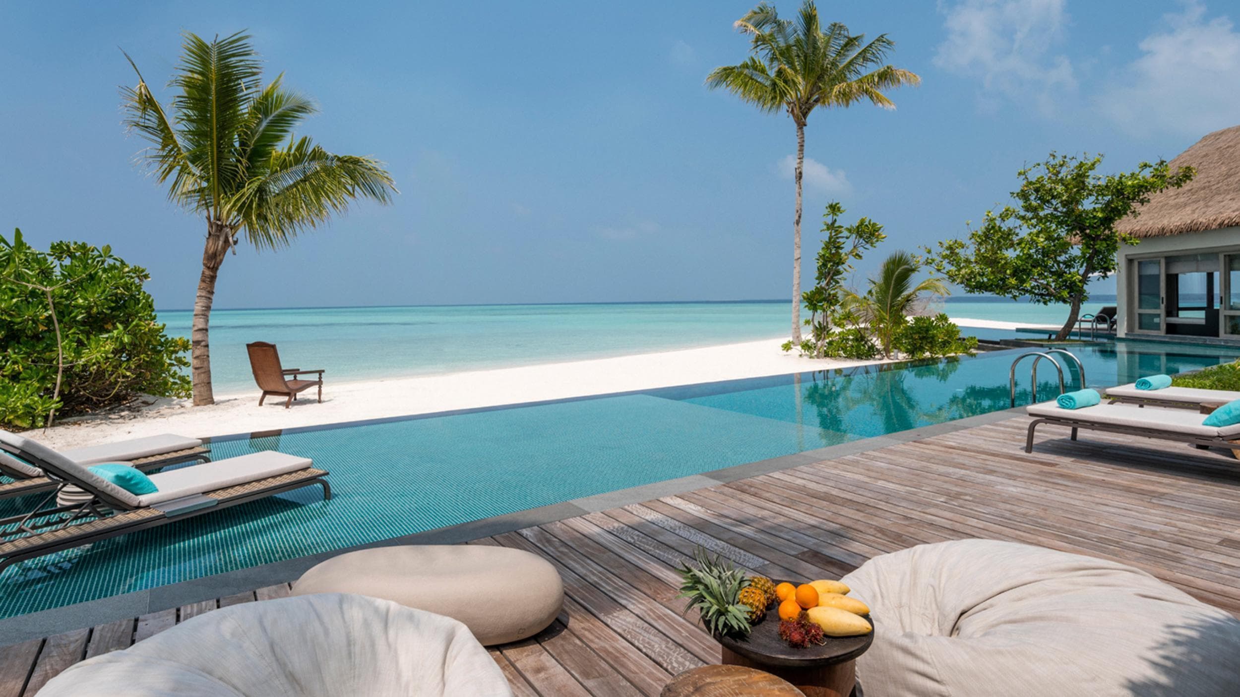 Beach villa 3-bedroom (1077 кв.м): 4 террасы, обеденная зона на открытом воздухе, открытый бассейн, гостиная с обеденной и кухонной зоной, кабинет (который может быть переоборудован в спальню для детей), 3 спальни с кроватью king-size, 4 ванные комнаты (три - с ванной, душевой кабиной и душем на открытом воздухе, четвертая - с душем), гостевой туалет. Расположена на пляже в северной части острова. Вид на пляж и океан.