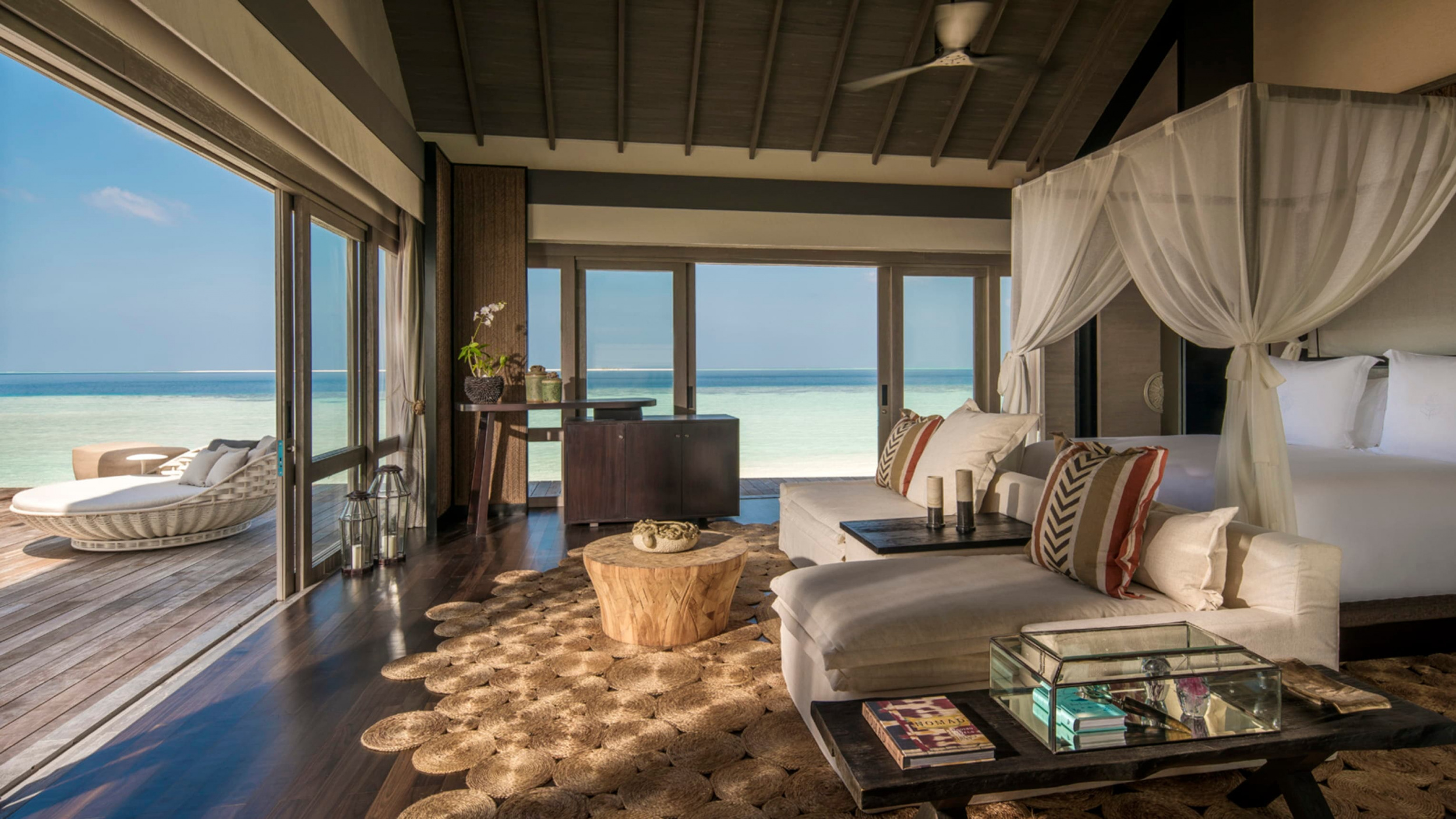 Water villa 2-bedroom (553 кв.м): 3 террасы, обеденная зона на открытом воздухе, открытый бассейн, гостиная с обеденной и кухонной зоной, кабинет (который может быть переоборудован в спальню для детей), 2 спальни с кроватью king-size, 3 ванные комнаты (одна - с ванной, душевой кабиной и душем на открытом воздухе, вторая - с ванной и душевой кабиной, третья - с душем), гостевой туалет. Расположена на сваях над водой в юго-западной части острова. Вид на лагуну и океан.