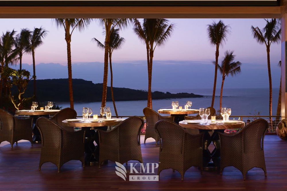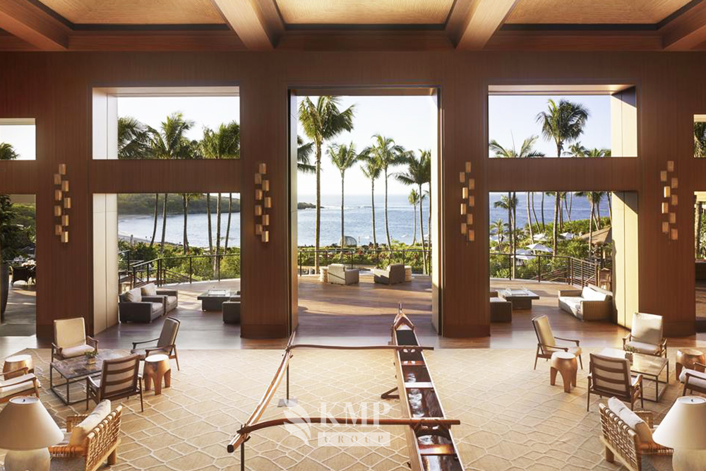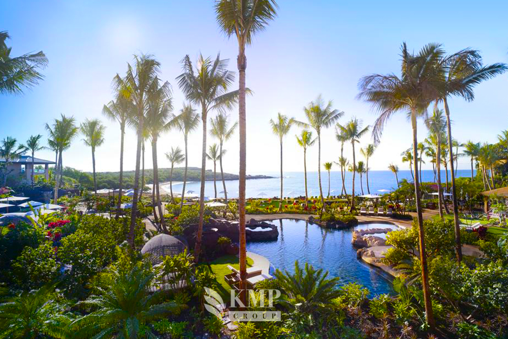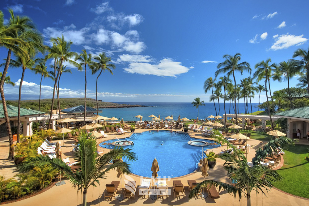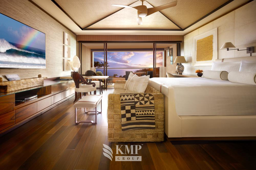 Hulopo’e suite (165 кв. м). Балкон (34 кв. м), гостиная с обеденной зоной (стол на 6 персон), кладовая, спальня с кроватью king-size, гардеробная, ванная комната с ванной и отдельной душевой кабиной, гостевой туалет. Дополнительно: факс, телевизор в ванной комнате. Расположен на 2 этаже. Панорамный вид на океан. Возможно присоединение трех дополнительных спален.
