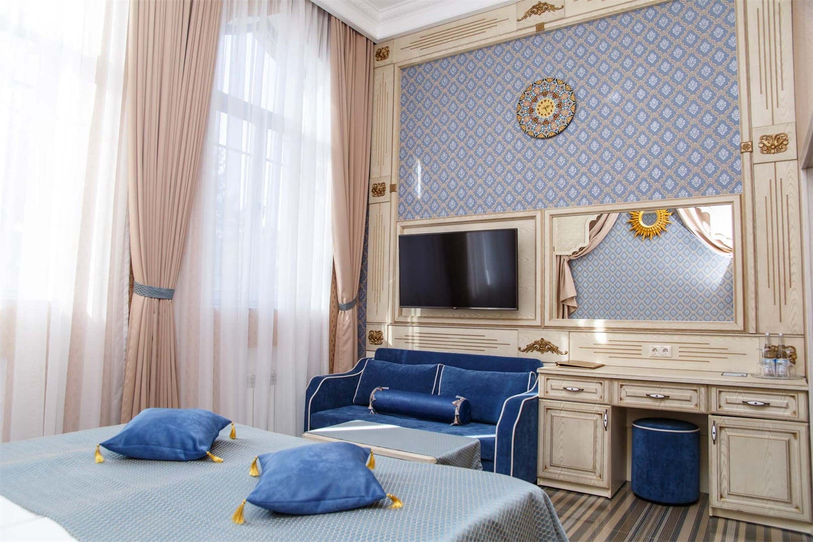 В отеле работает ресторан, предоставляются услуги консьержа и бесплатный Wi-Fi. Осуществляется доставка еды и напитков в номер. В санатории есть крытый бассейн, фитнес-центр, вечерняя развлекательная программа и круглосуточная стойка регистрации. Главная станция «Важное жанное жанное» специализируется на сердечно-сосудистых заболеваниях, скелетах и нерологических заболеваниях.