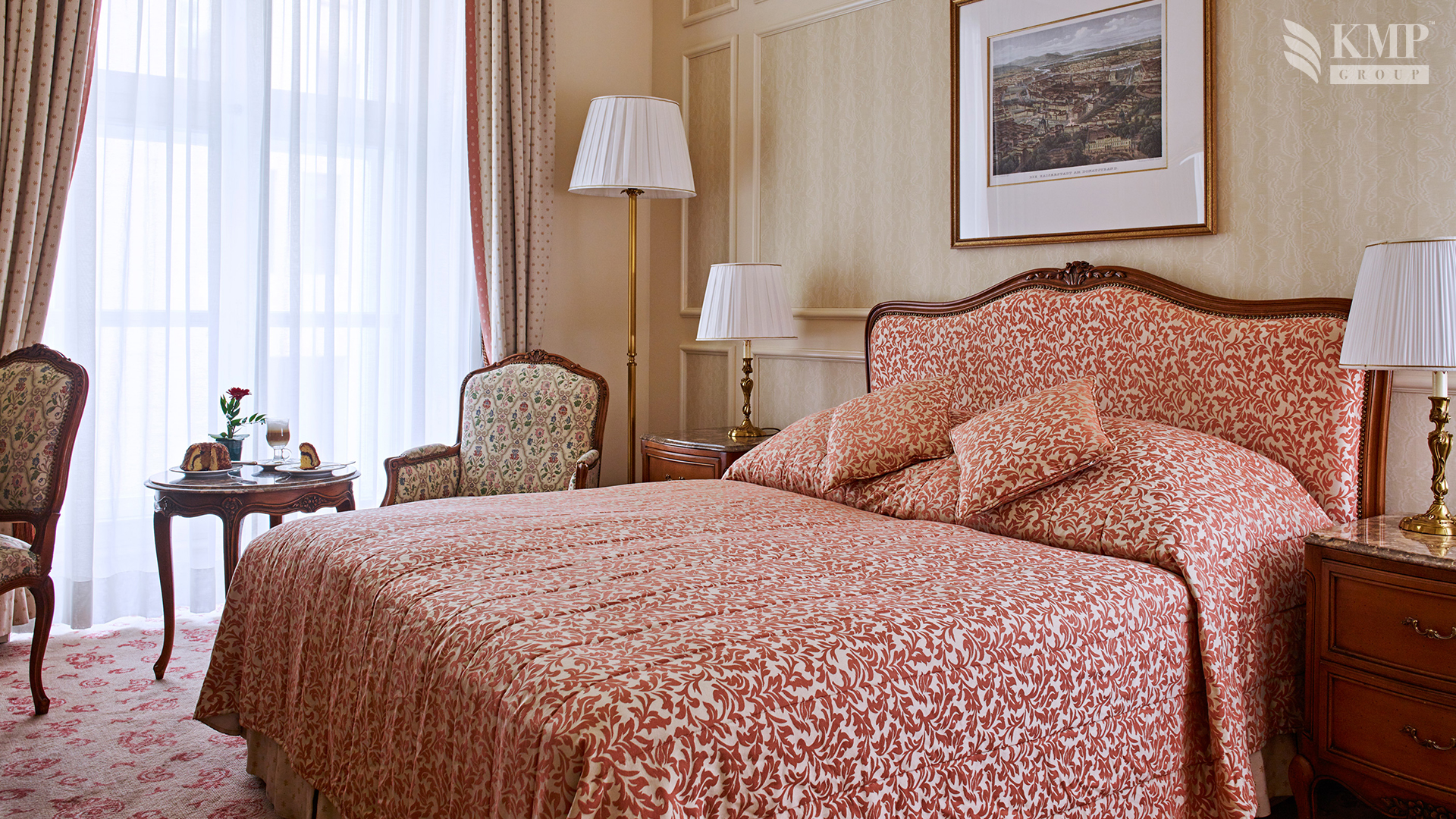 Deluxe Suite (130 кв. м). Балкон, просторная гостиная с обеденной зоной, кухня, спальня с кроватью размером king-size или двумя отдельными кроватями, гардеробная, ванная комната с джакузи и душевой. Из окон видно улицу Рингштрассе.