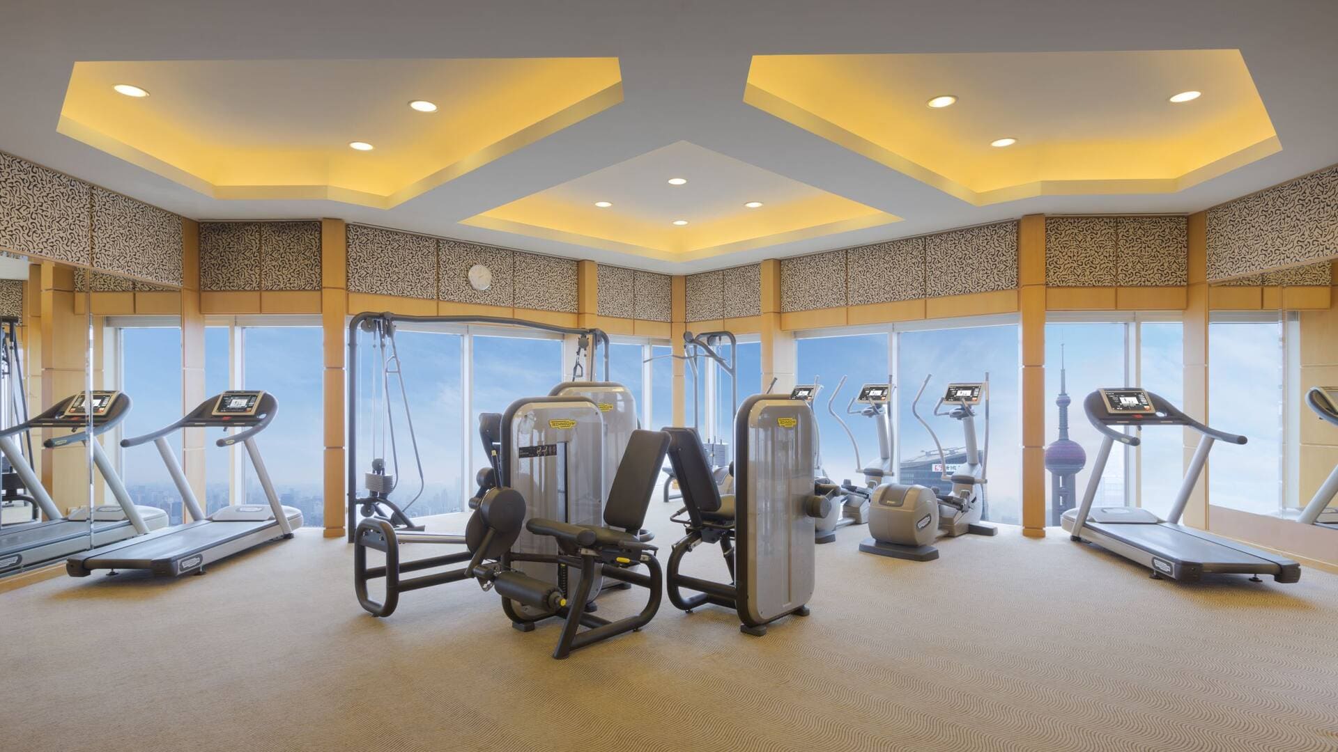 Grand room (40 кв. м). Спальня с кроватью king-size, queen-size или двумя отдельными кроватями, ванная комната с ванной и отдельной душевой кабиной. Вид на небоскребы района Pudong.