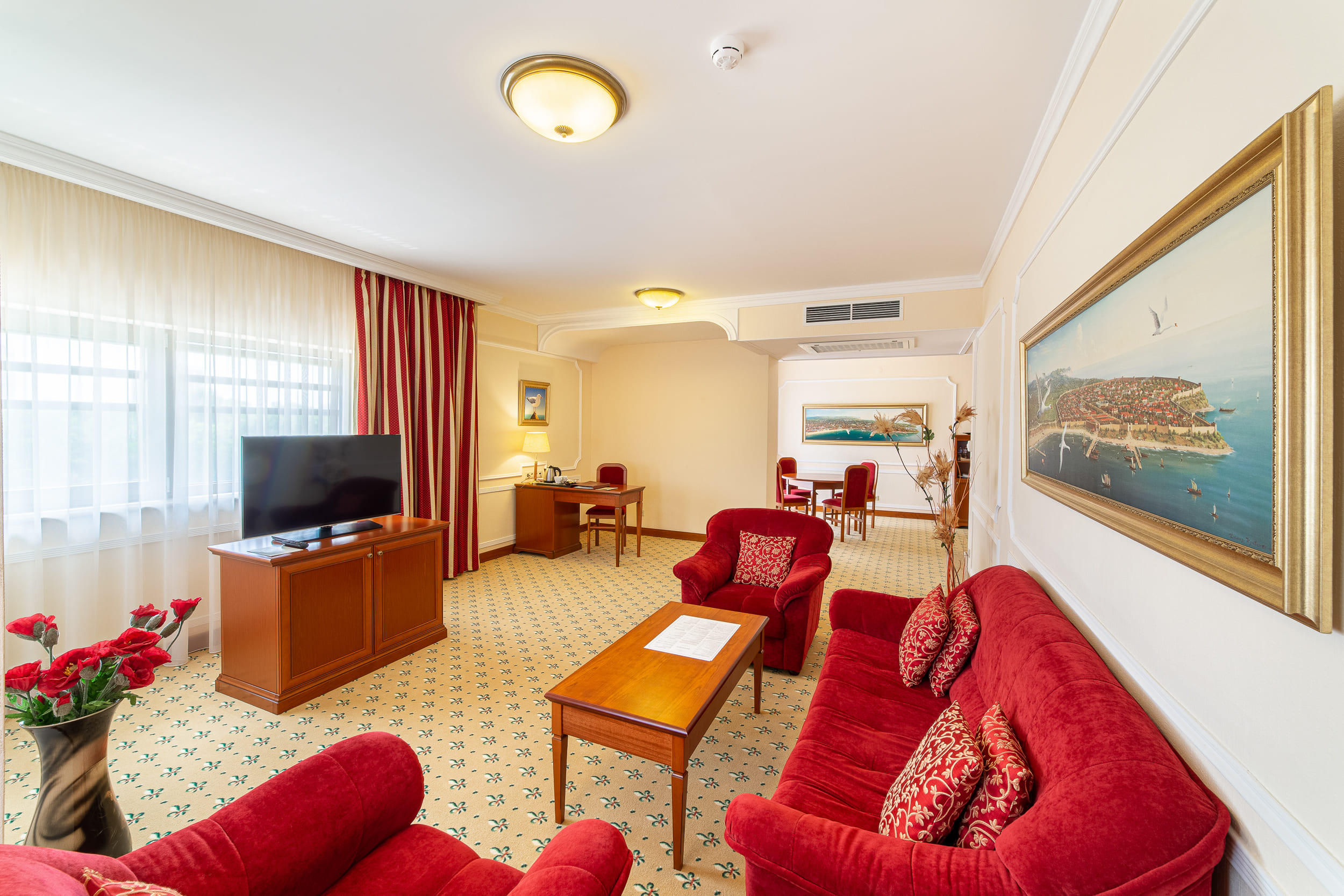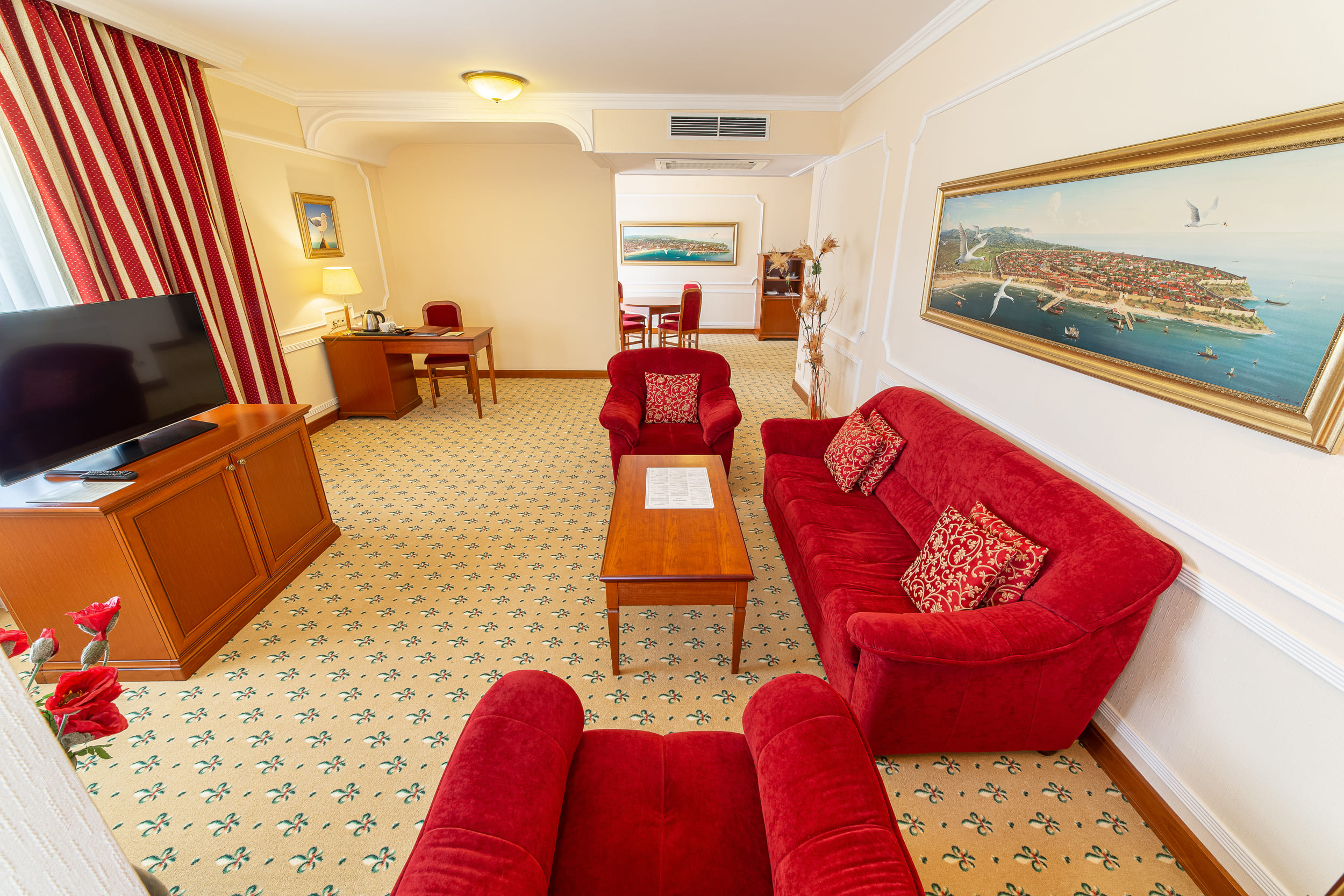 Suite Diplomat (68 кв.м.). Гостям предоставляется номер с балконом, состоящий из гостиной, спальни и столовой. Такой вариант идеален для отдыха всей семьей или большой компанией. Комплексное обслуживание в номерах поможет вам решить любые задачи и ни о чем не заботиться на отдыхе. За обеденным столом вы сможете насладиться изысканной европейской кухней, в гостиной есть все для Вашего комфортного отдыха, а спальня — гарантия крепкого сна, тишины и покоя. Гранд Отель Валентина в Анапе сделает Ваш отдых в Анапе незабываемым. Бронируя номер в Гранд Отеле Валентина закажите трансфер и мы встретим Вас в назначенное время!