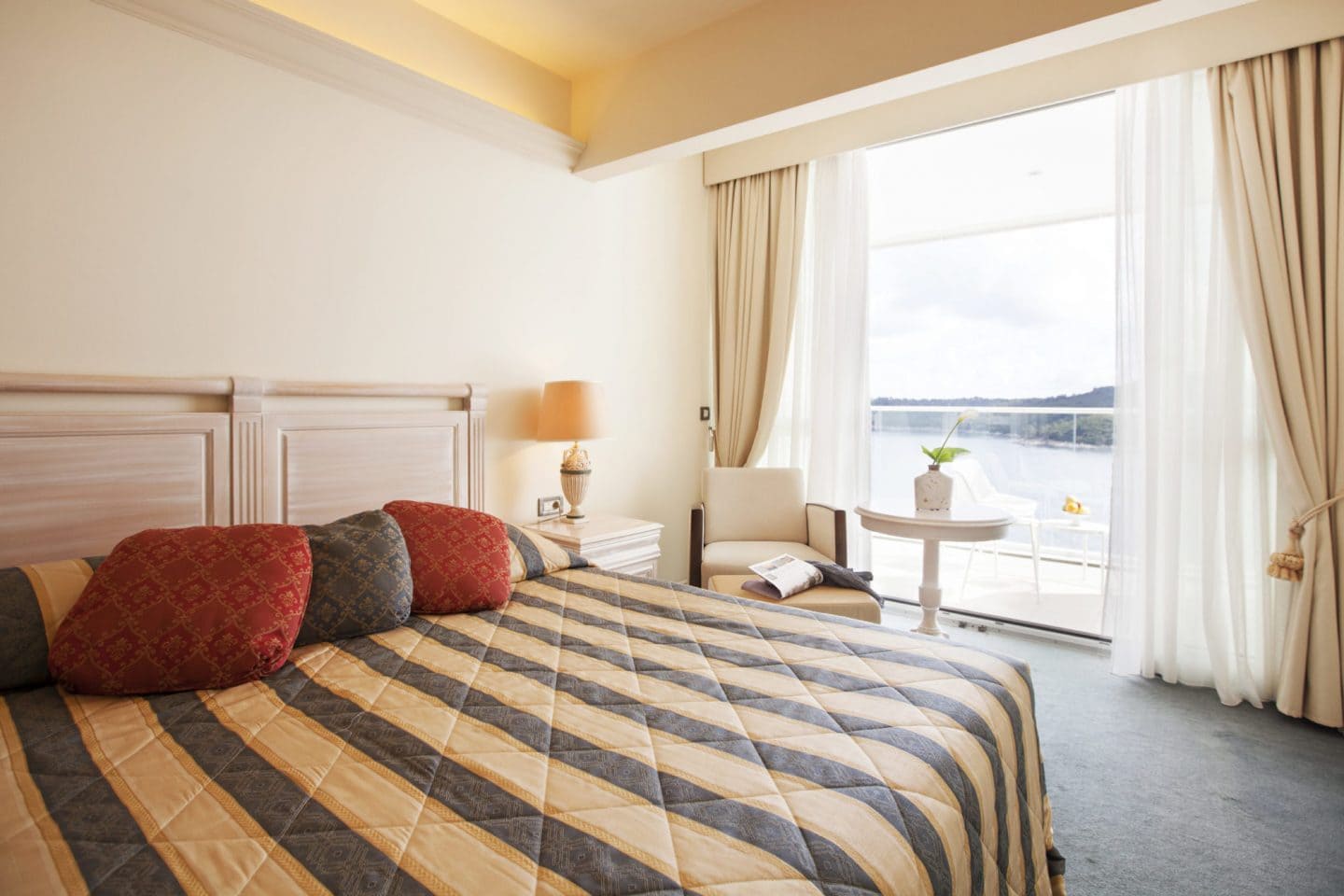 Standard room (Villa Orsula / Villa Argentina): спальня, ванная комната с ванной и душевой кабиной. Вид на курорт.