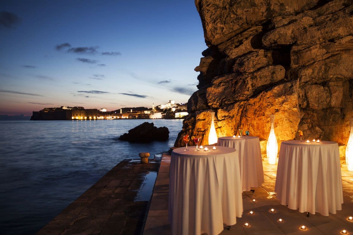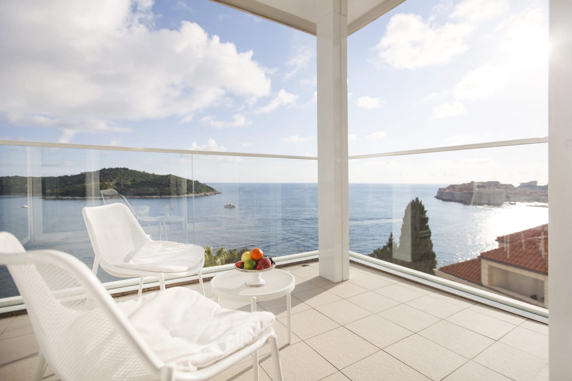 Standard room sea view with balcony (Villa Orsula / Villa Argentina): балкон, спальня, ванная комната с ванной или душевой кабиной. Вид на море, острова и Старый город Дубровника.