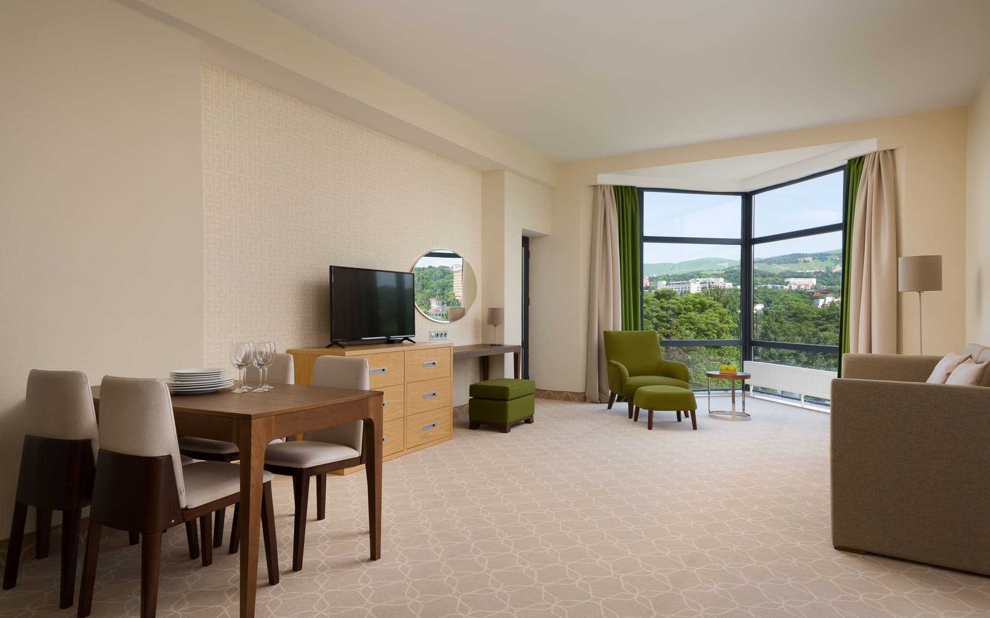 Трехкомнатные аппартаменты (90 кв. м). Спальня с одной кроватью king size. Двухспальная кровать, телефон, сейф, мини бар, чайный набор, высокоскоростной бесплатный WI-FI, интерактивное TV, индивидуальная система климат контроля. В ванной комнате предоставляется набор полотенец, косметических принадлежностей, фен, банные халаты и тапочки. Спальня с двумя кроватями. Раздельные кровати, индивидуальная система климат контроля, рабочий стол, телефон, сейф, высокоскоростной проводной интернет и бесплатный WI-FI, интерактивное TV, мини бар, чайный набор. Ванная комната оборудована душевой кабиной, укомплектована набором полотенец, косметическими принадлежностями, феном, халатом и тапочками. Кухня-гостиная: LCD телевизор с экраном 44 дюйма, обеденный стол, 4 стула, большой диван раскладывающийся в кровать (дополнительное спальное место), кухонный гарнитур, кухонная посуда, холодильник, электрический чайник, варочная панель, посудомоечная машина, гладильная доска, утюг.