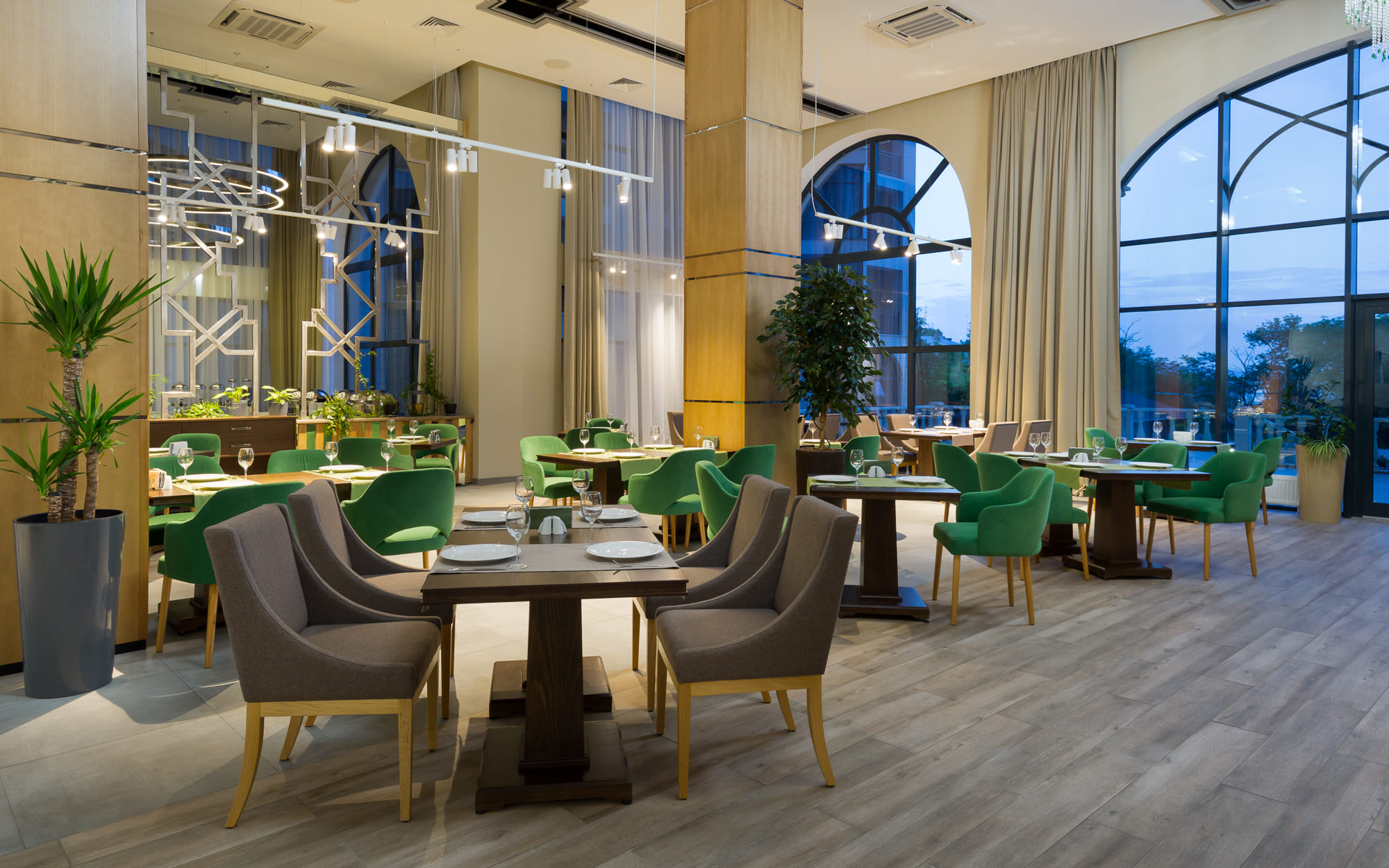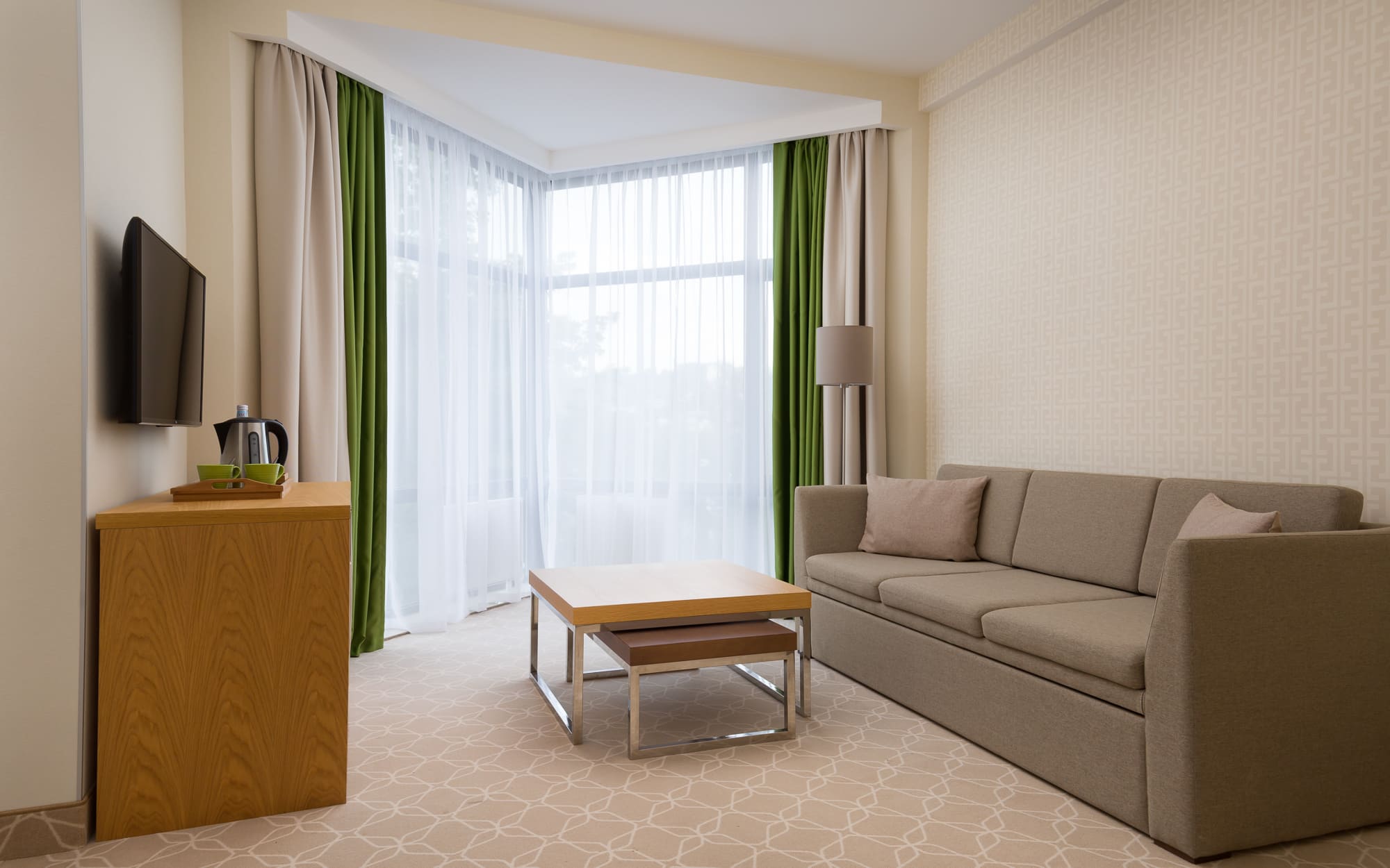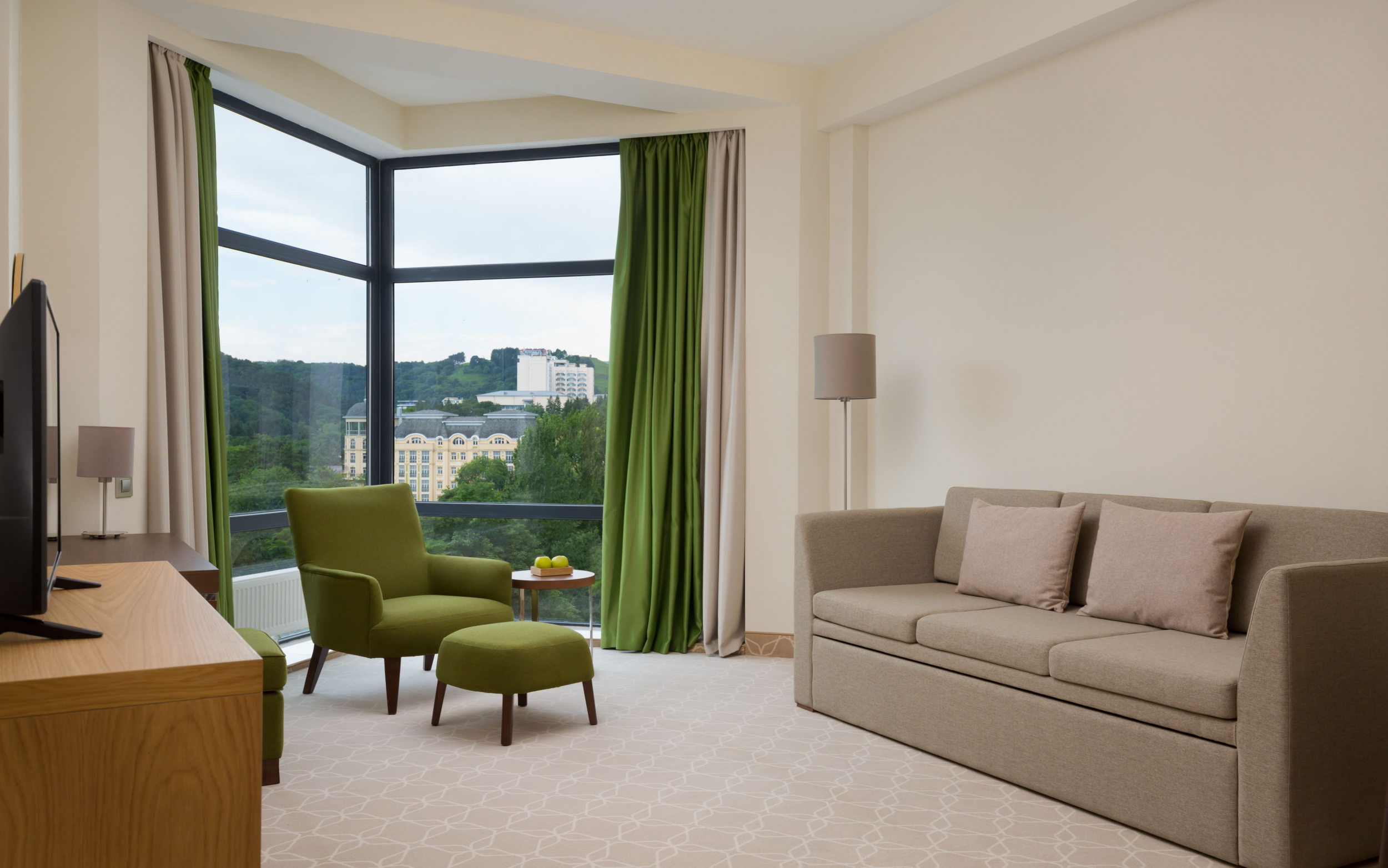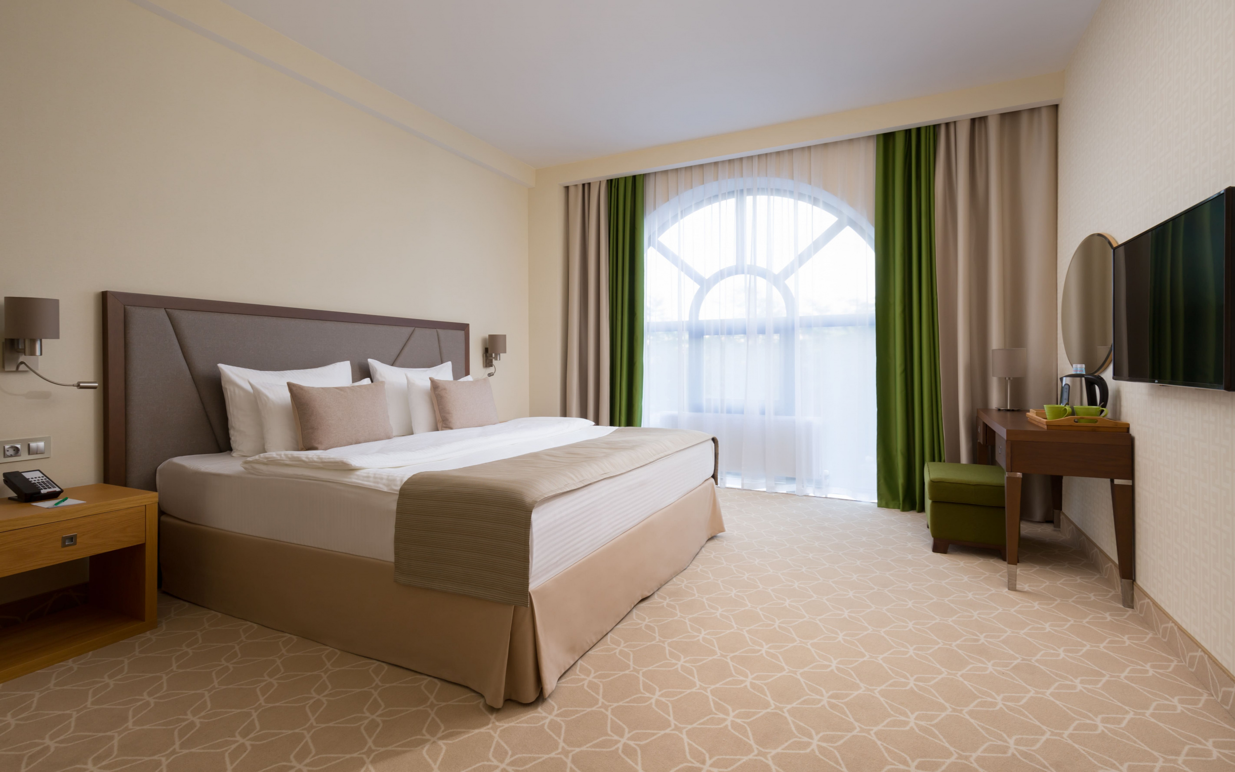 Люкс (54 кв. м). Номер с раздельными спальней и гостиной. Спальня с одной кроватью king size. Двухспальная кровать, телефон, сейф, мини бар, чайный набор, высокоскоростной бесплатный WI-FI, интерактивное TV, индивидуальная система климат контроля. В ванной комнате предоставляется набор полотенец, косметических принадлежностей, фен, банные халаты и тапочки. Кухня-гостиная: LCD телевизор с экраном 44 дюйма, обеденный стол, 4 стула, большой диван раскладывающийся в кровать (дополнительное спальное место), кухонный гарнитур, кухонная посуда, холодильник, электрический чайник, варочная панель, посудомоечная машина, гладильная доска, утюг.