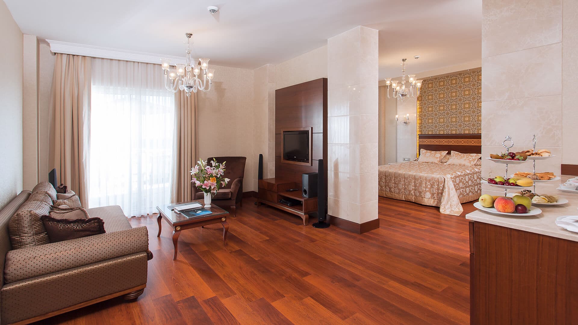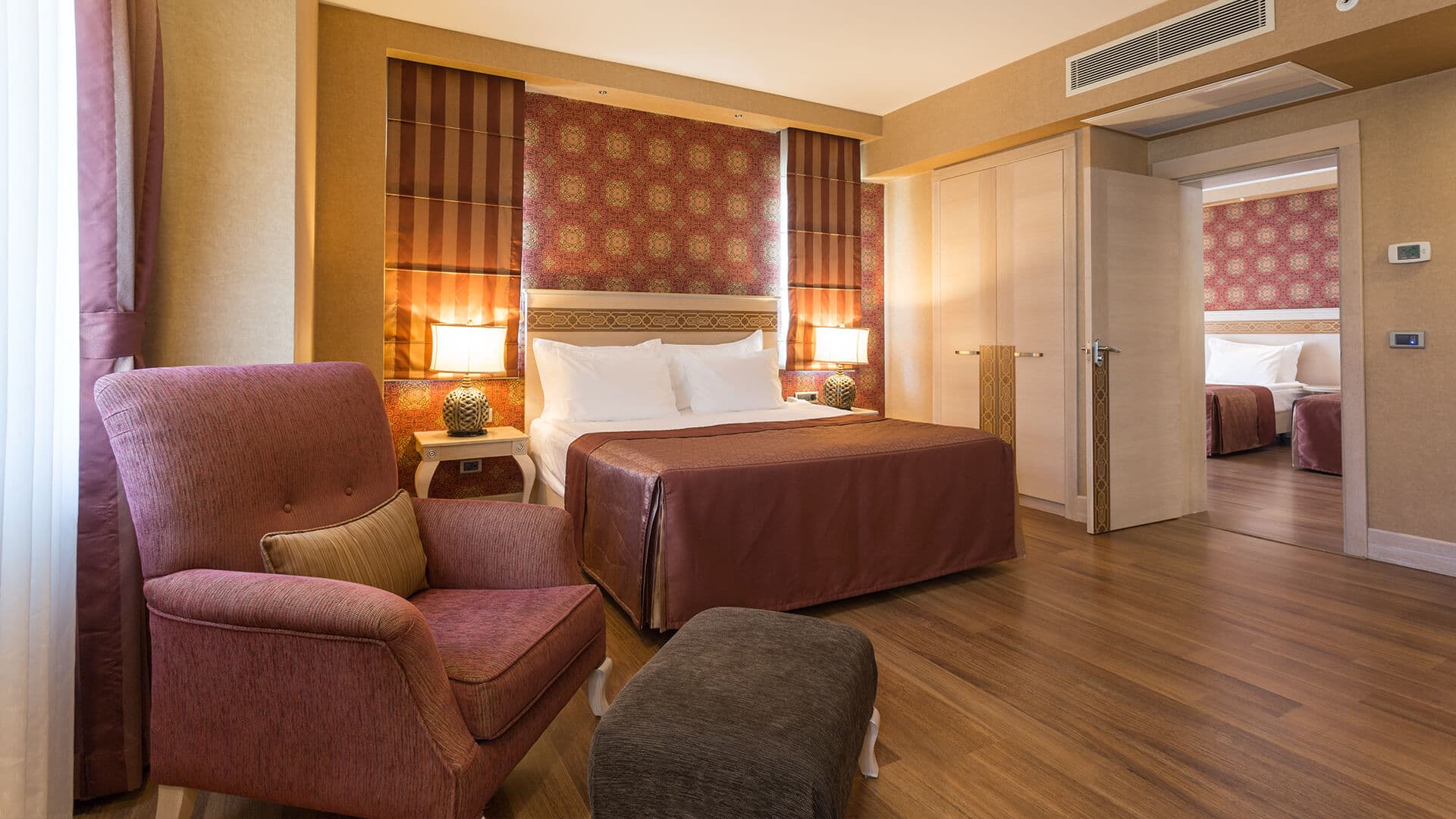 Deluxe room (55-90 кв. м): балкон, спальня, ванная комната с джакузи и душем.